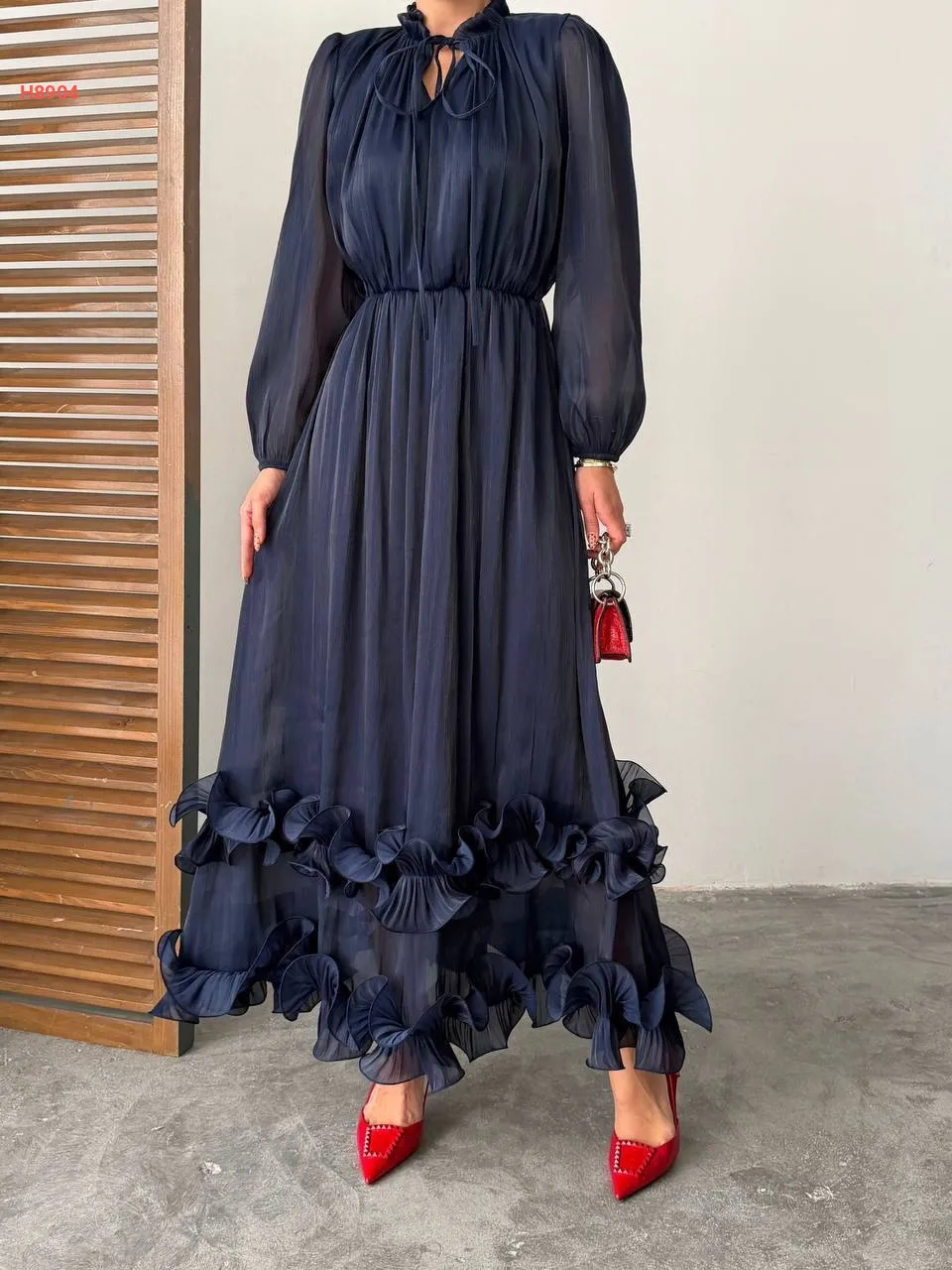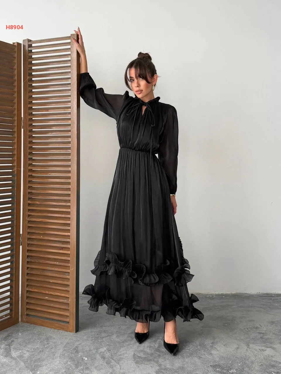 فستان طويل بتفاصيل كشكش وربطة