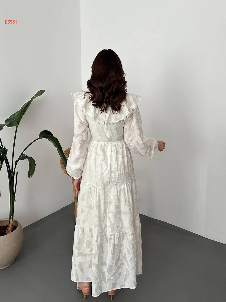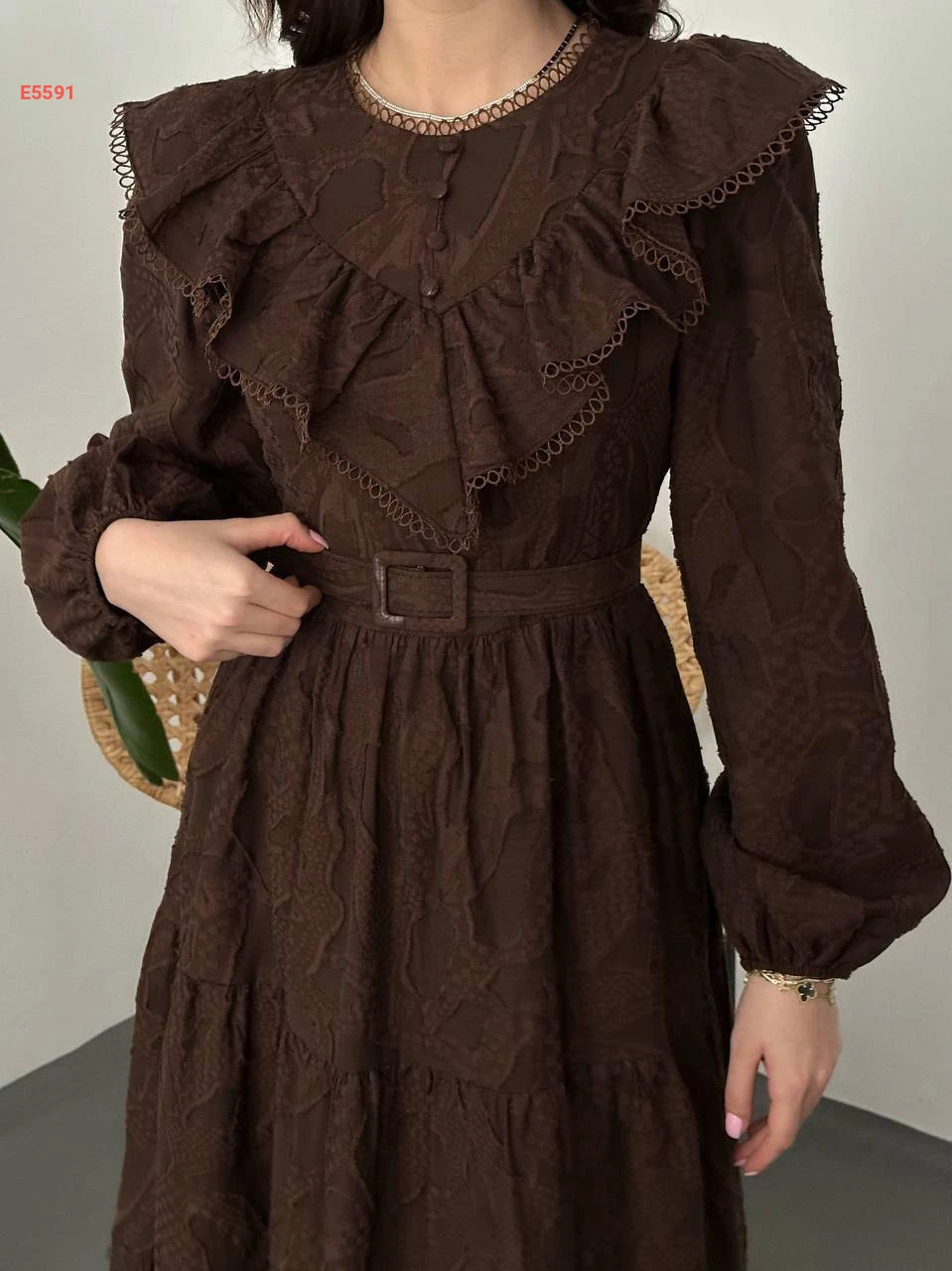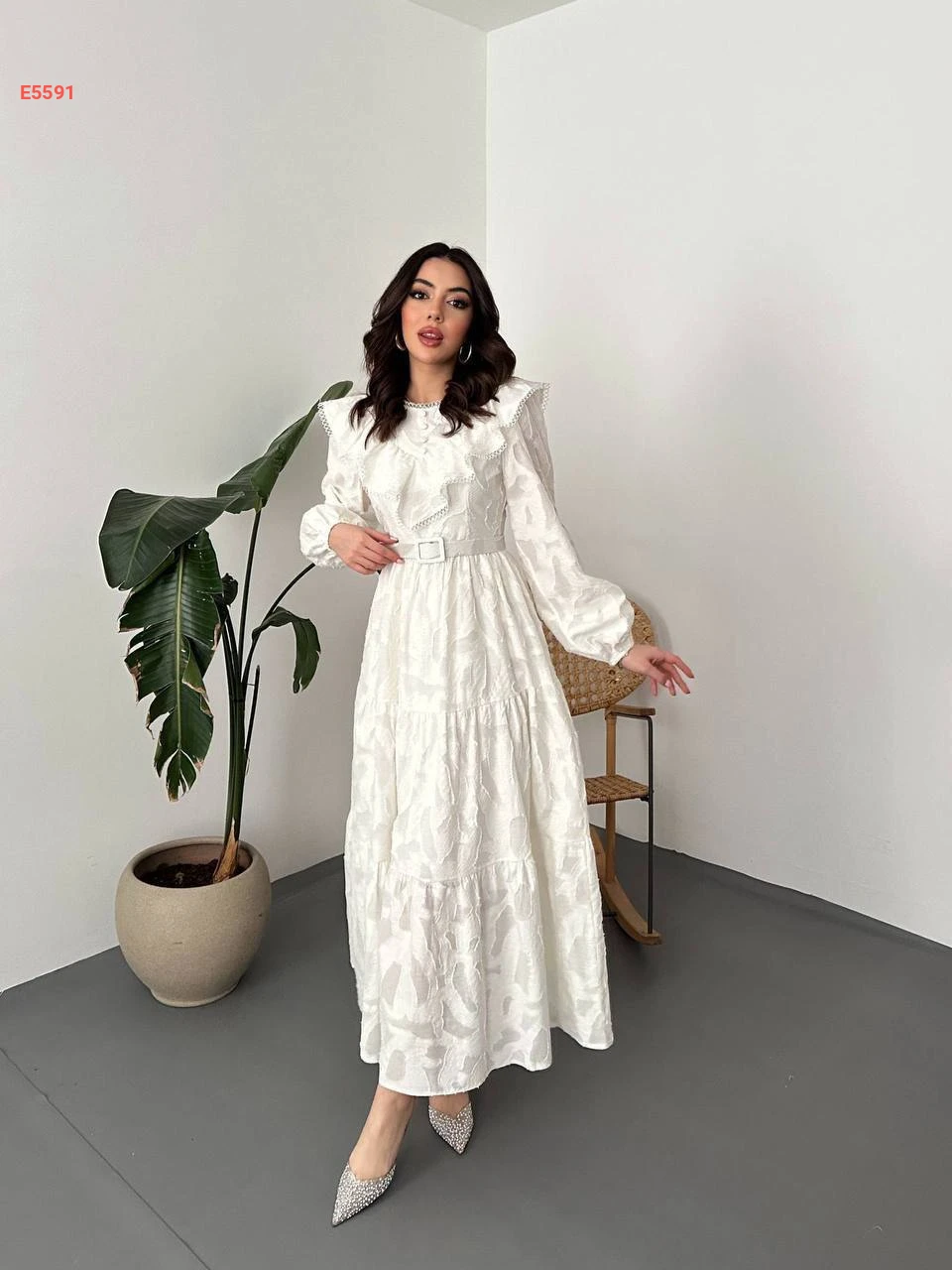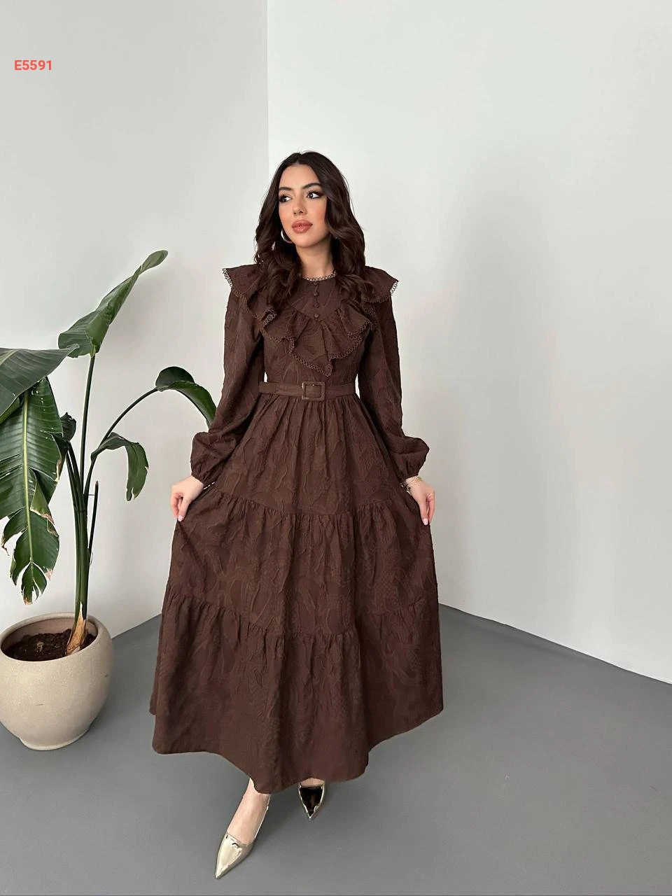 فستان طويل بتفاصيل كشكش وتطريز