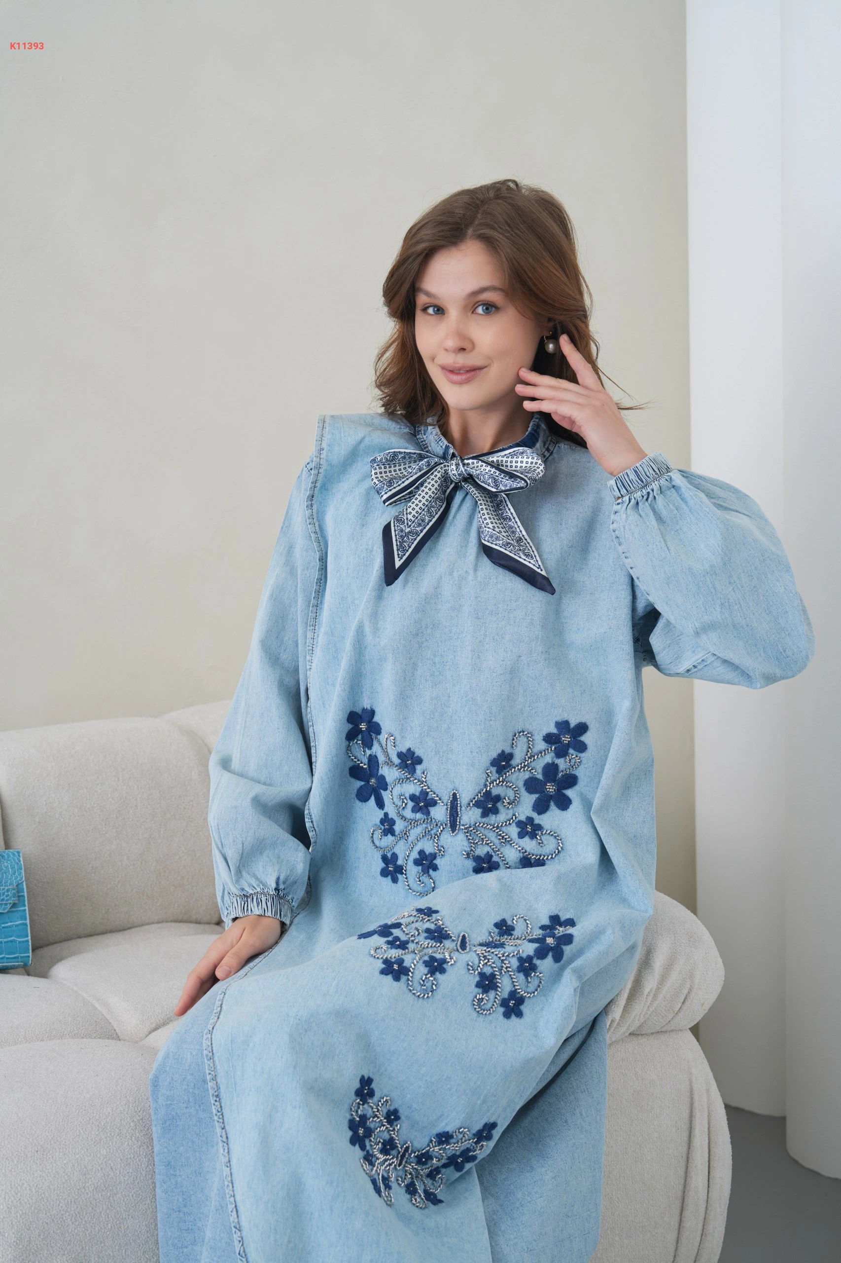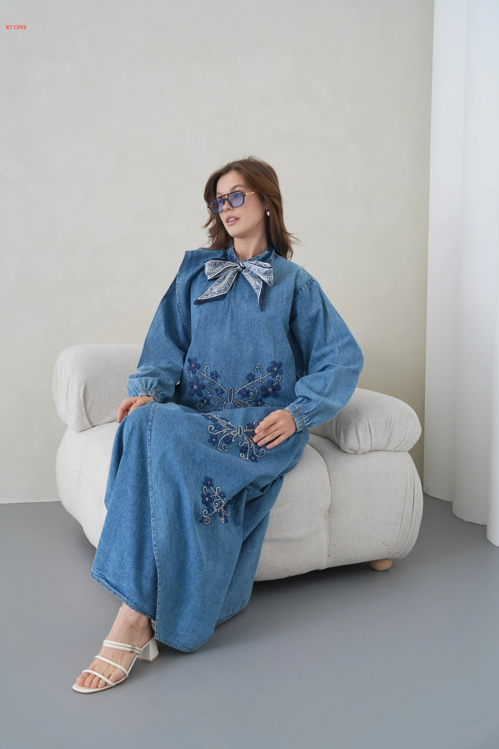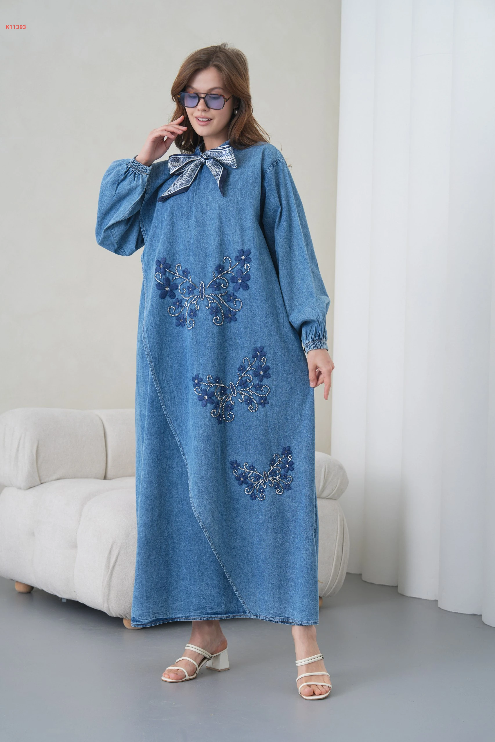 فستان جينز طويل مطرز مع فولار