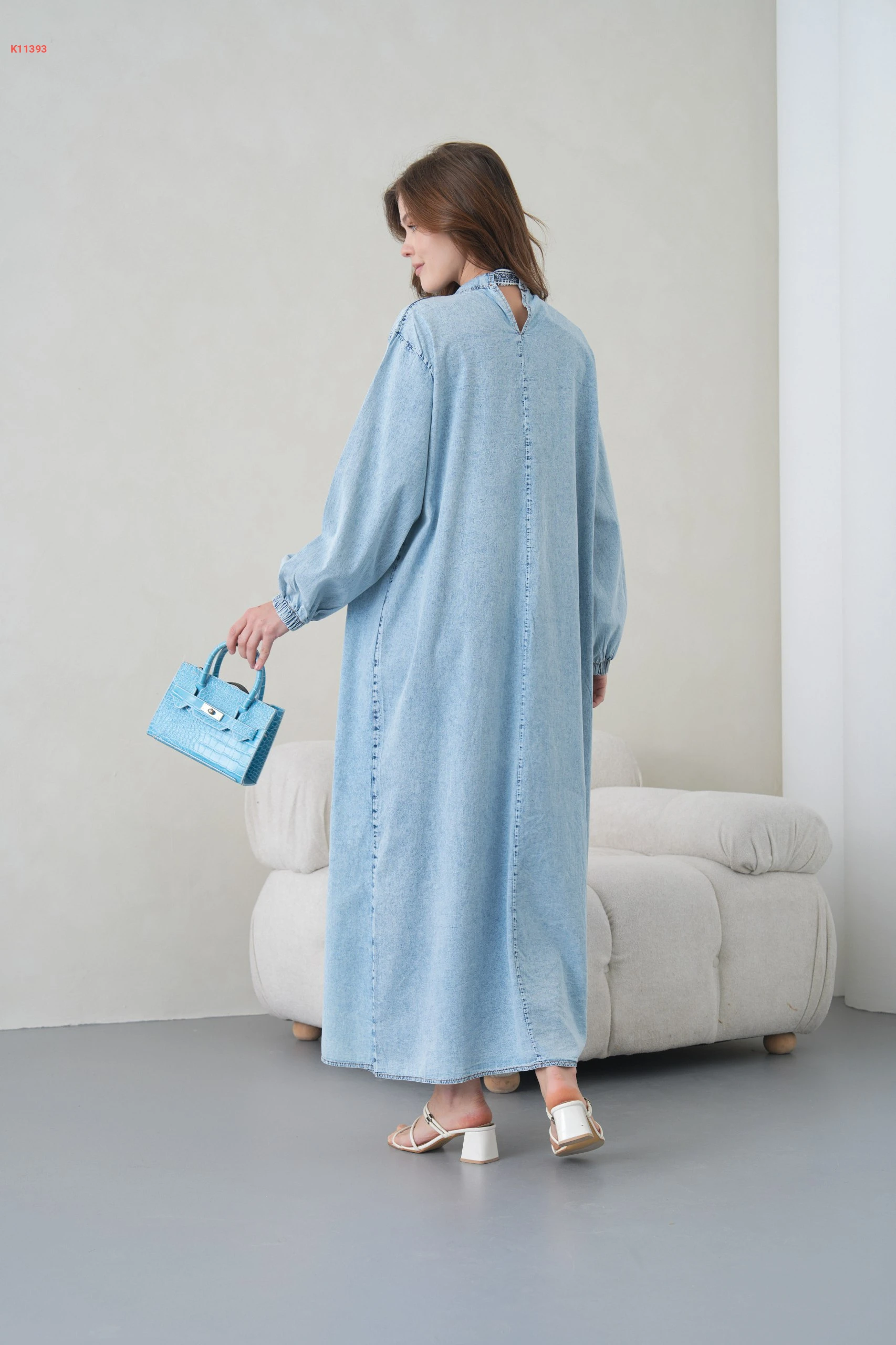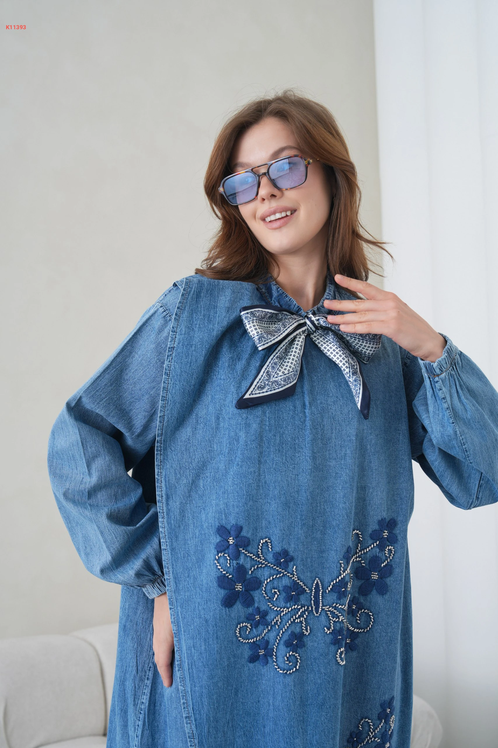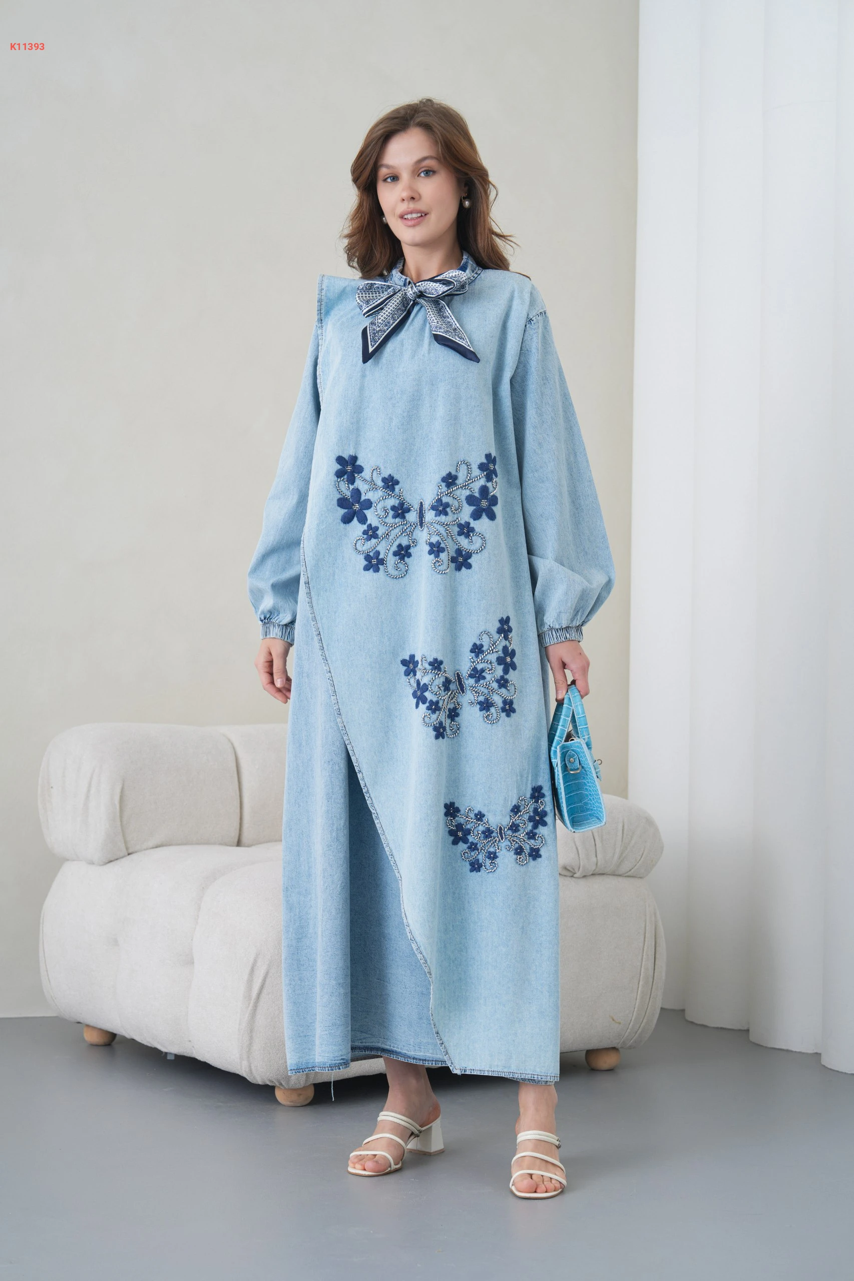 فستان جينز طويل مطرز مع فولار