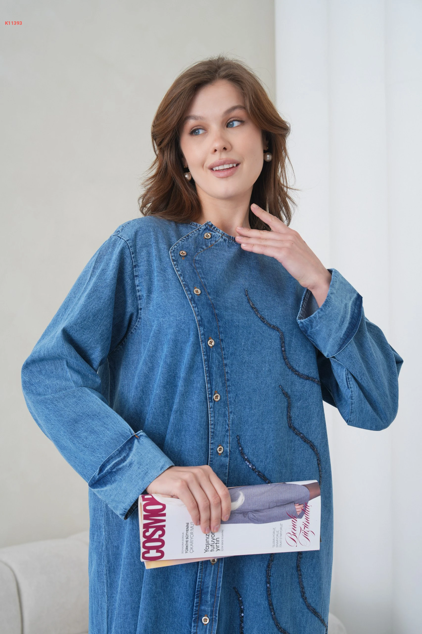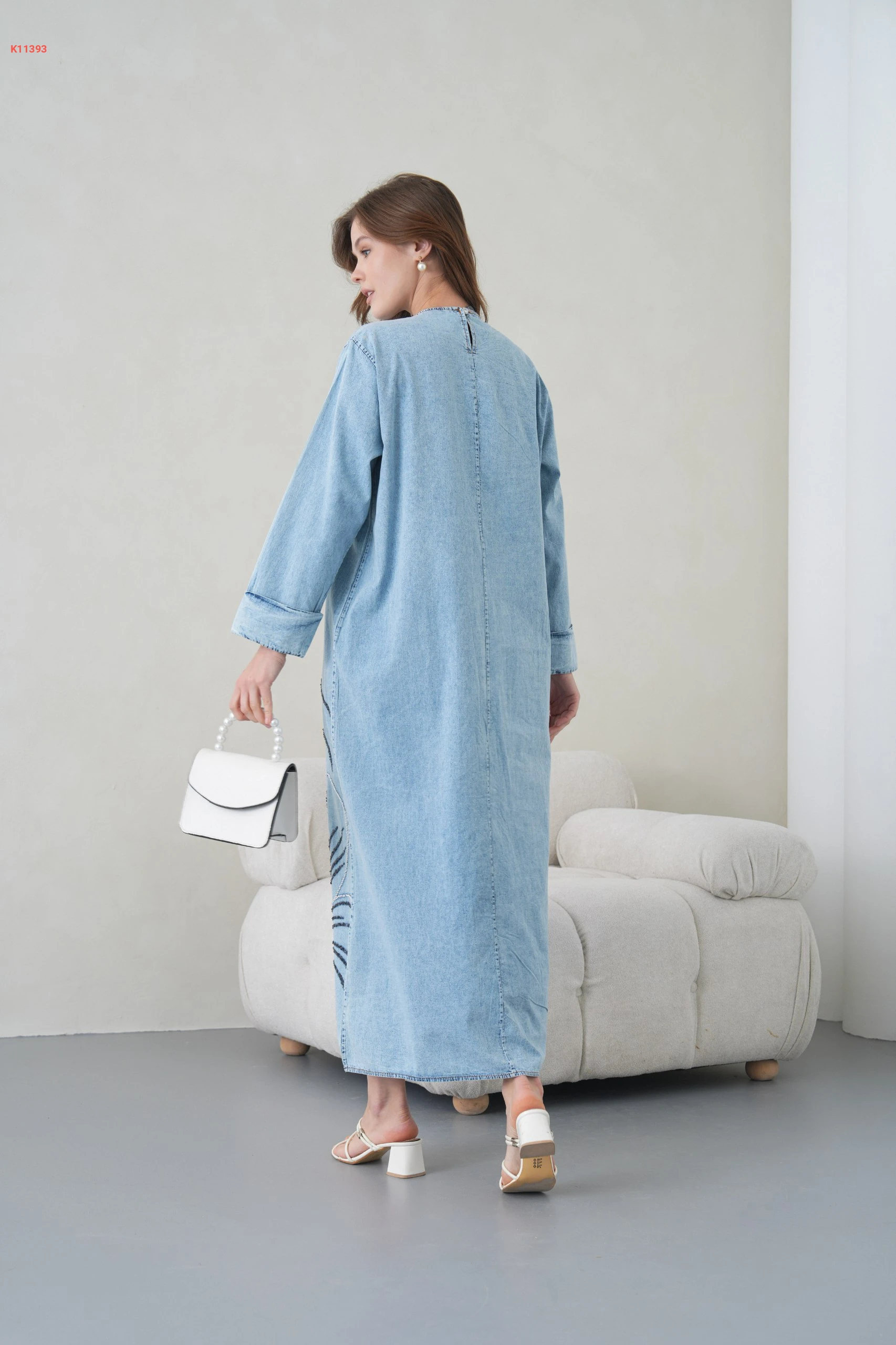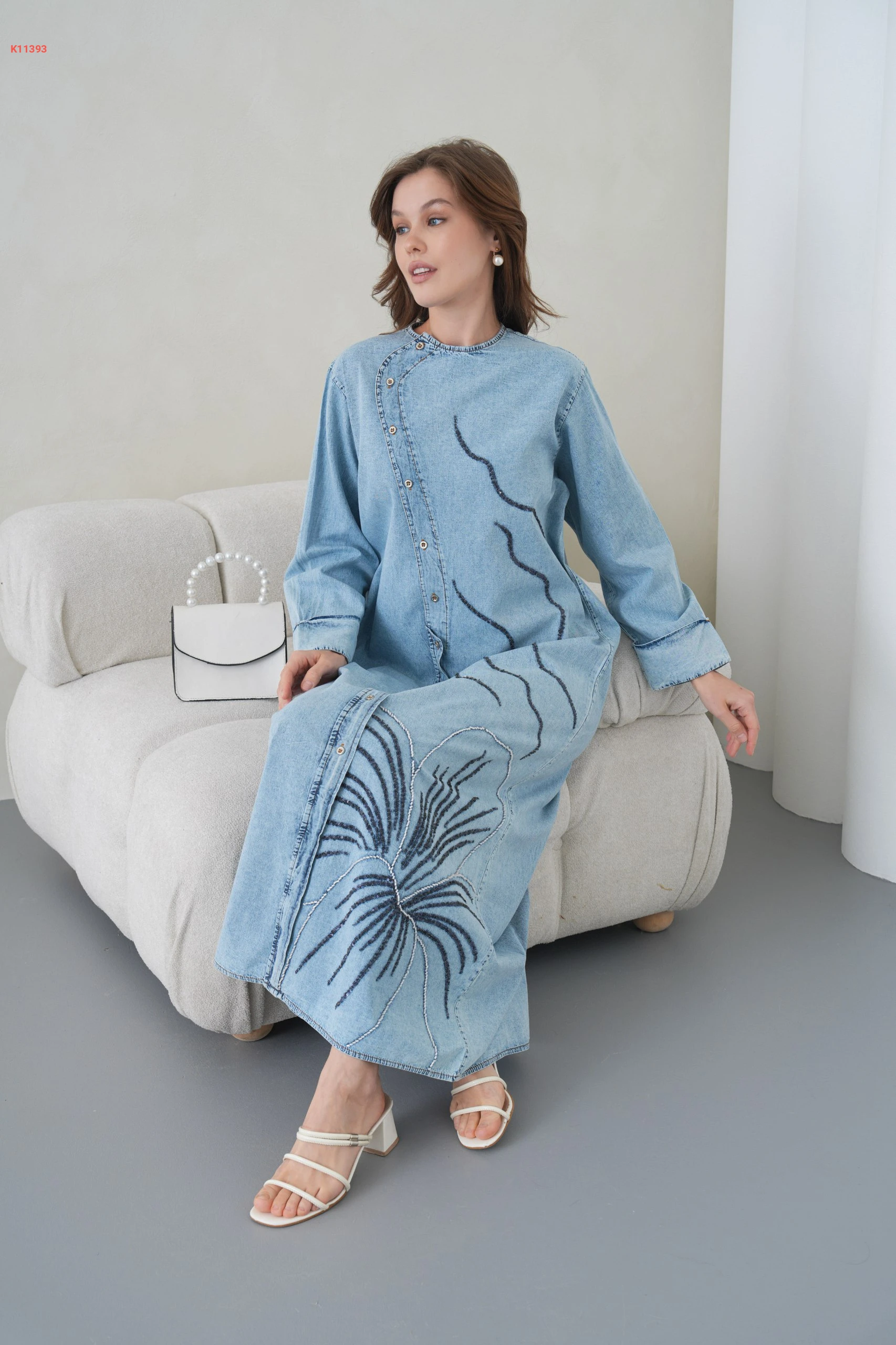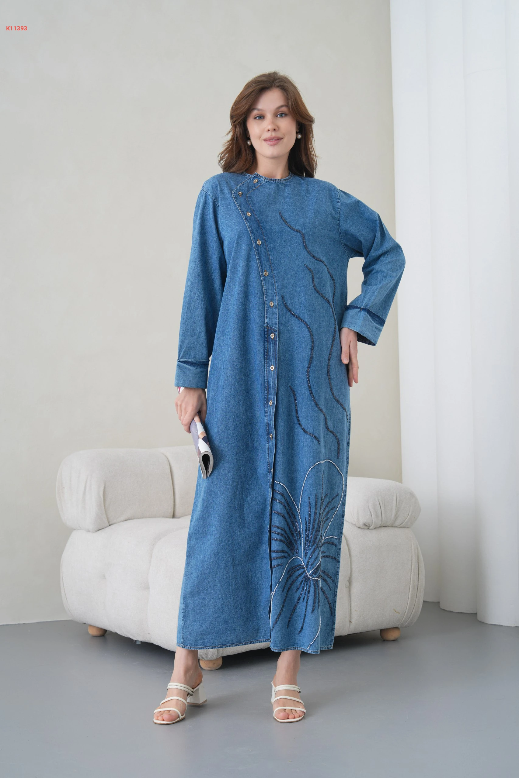 فستان جينز طويل مطرز بأزرار