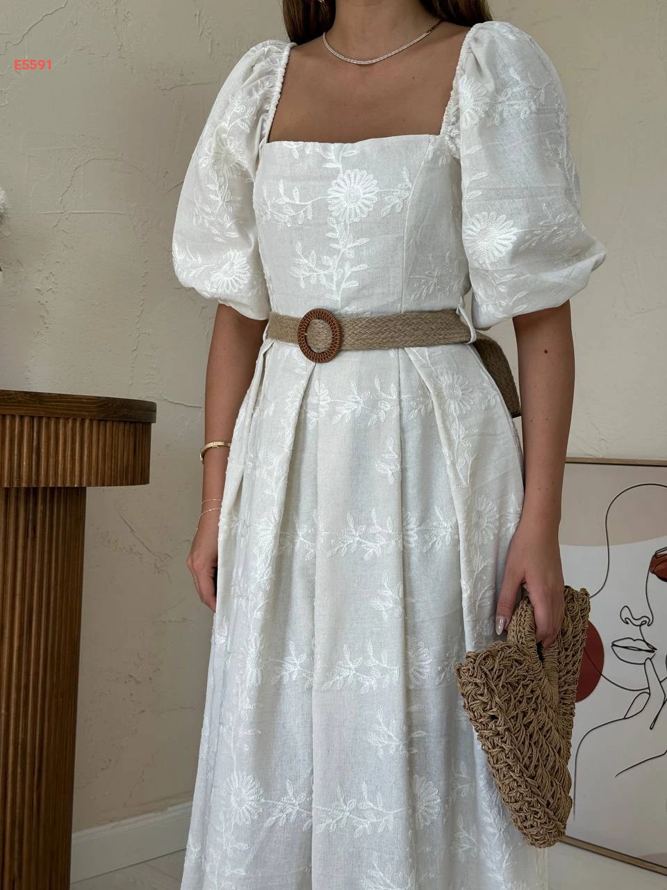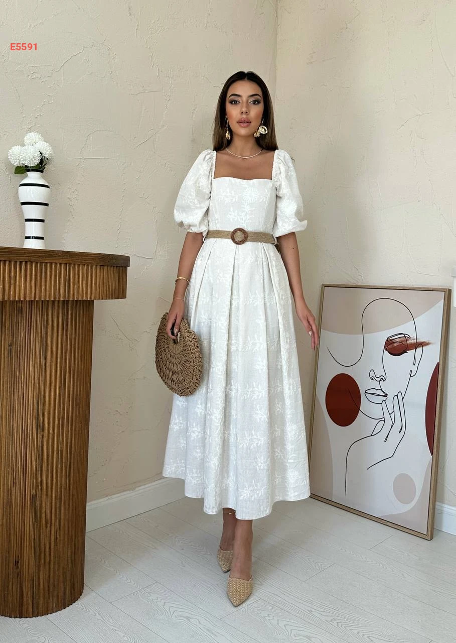 فستان طويل مطرز بأكمام نفخ قصيرة