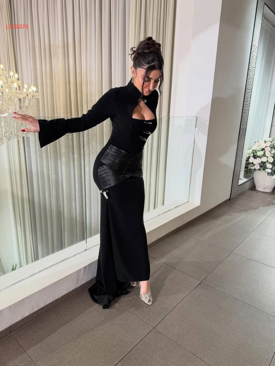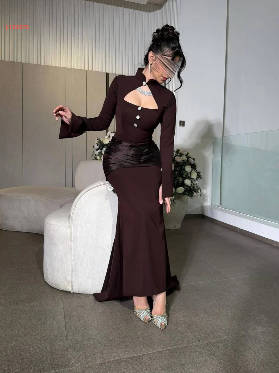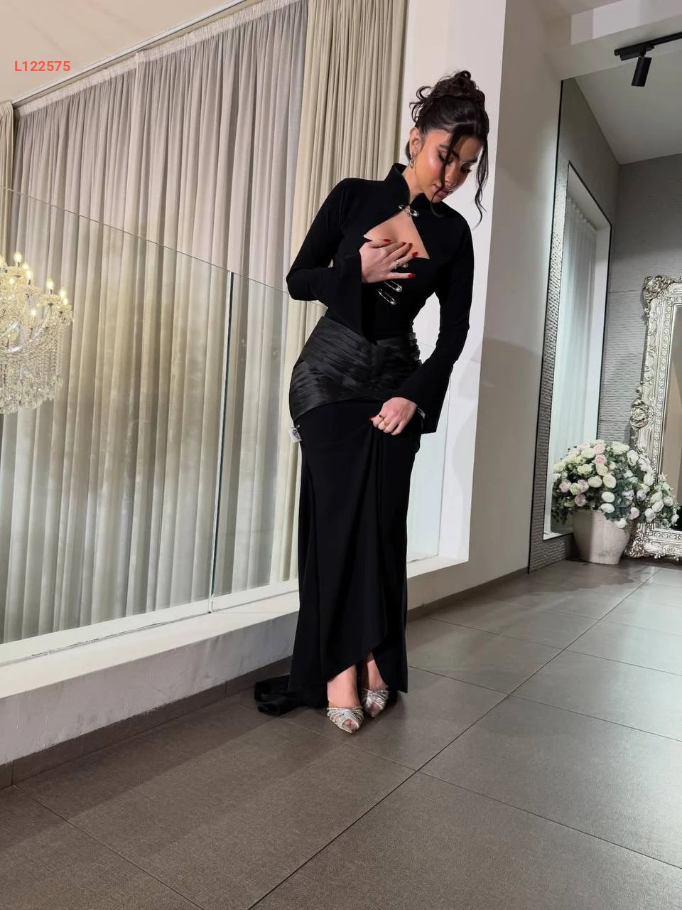 فستان سهرة طويل مع ساتان واكسسوار