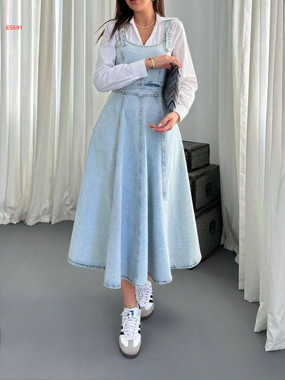 فستان جينز طويل كلوش بحمالات
