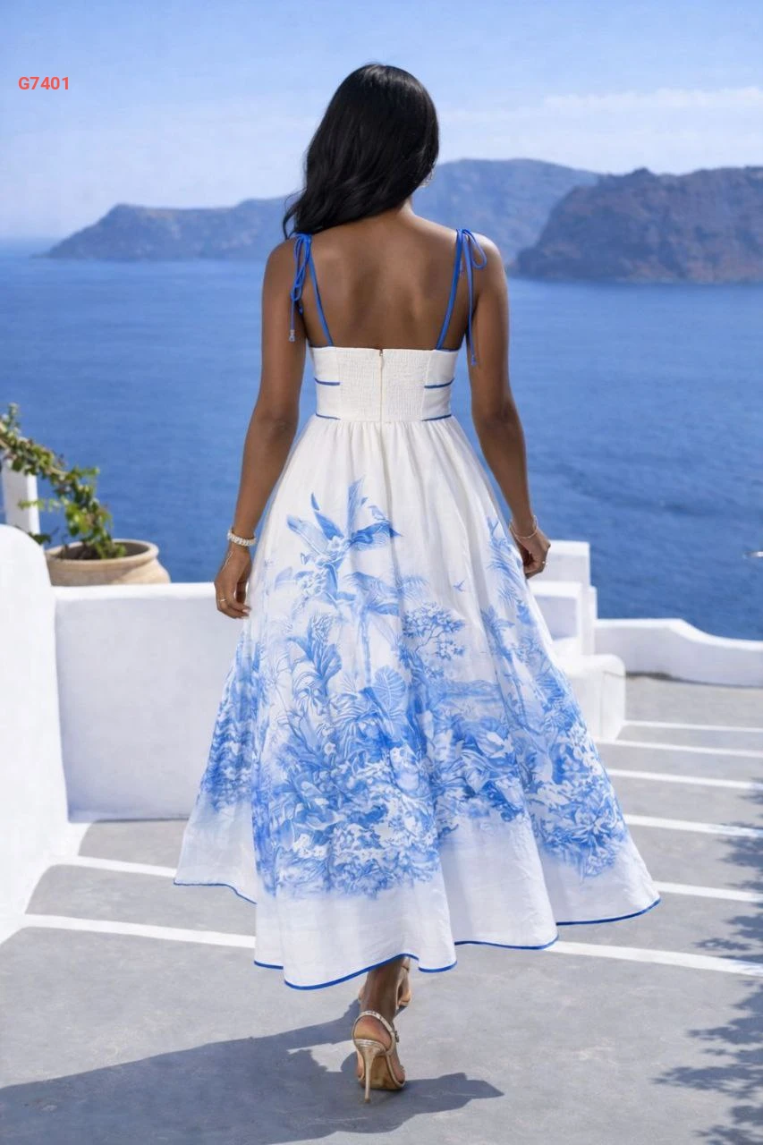 فستان طويل كلوش منقوش بحمالات رفيعة