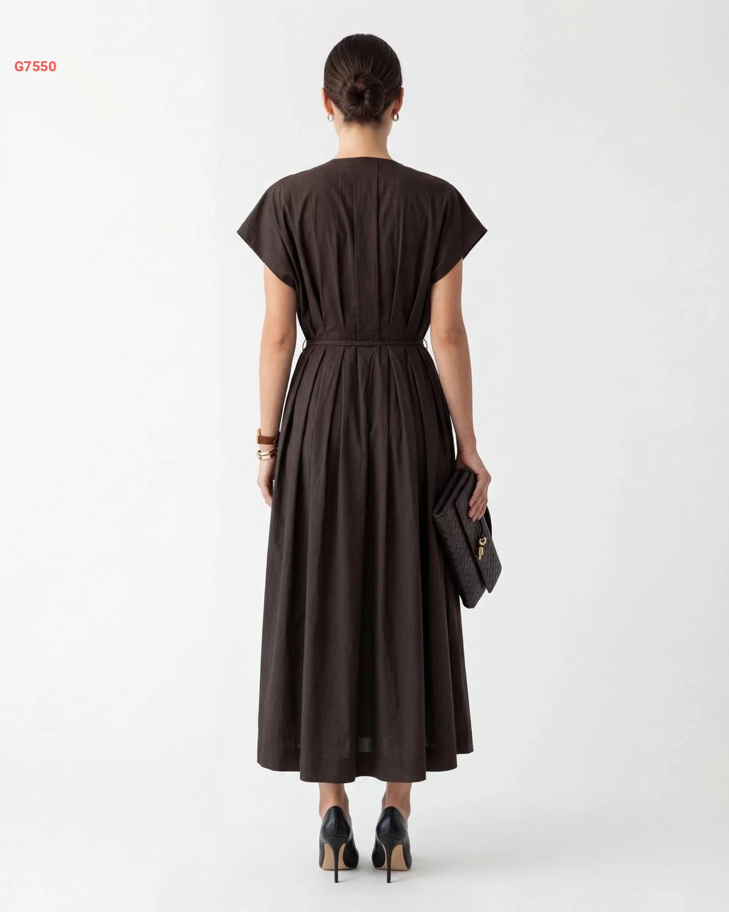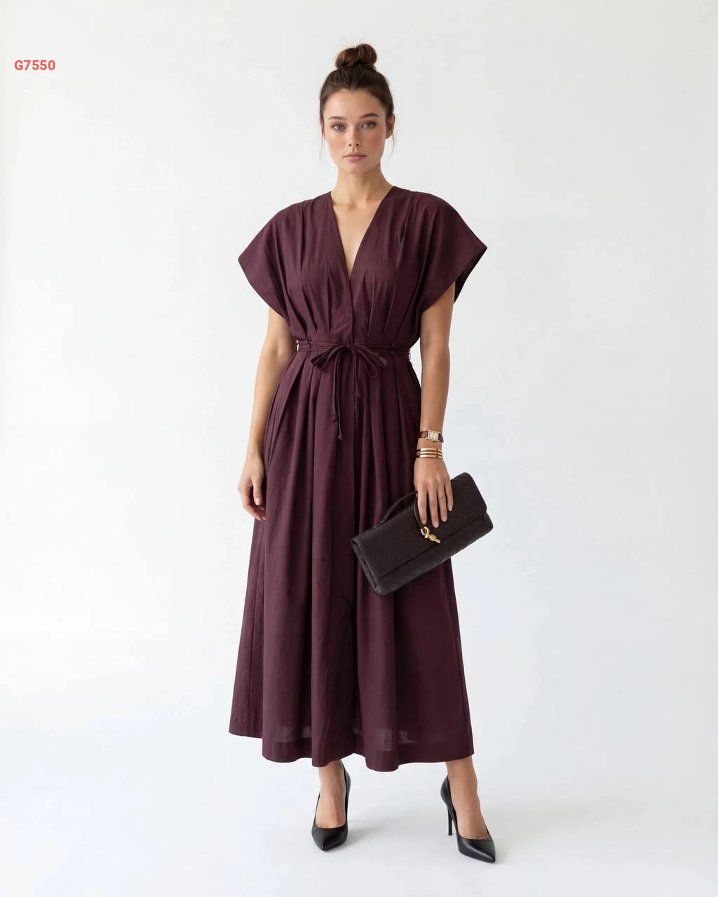 فستان صيفي طويل كلوش بزنار
