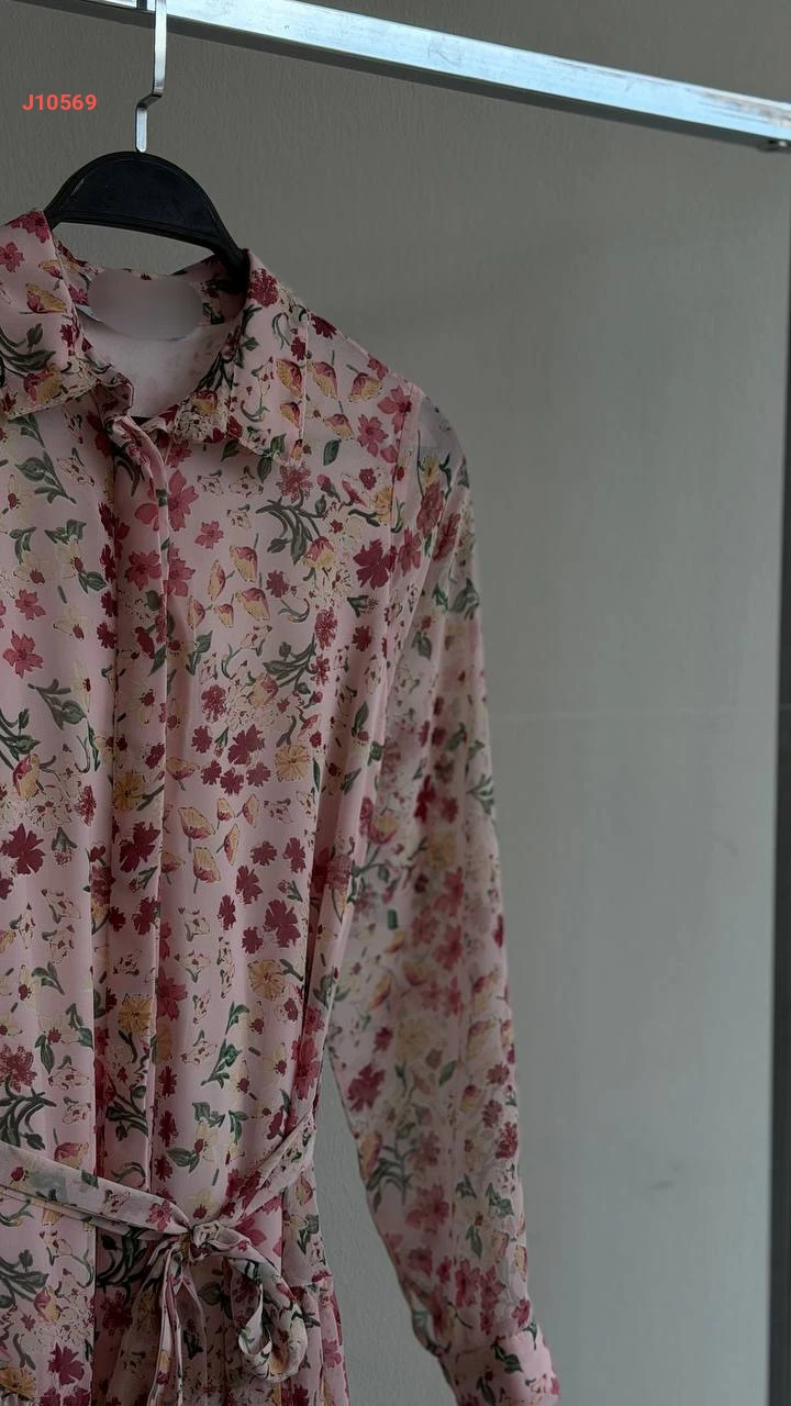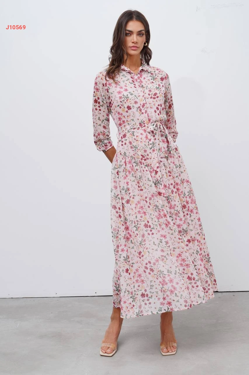 فستان طويل منقوش ورد بأزرار