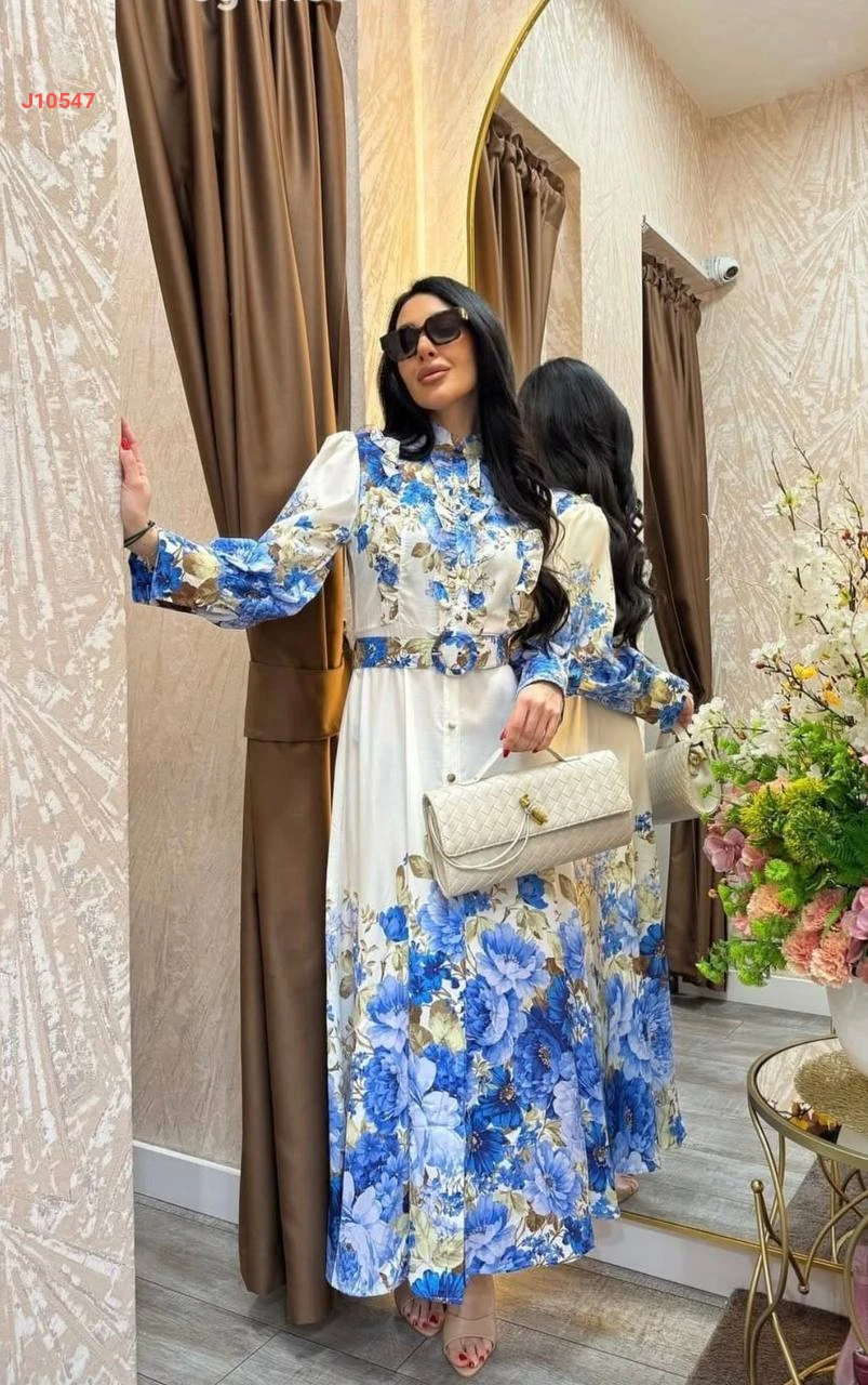 فستان طويل مورد بأزرار مع حزام