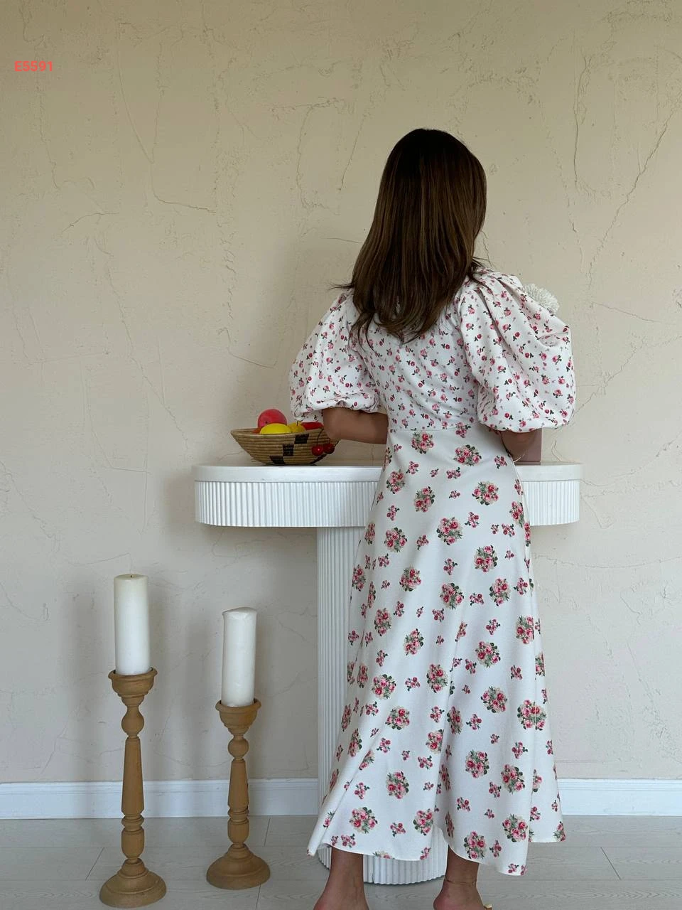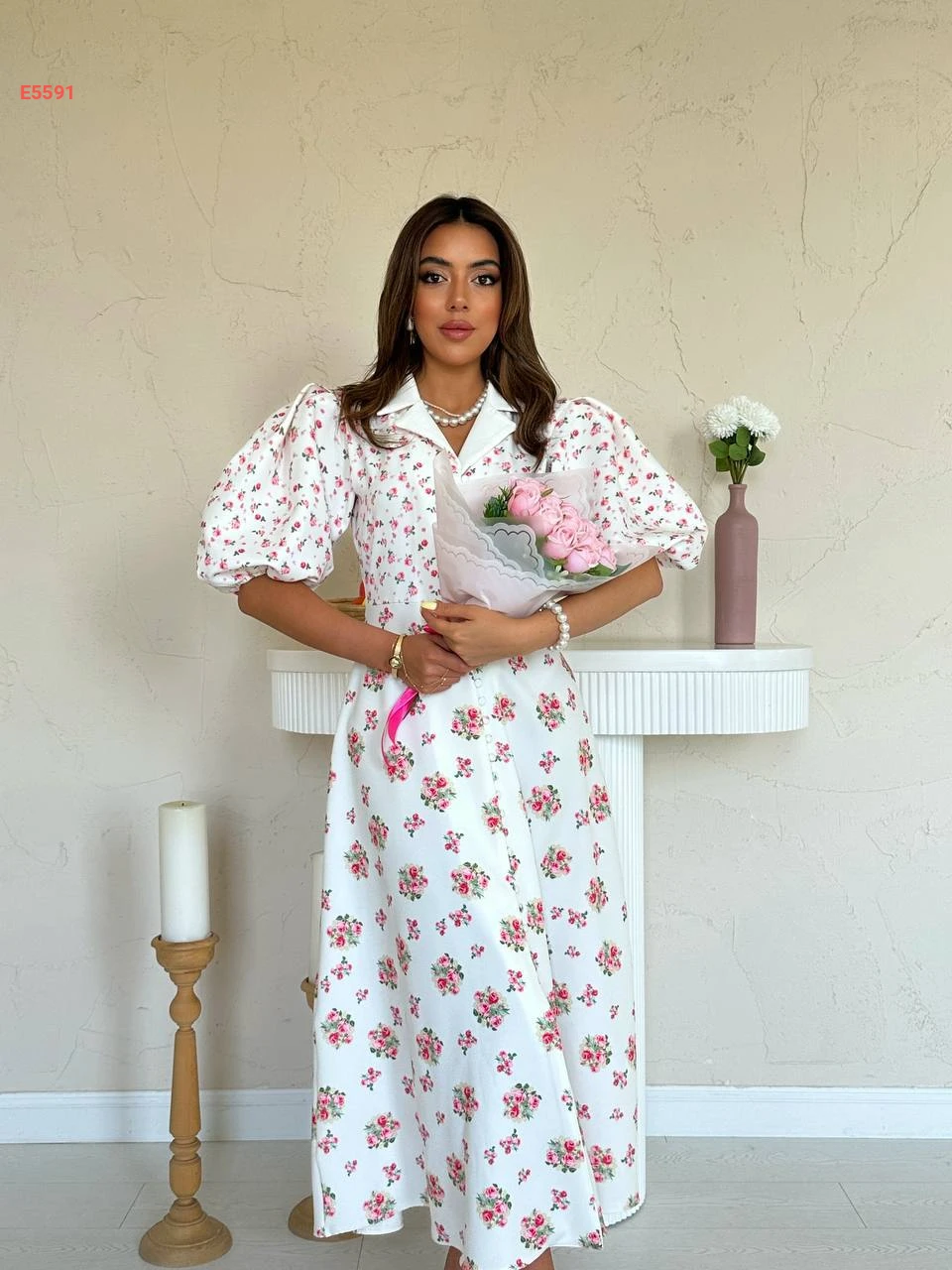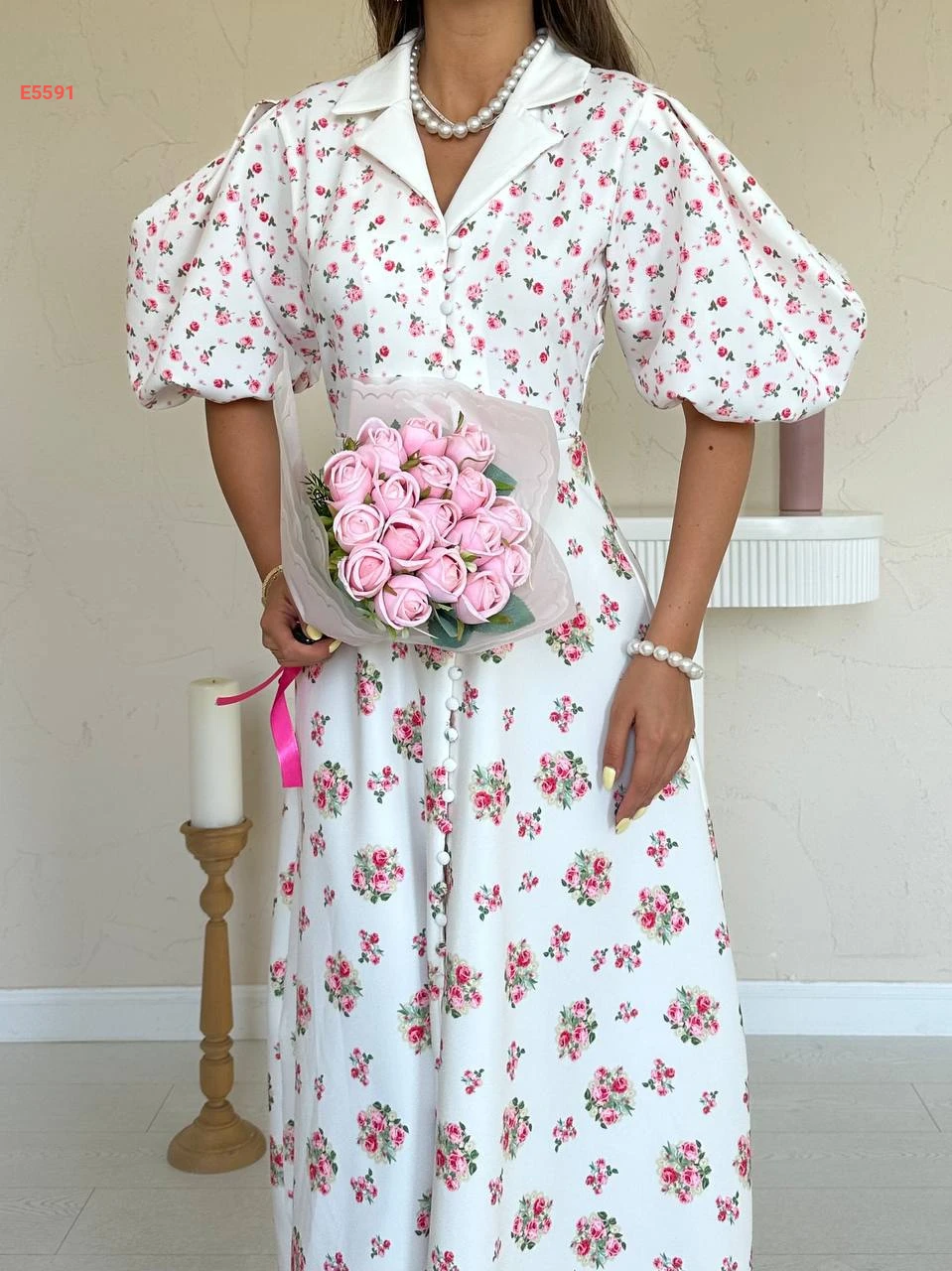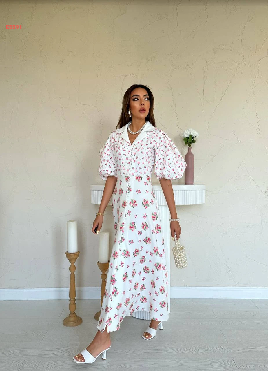 فستان طويل مورد بأزرار وأكمام نفخ