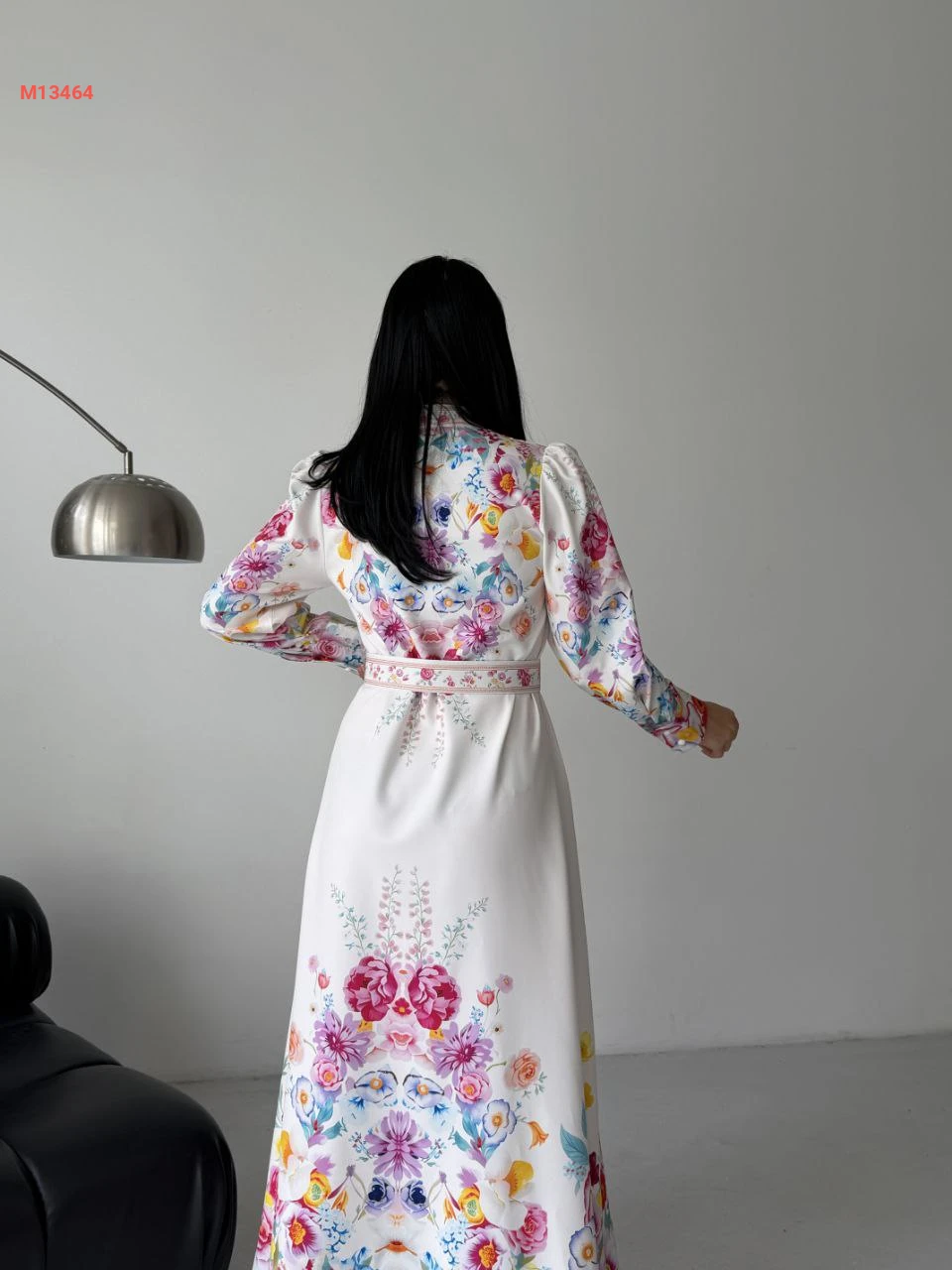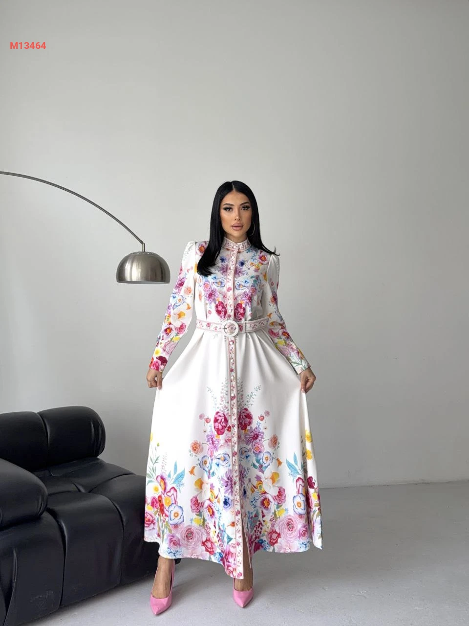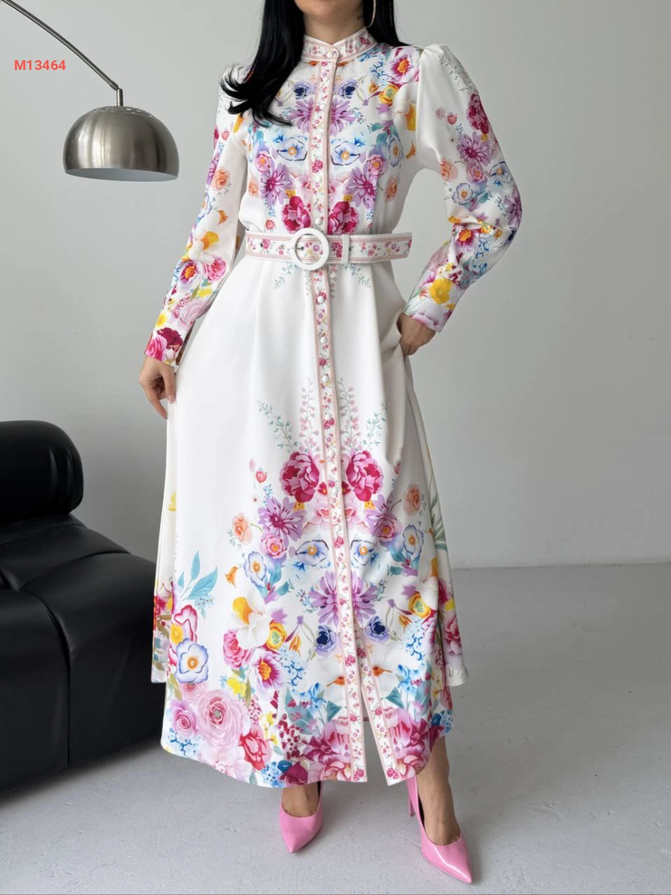 فستان طويل منقوش ورد بأزرار