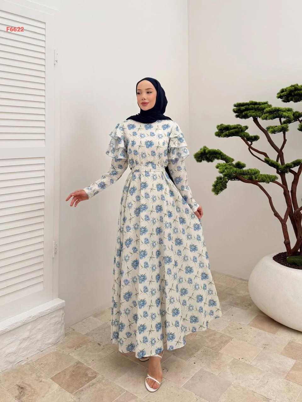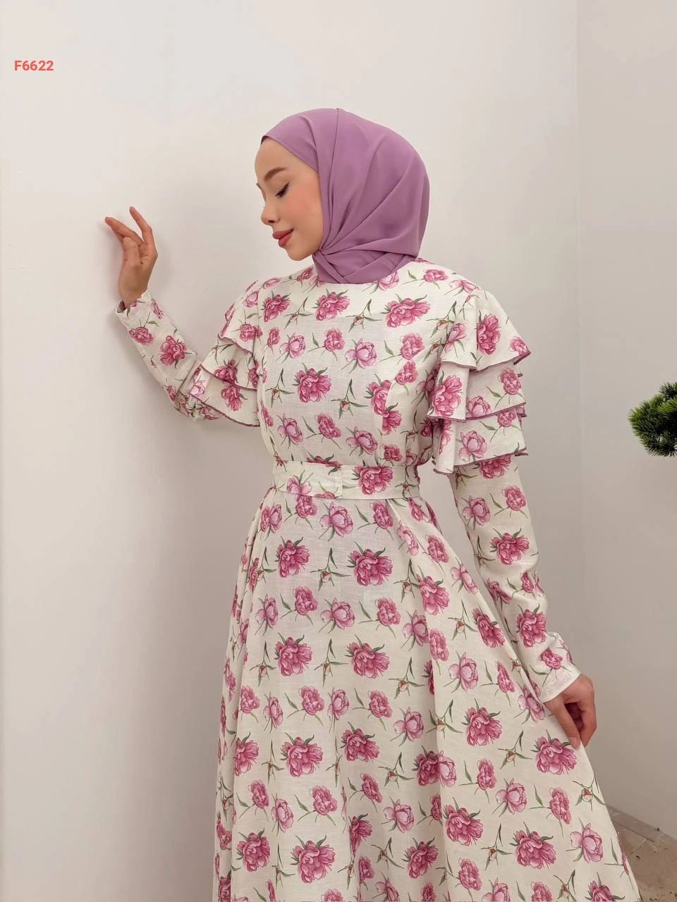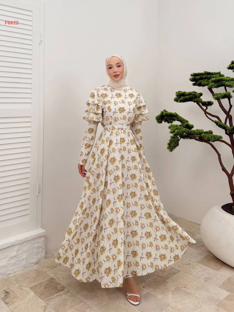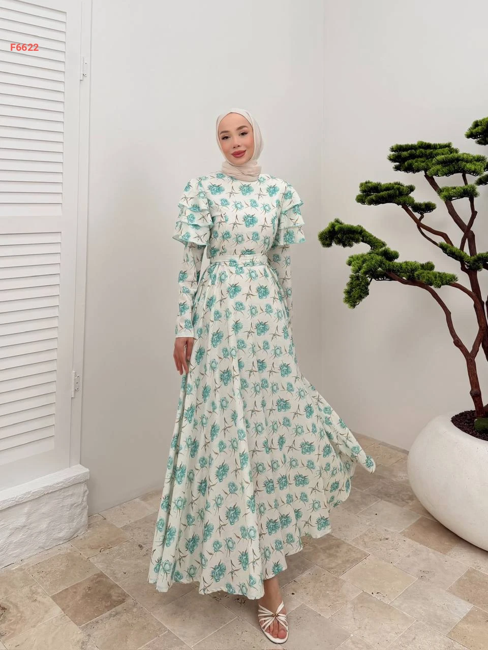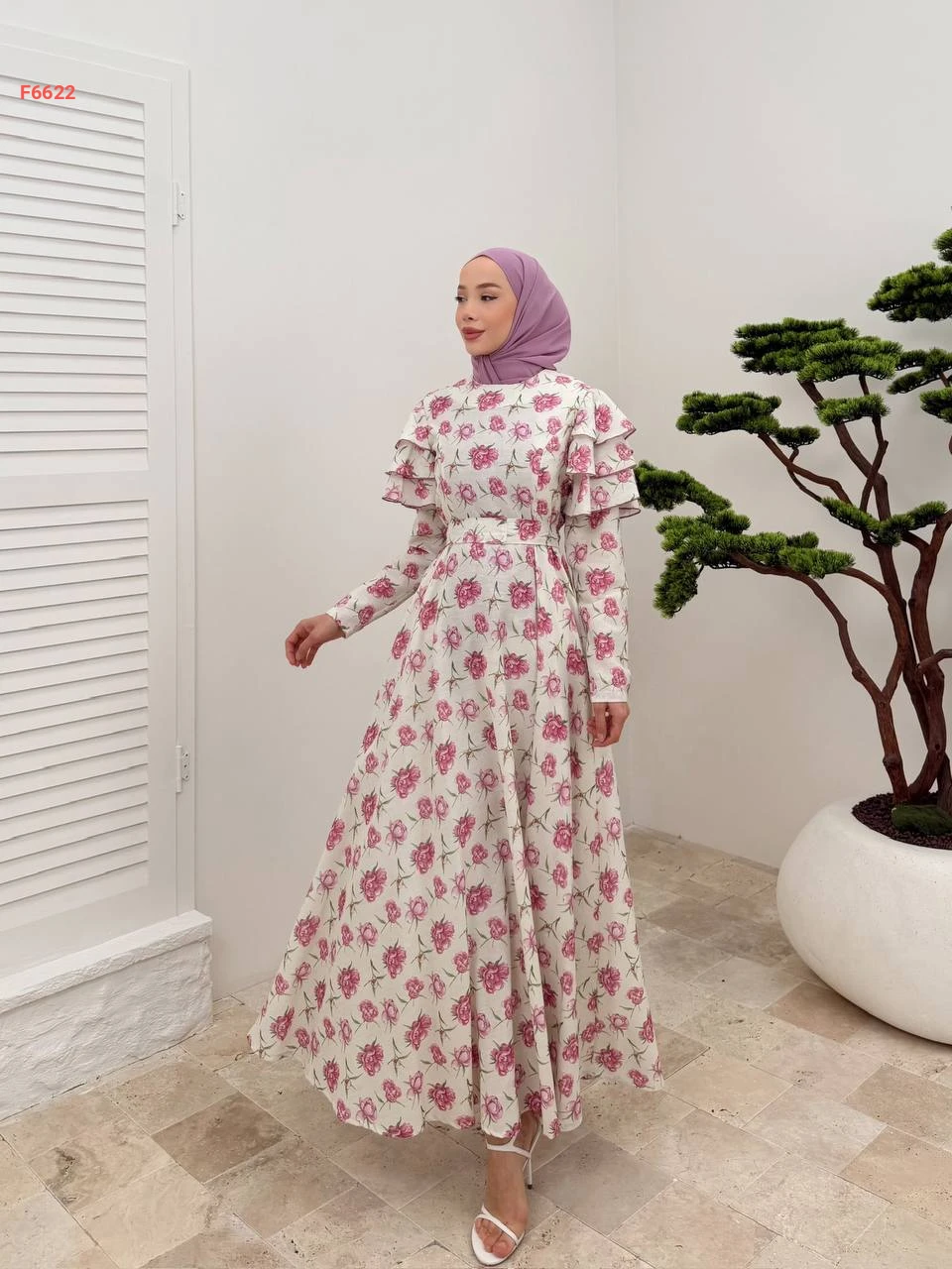 فستان طويل مورد كشكش عالكتف