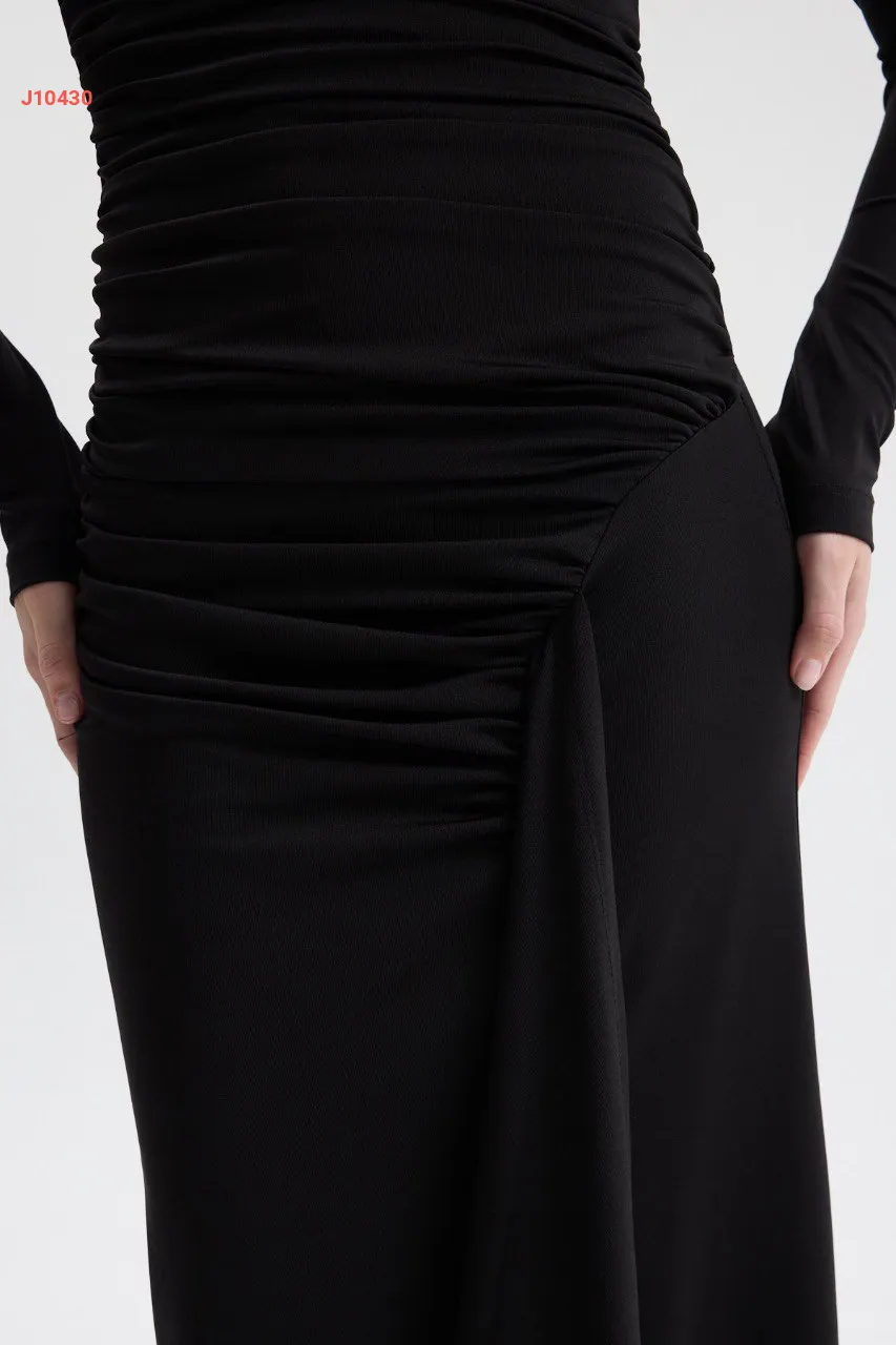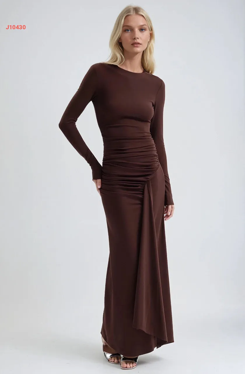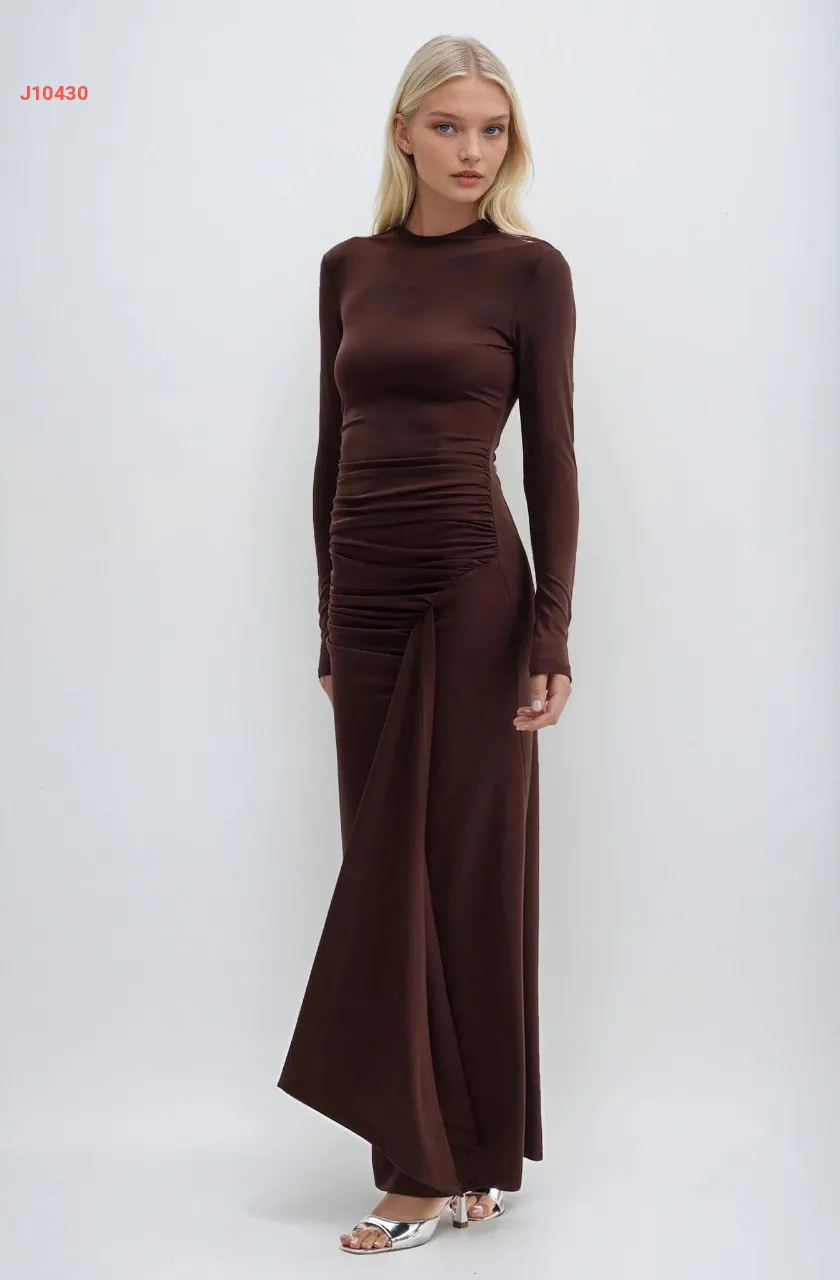 فستان طويل مجمع بلون موحد