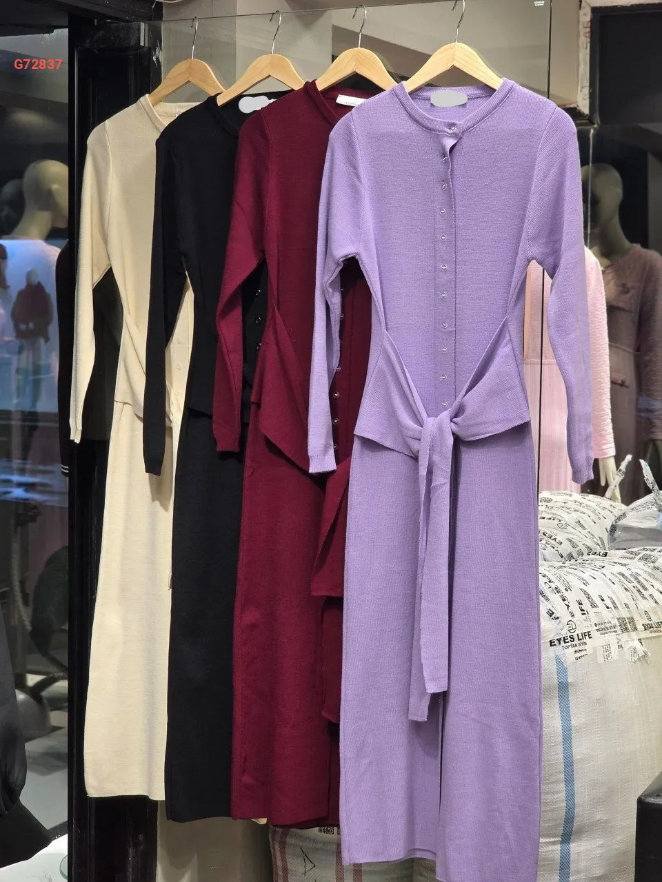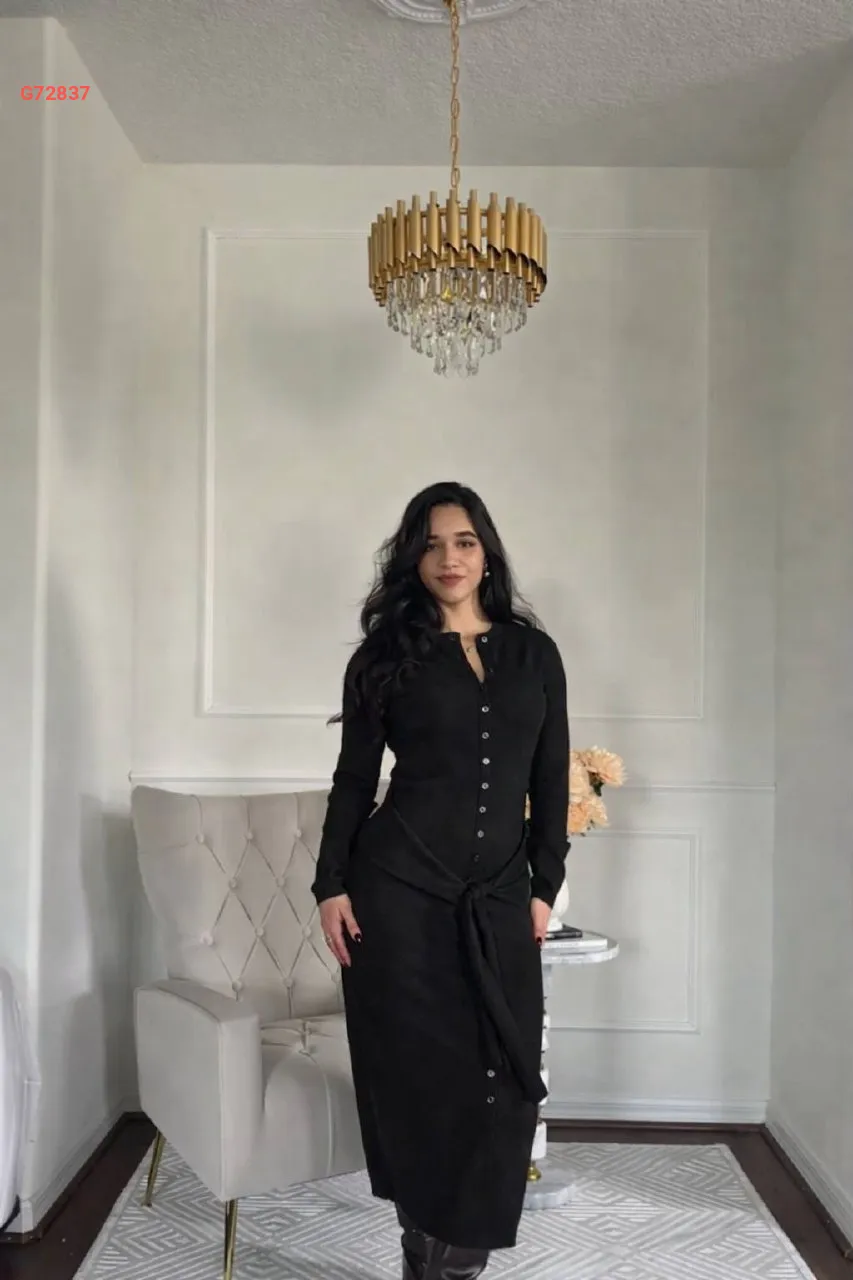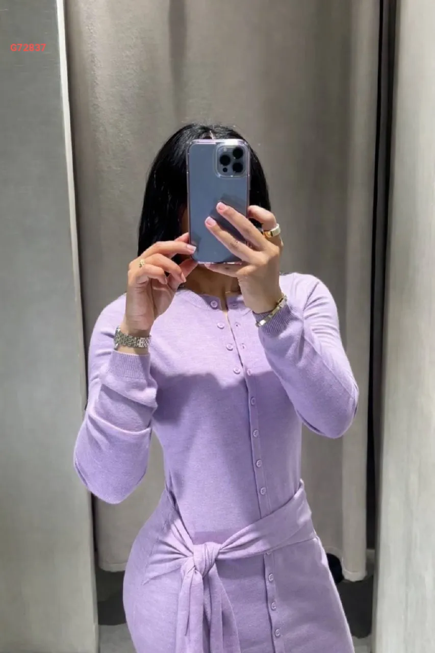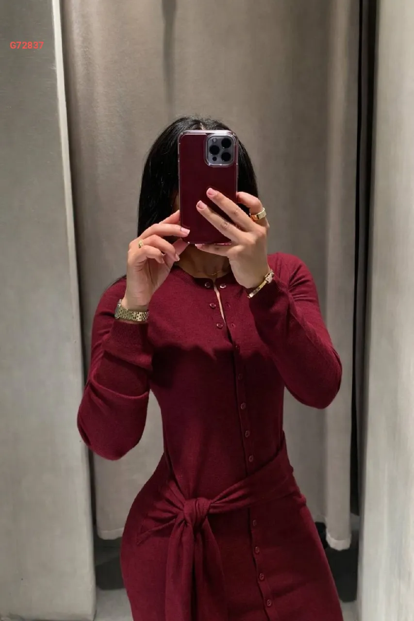 فستان تريكو طويل سادة بأزرار وربطة خصر