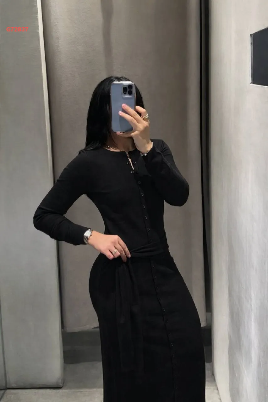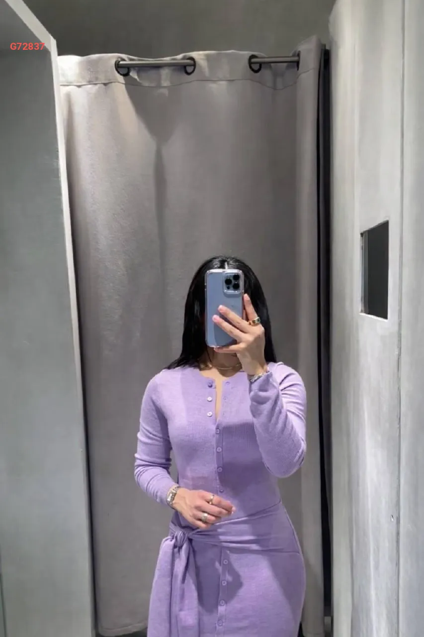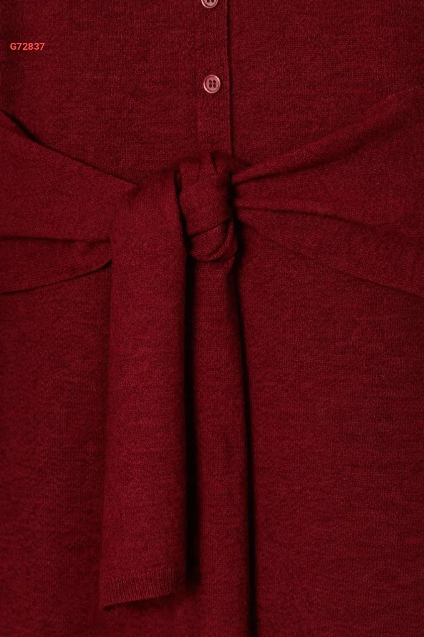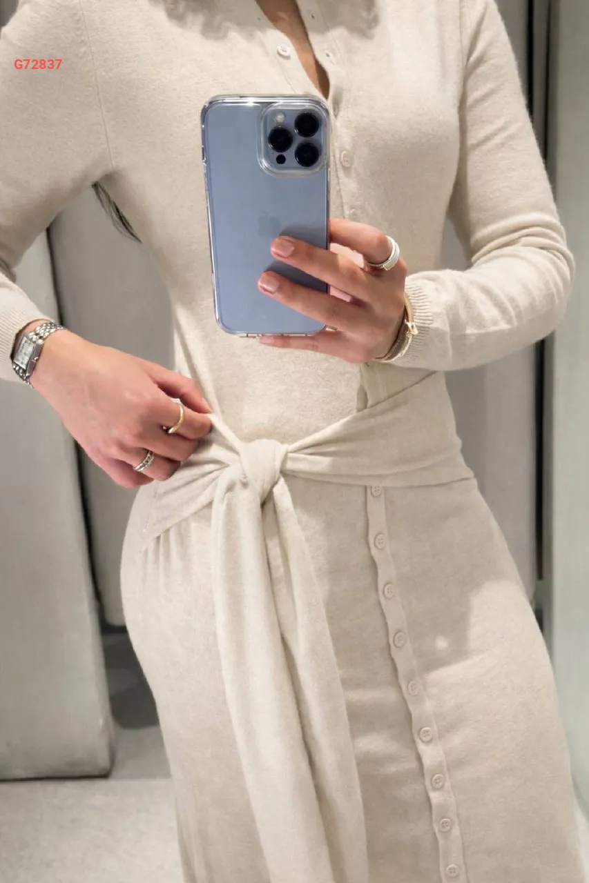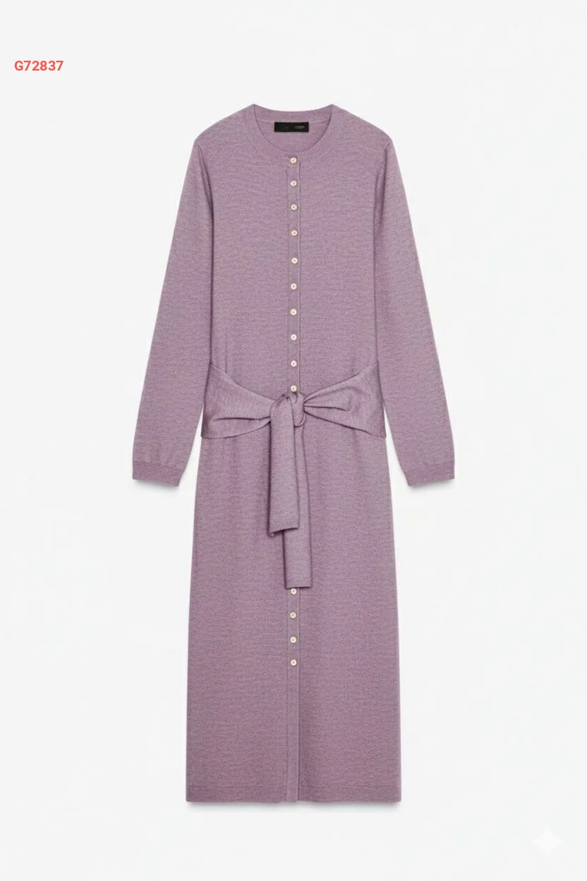 فستان تريكو طويل سادة بأزرار وربطة خصر