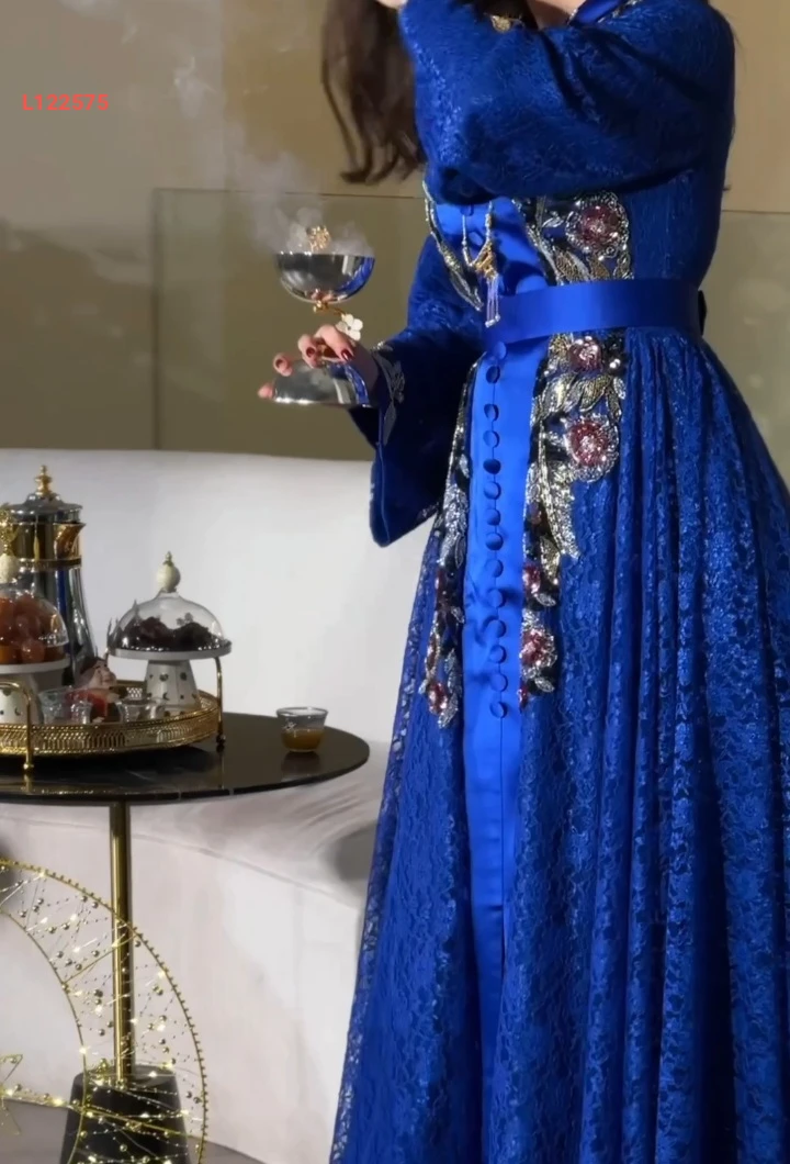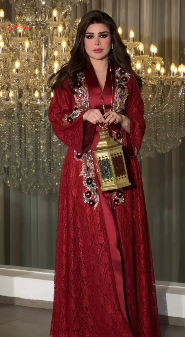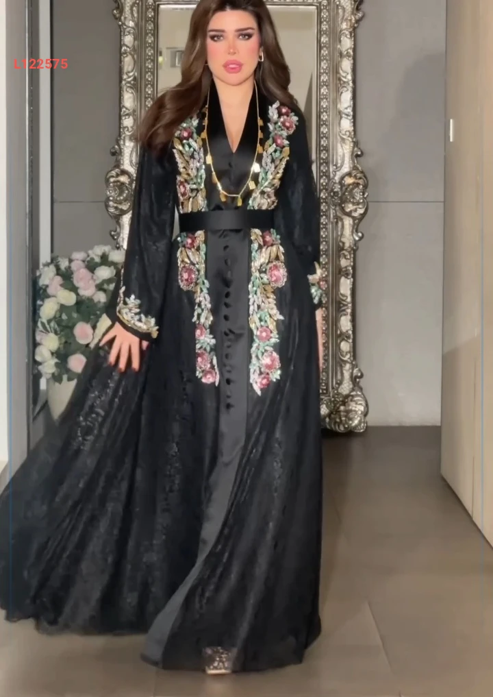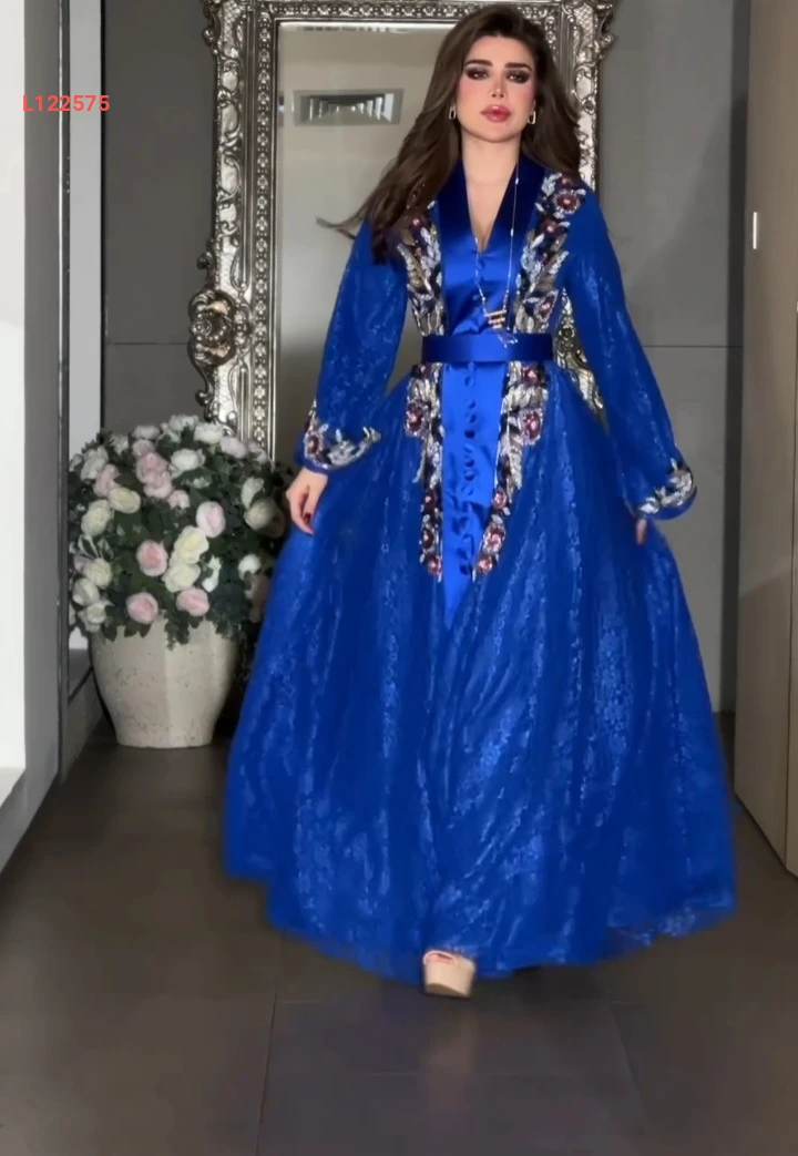 فستان طويل دانتيل مطرز بأزرار