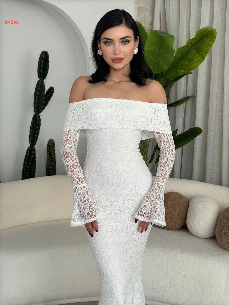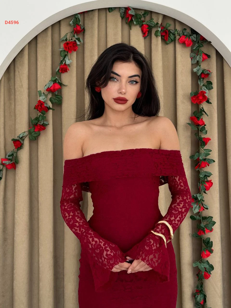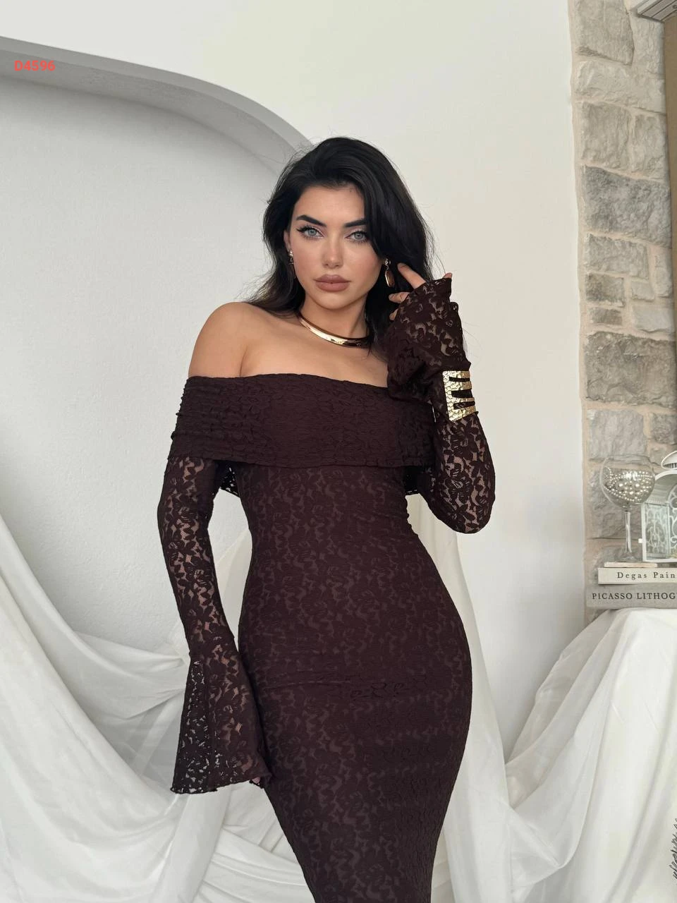فستان طويل دانتيل بياقة مادونا
