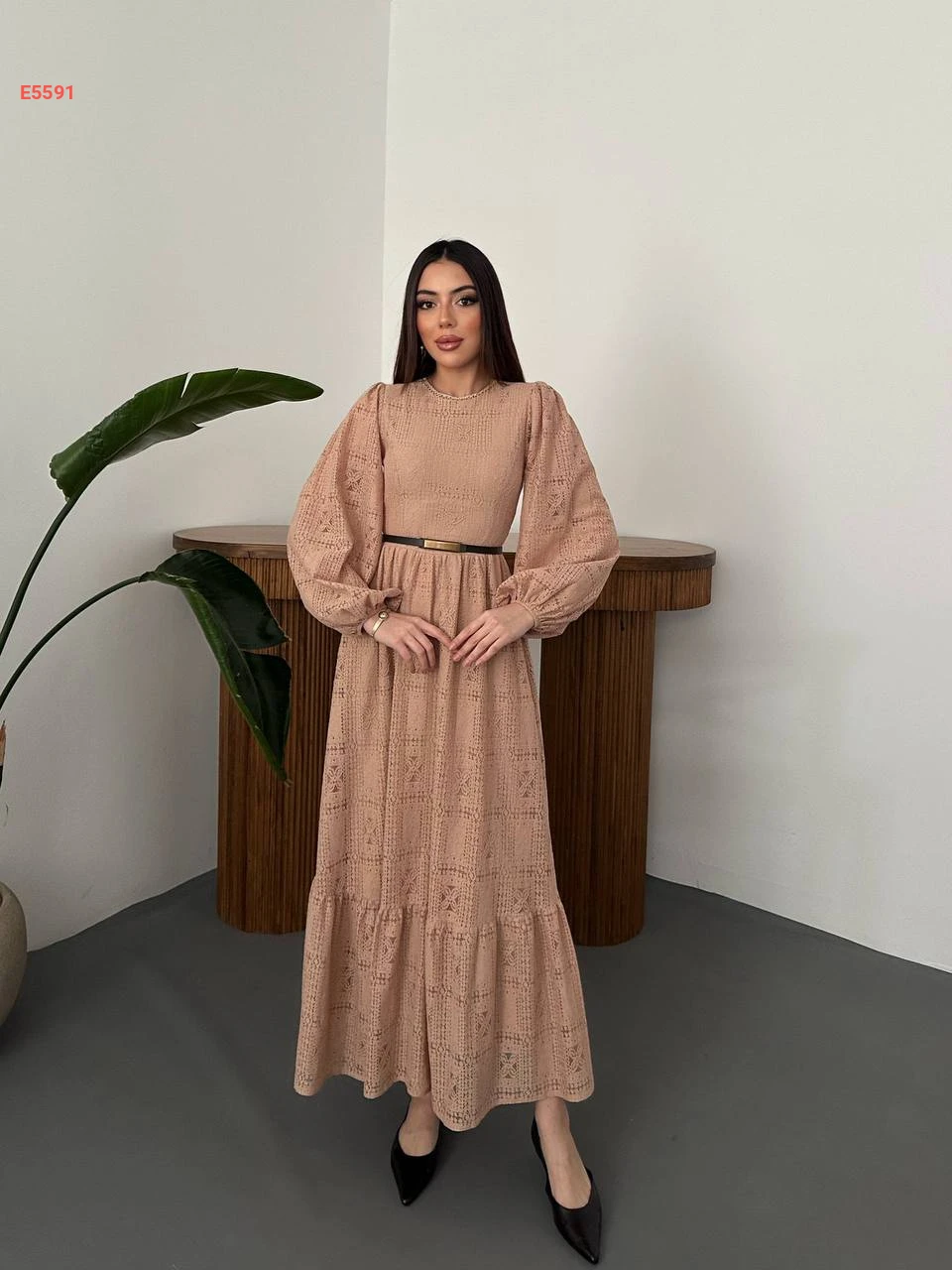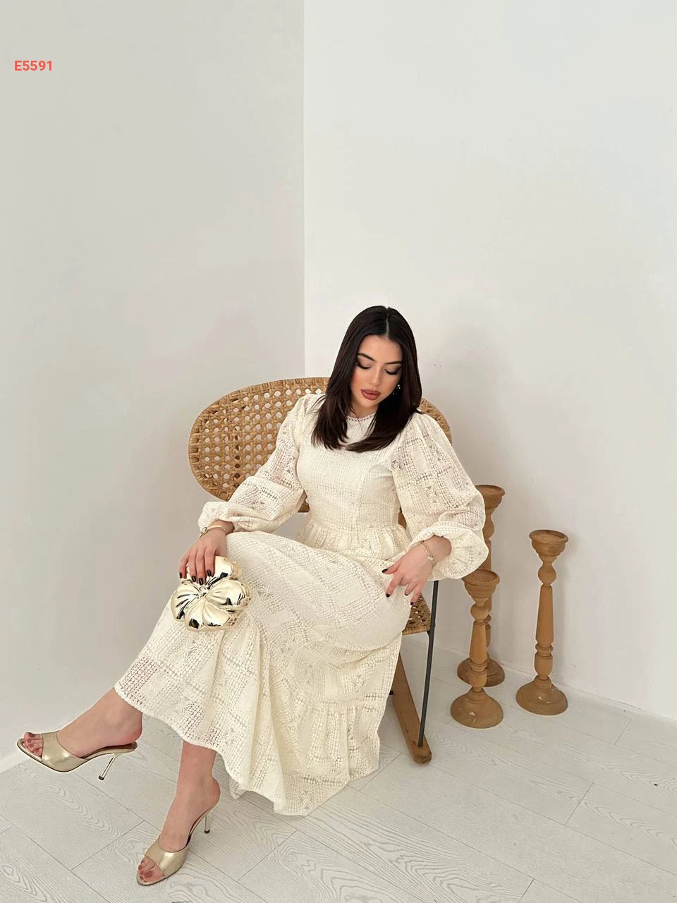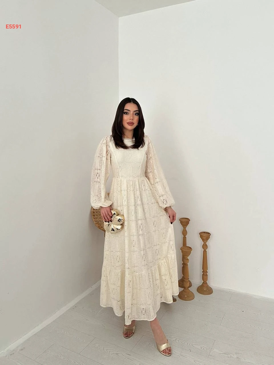 فستان طويل دانتيل بأكمام بالونية مفرغة