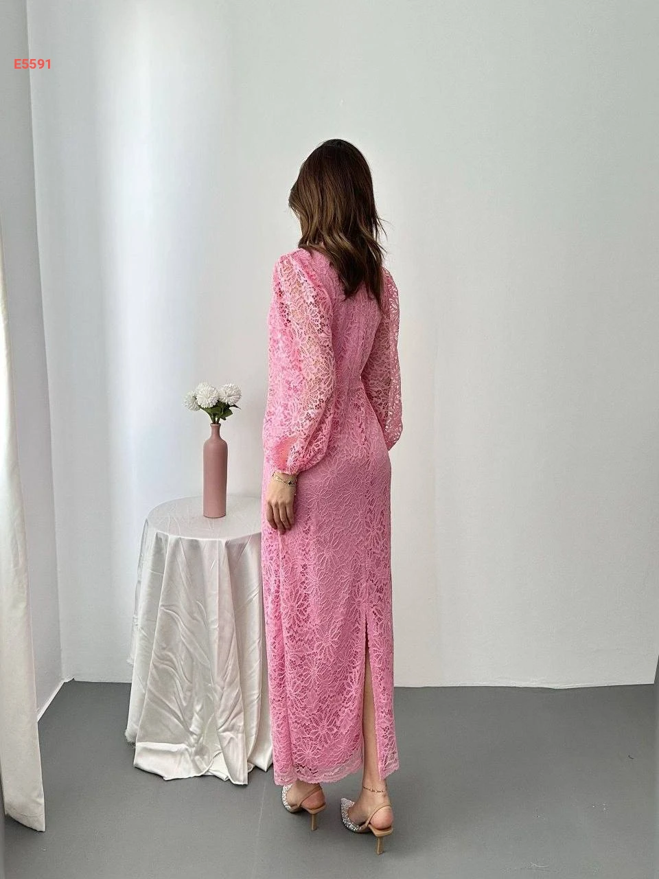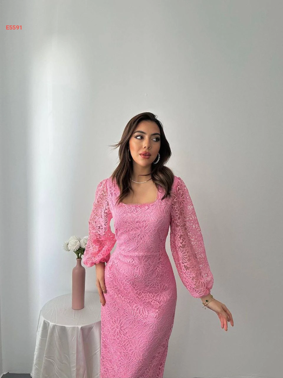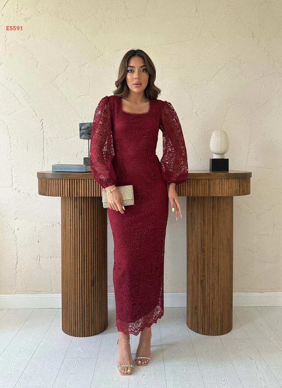 فستان طويل دانتيل بأكمام بالونية