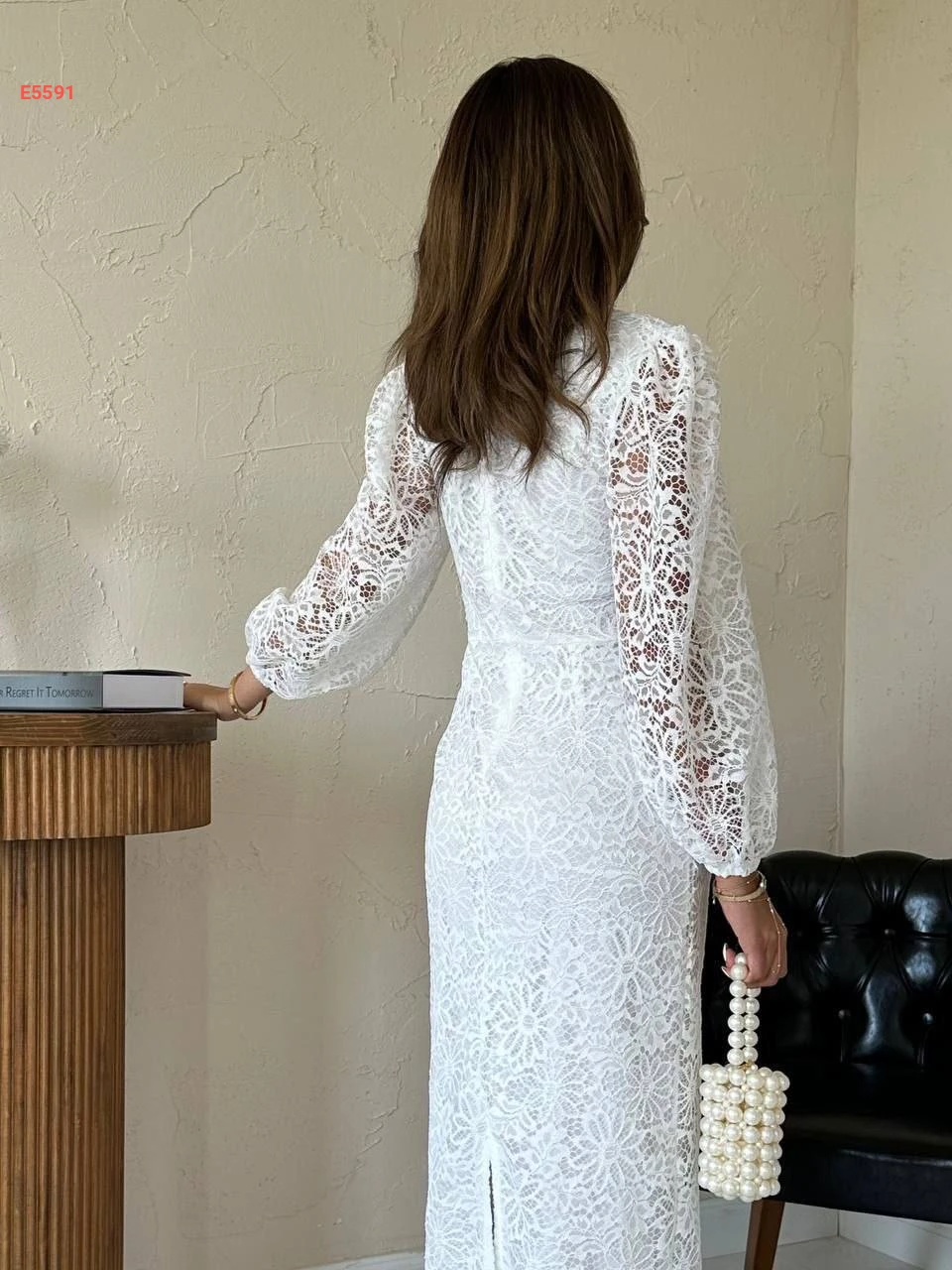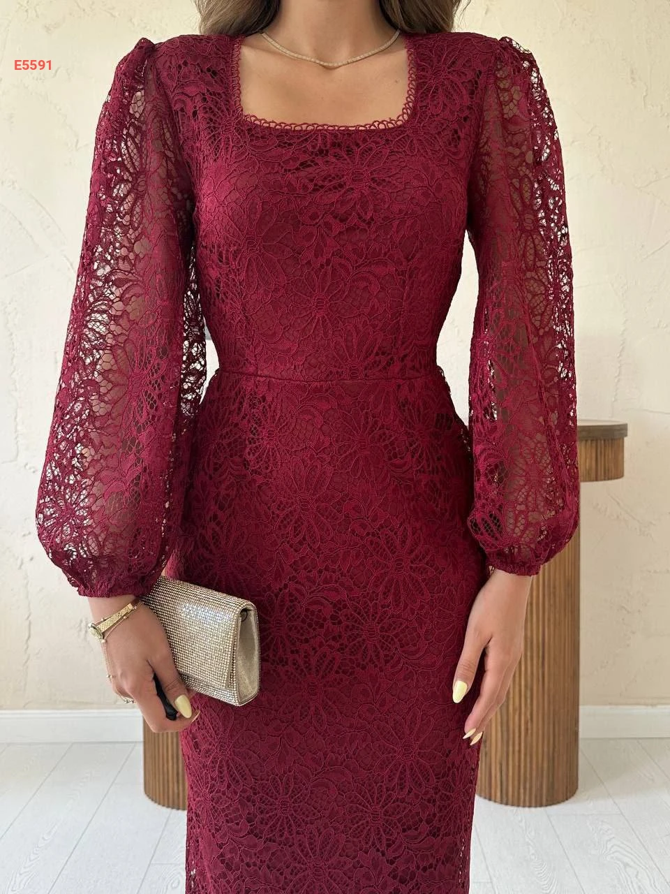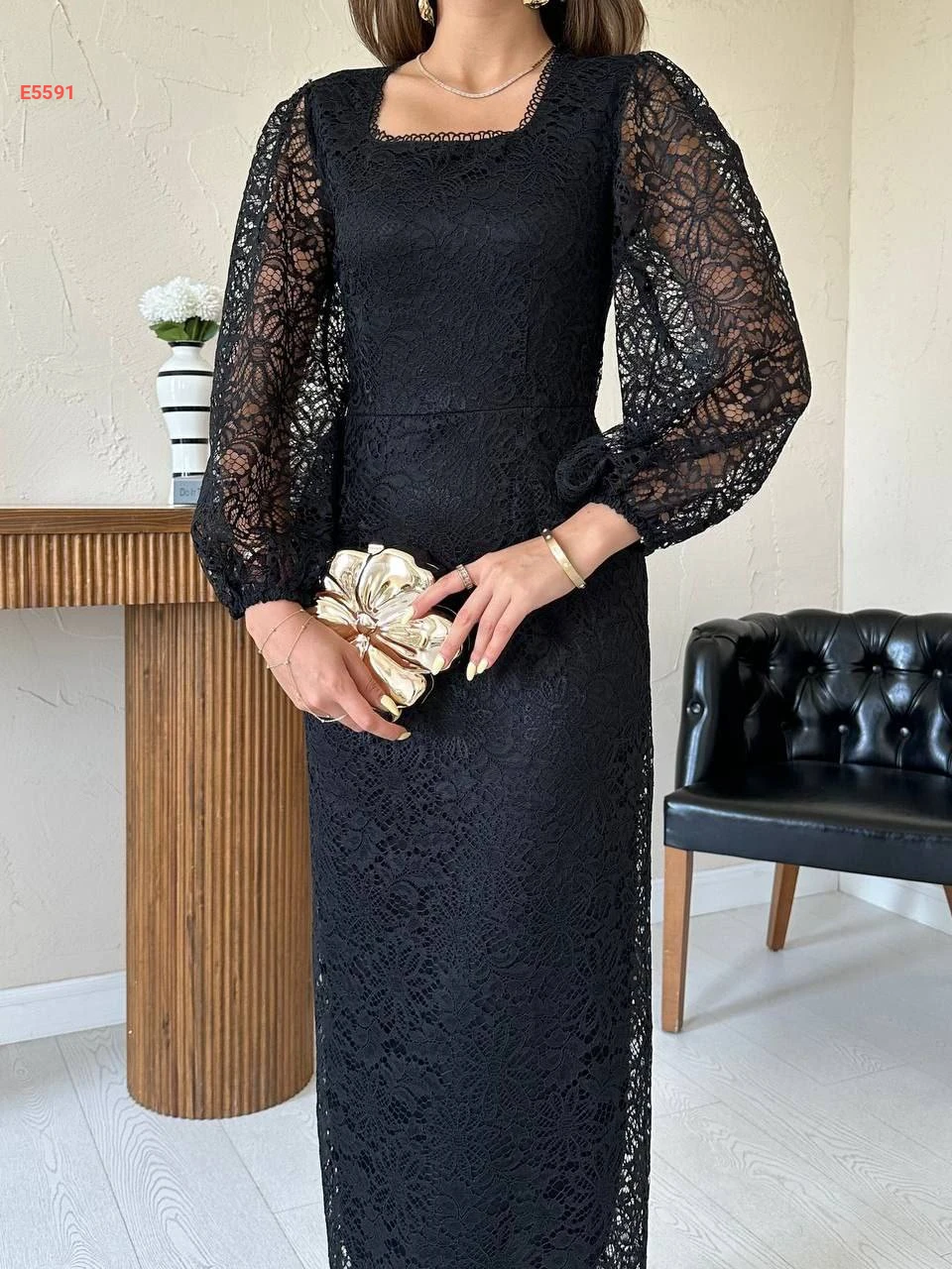 فستان طويل دانتيل بأكمام بالونية