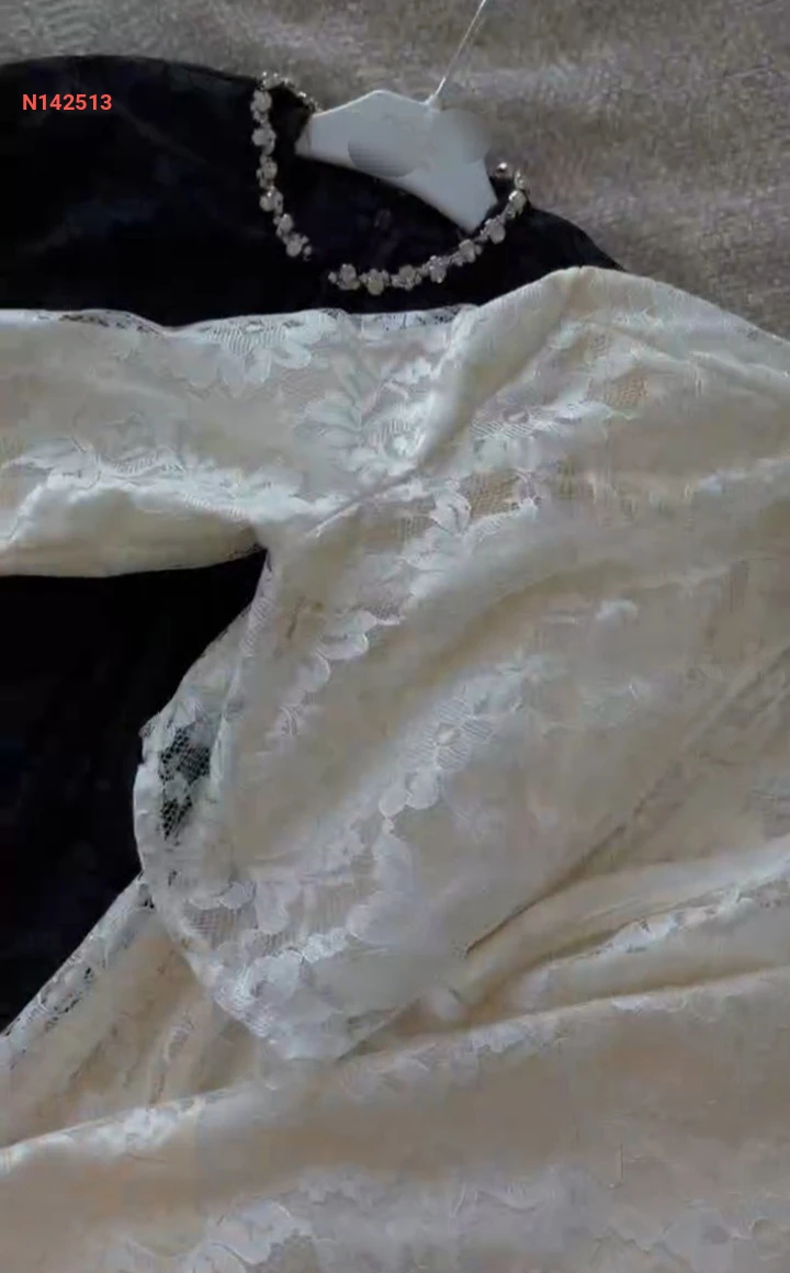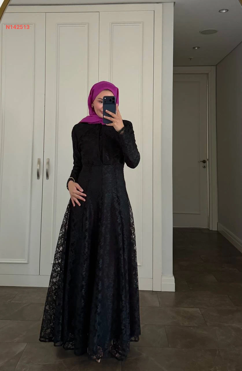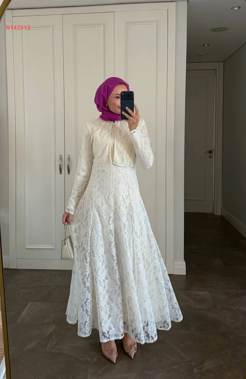 فستان دانتيل طويل كلوش بياقة مطرزة