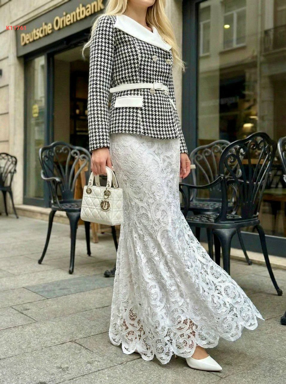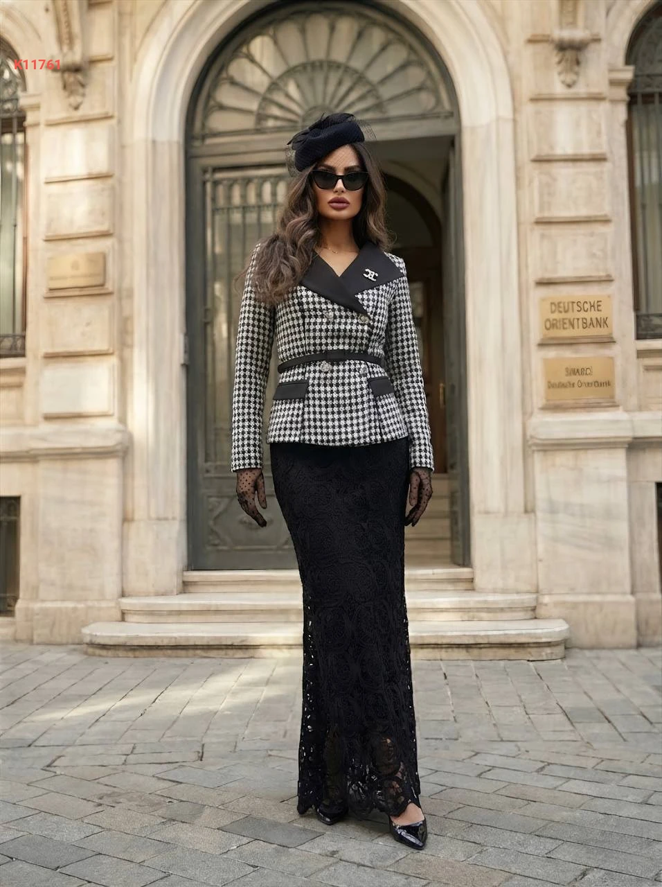 طقم تنورة طويل دانتيل وجاكيت