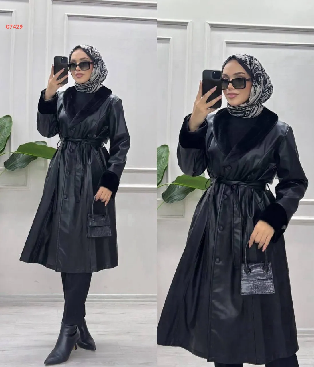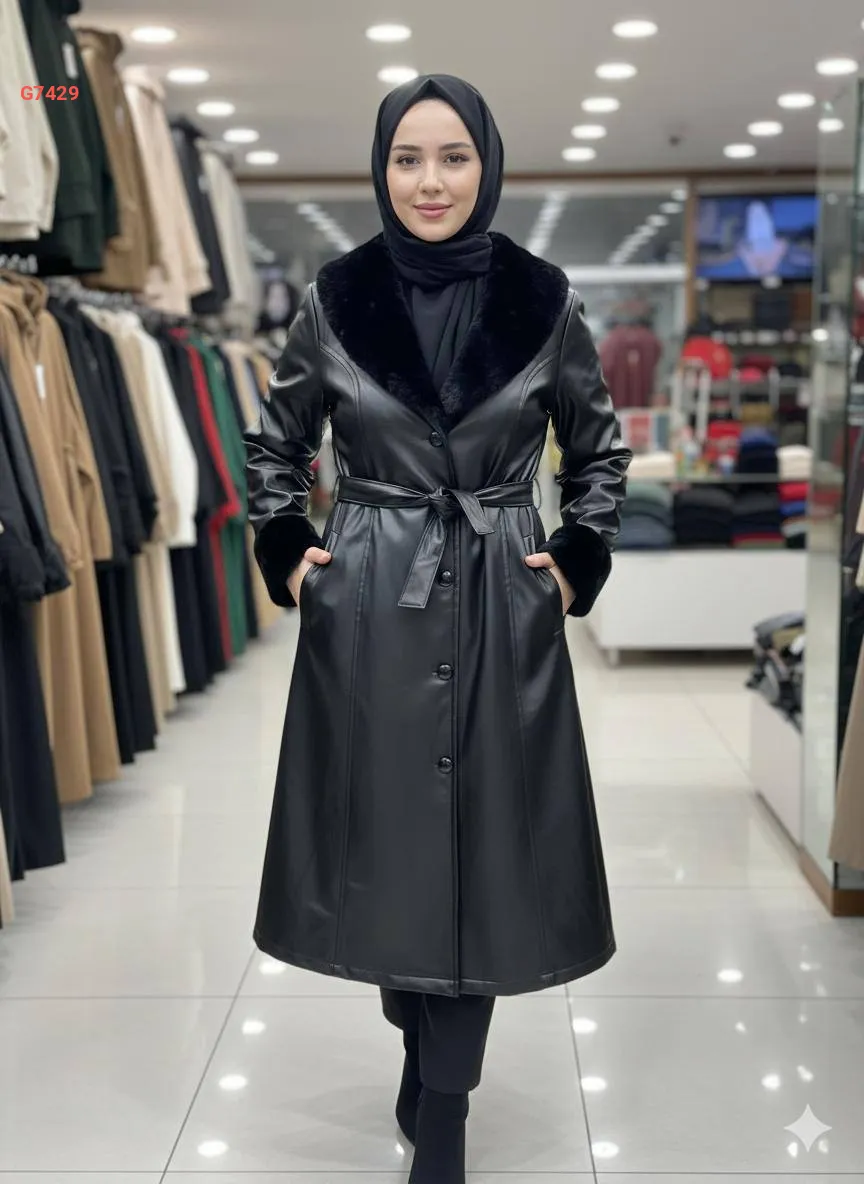 جاكيت جلد طويل بأزرار، ياقة فرو، مع حزام جلد