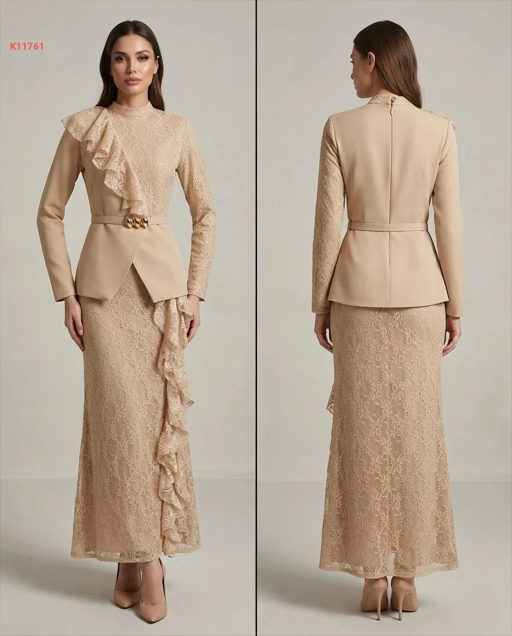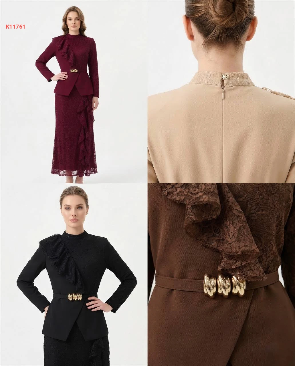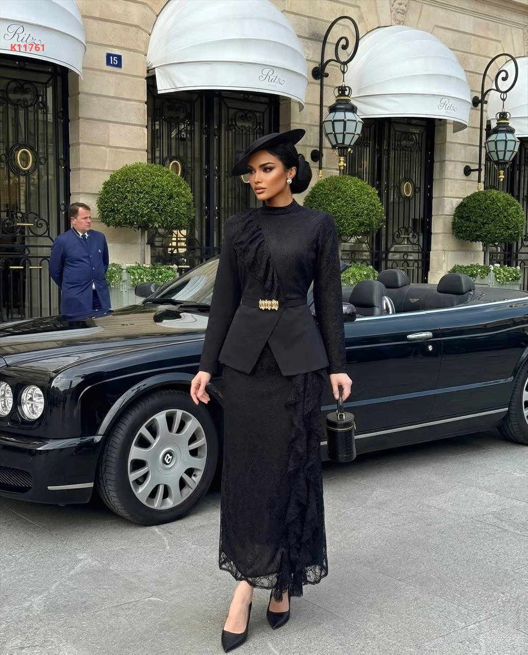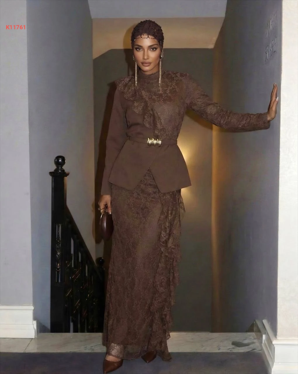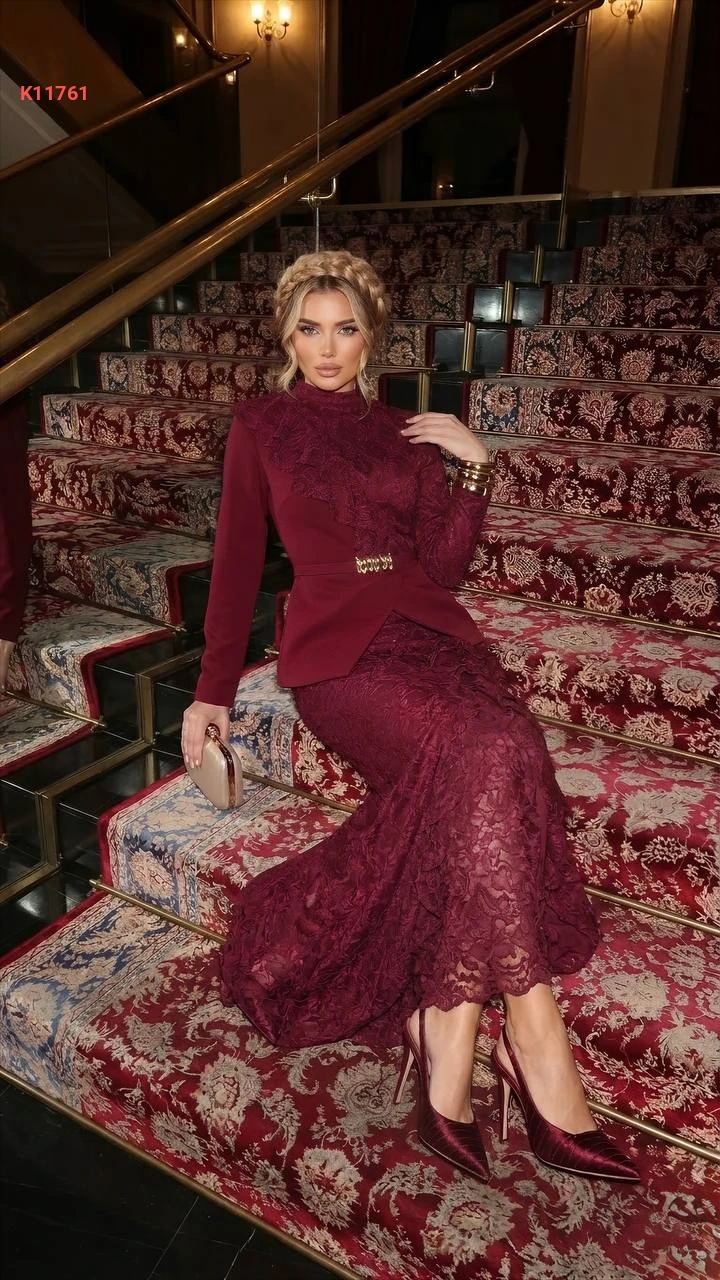فستان طويل دانتيل مبطن مع تفاصيل بليزر