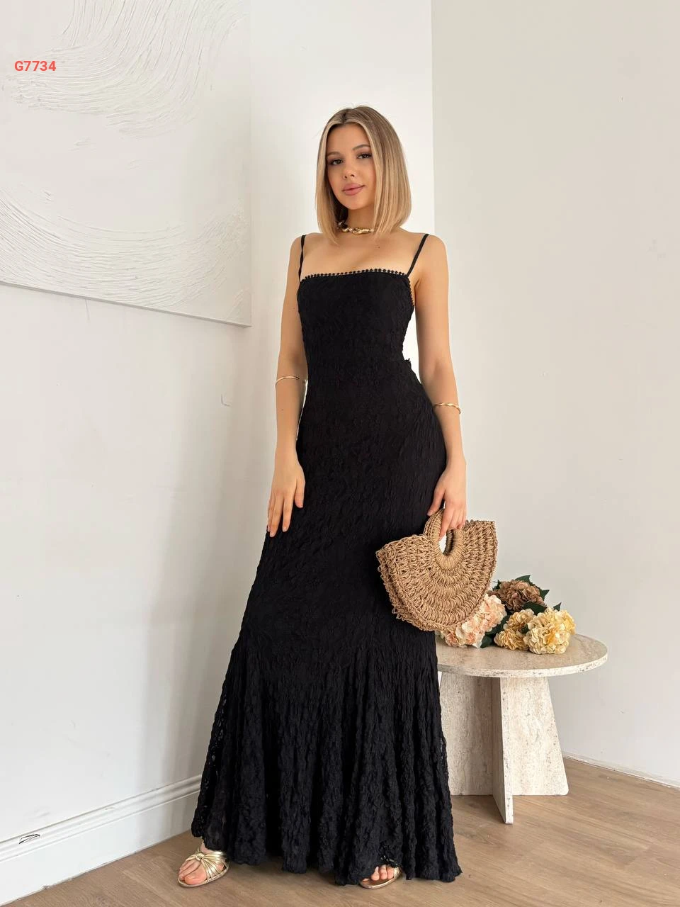 فستان دانتيل مبطن طويل بحمالات رفيعة