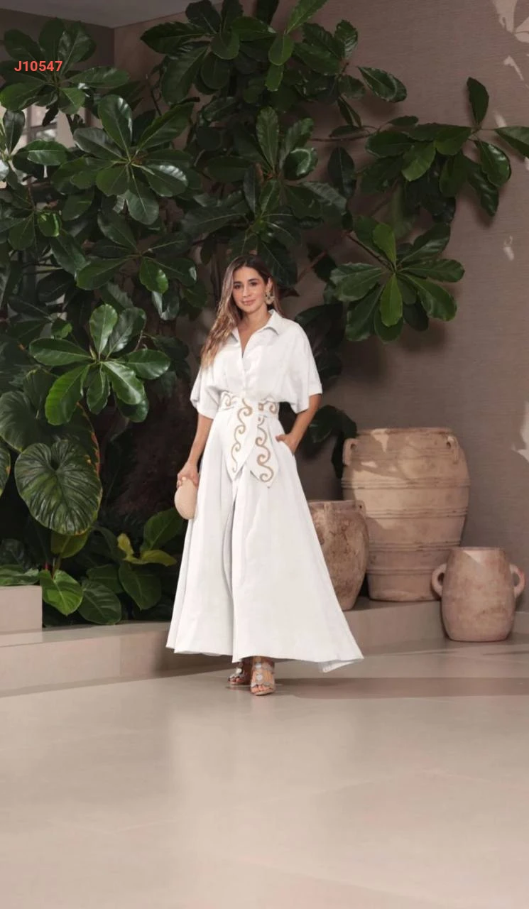 فستان طويل كتان مع حزام مطرز