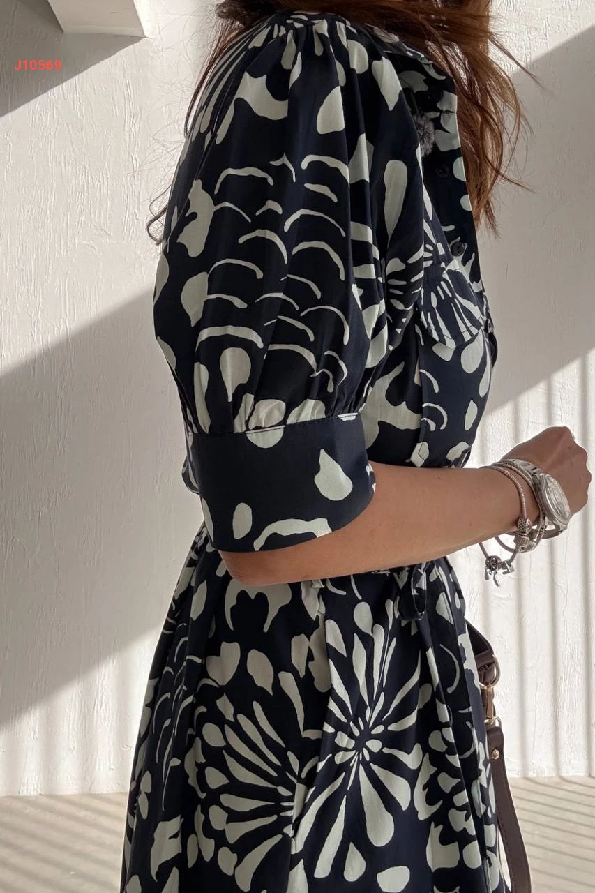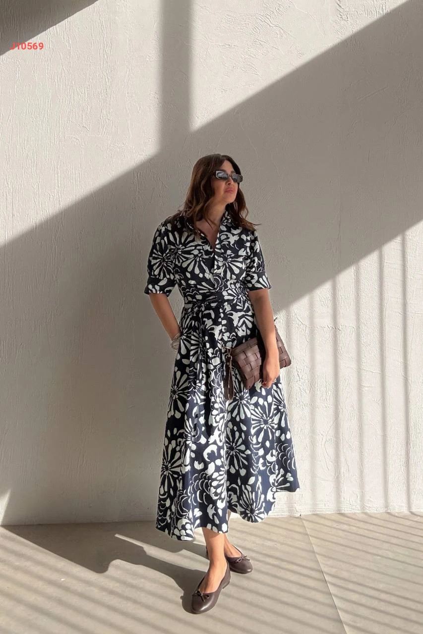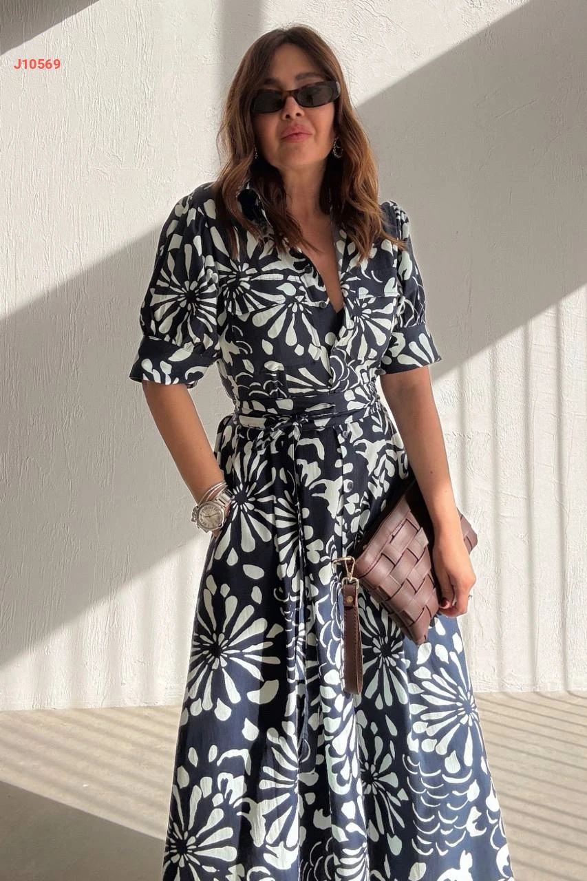 فستان طويل منقوش لونين بأزرار