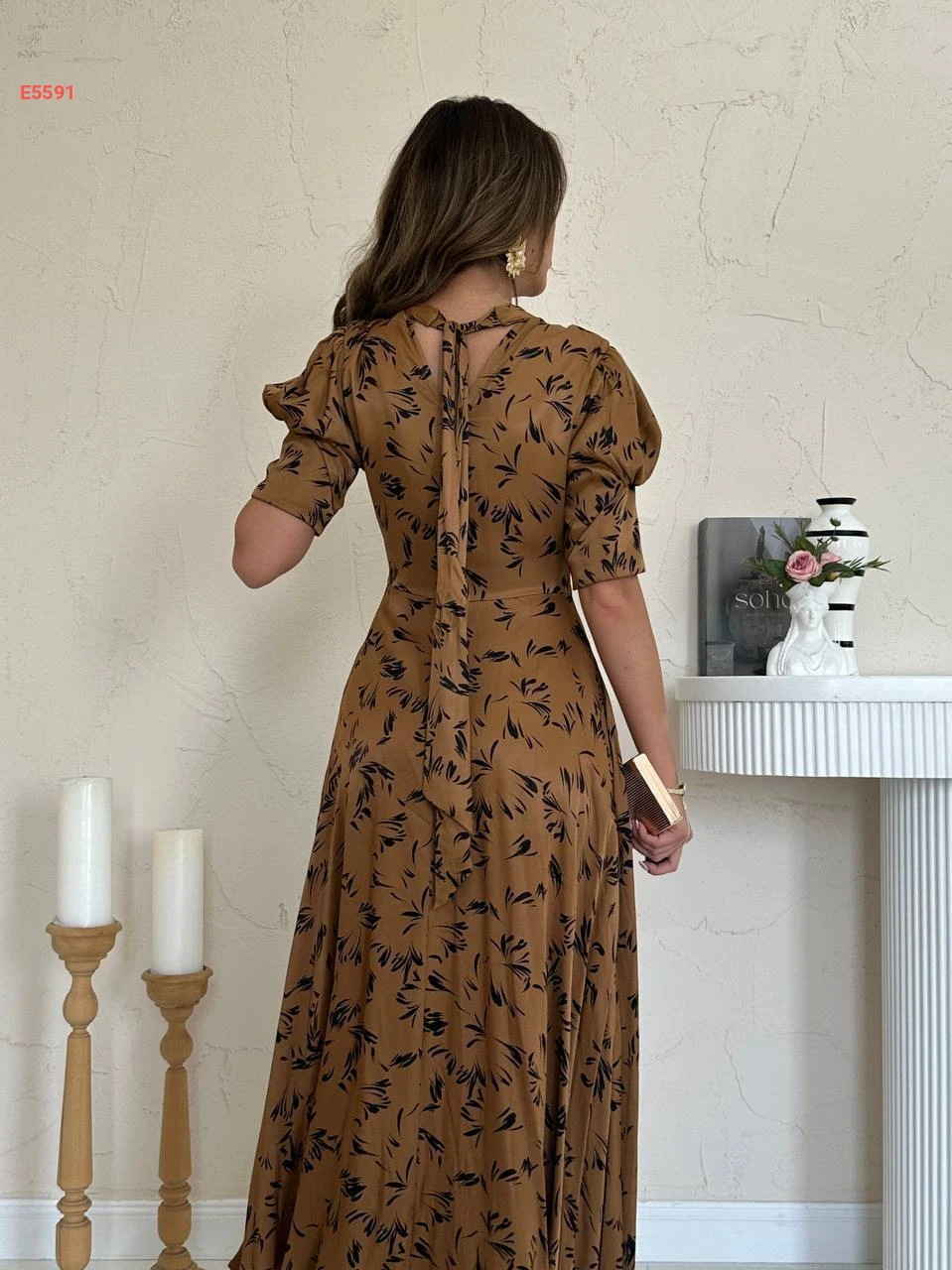 فستان طويل منقوش بربطة خلفية