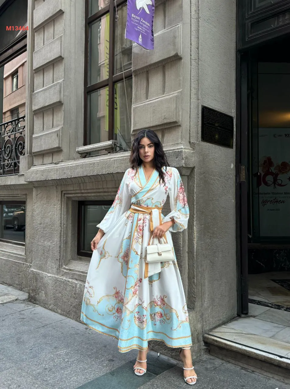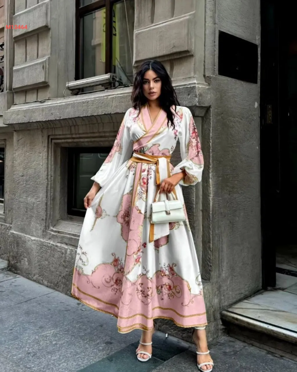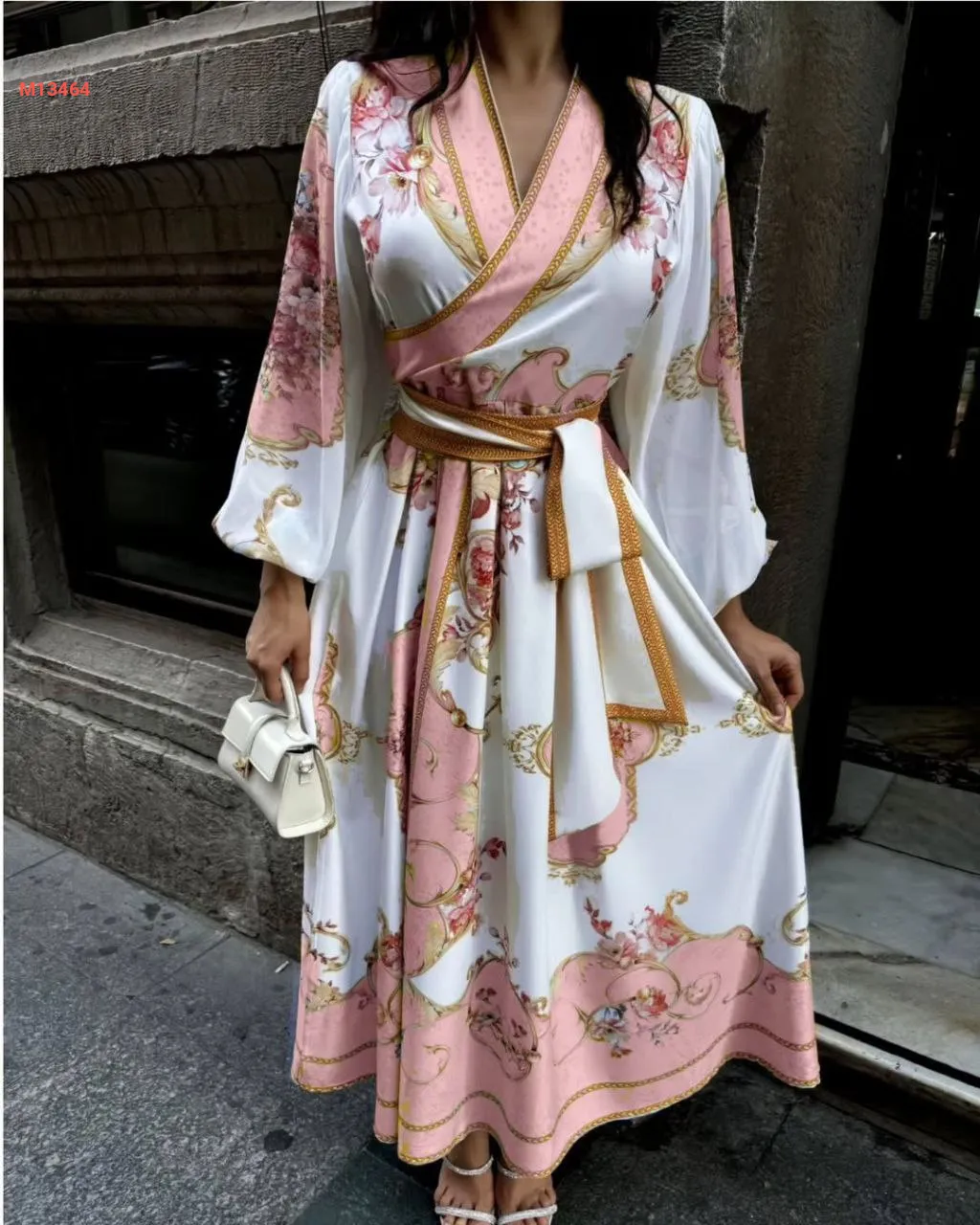 فستان طويل منقوش مع زنار طويل