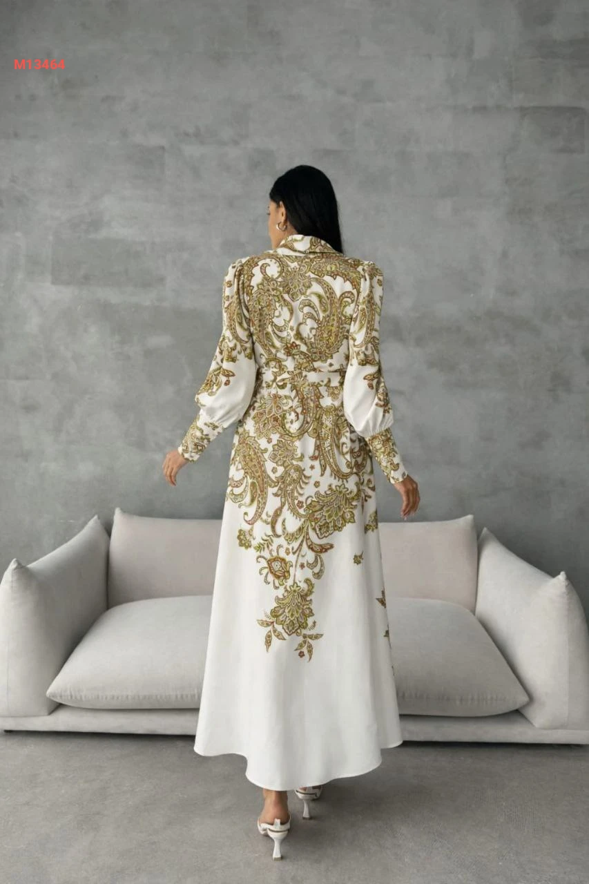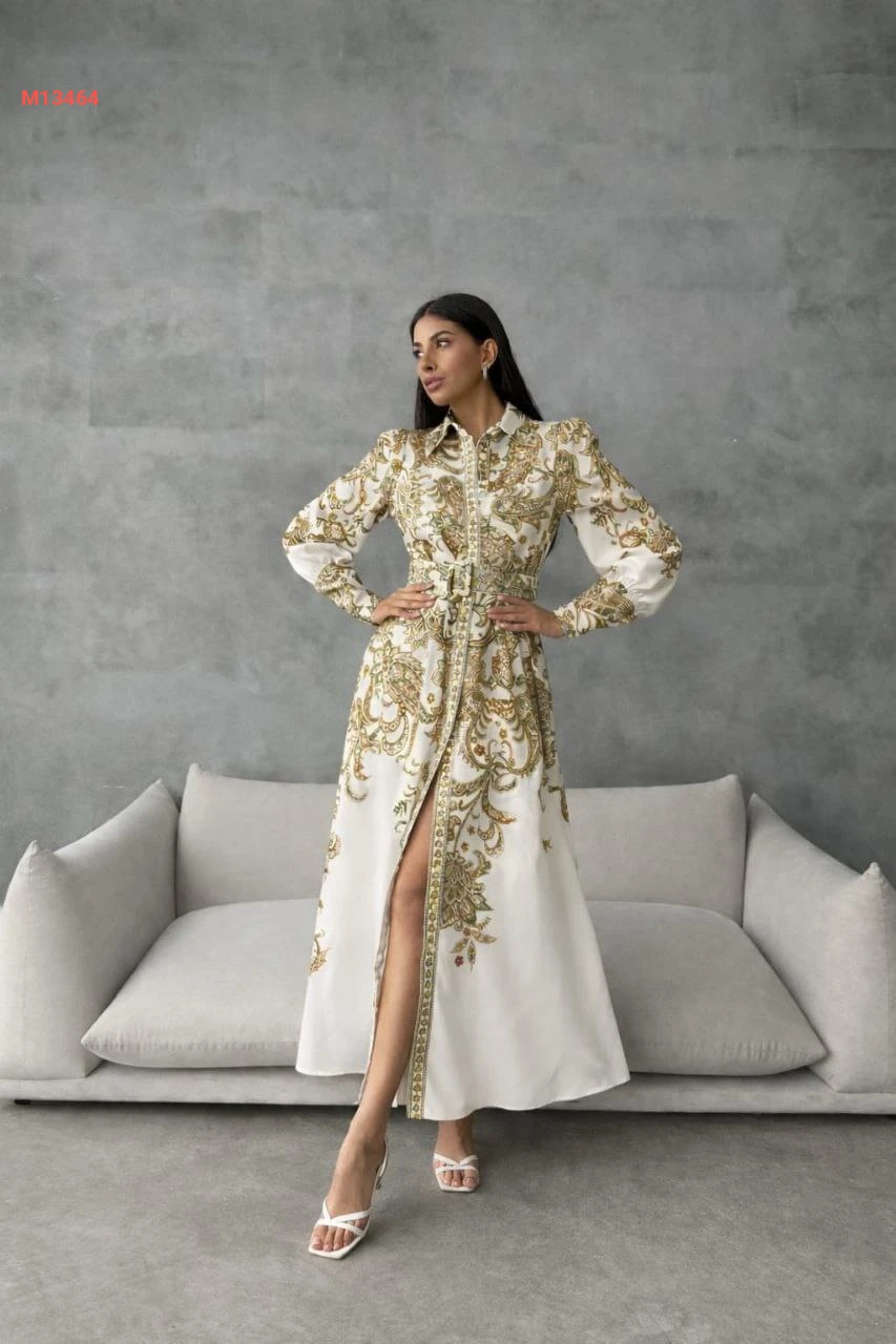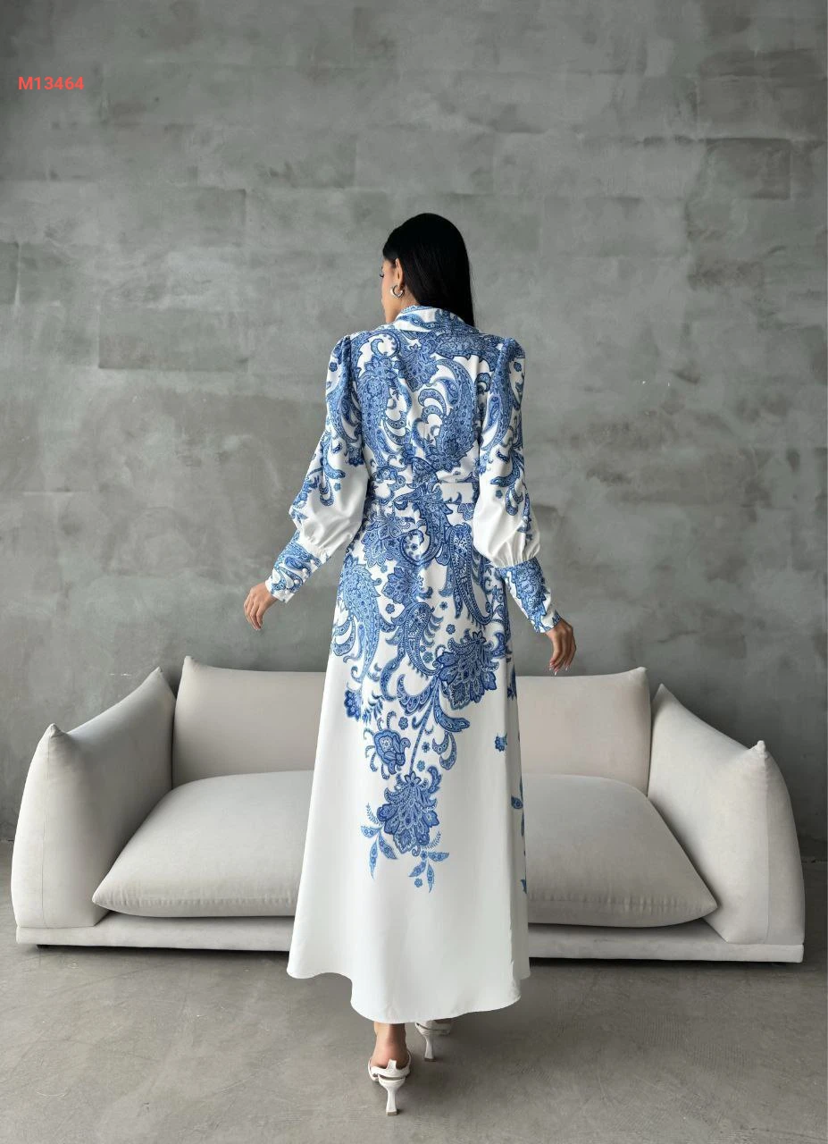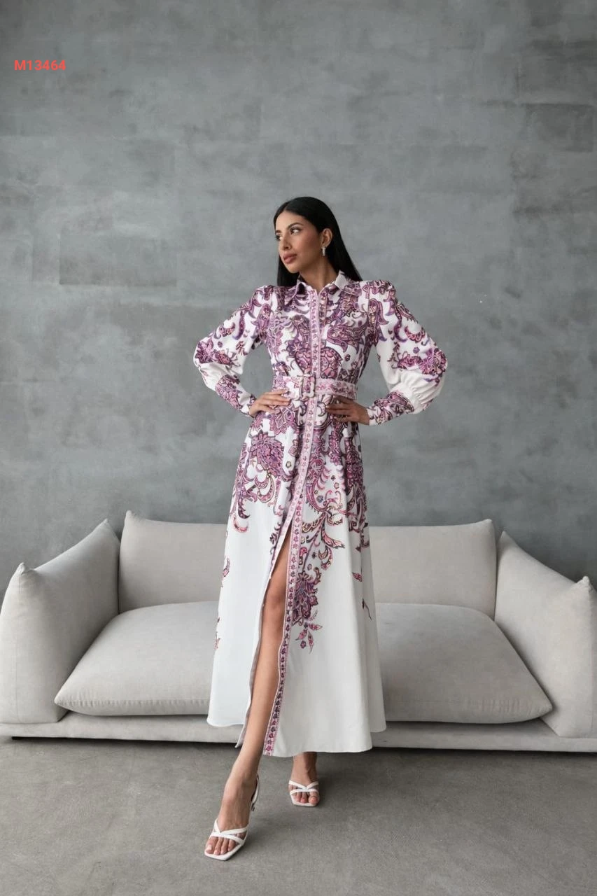 فستان طويل منقوش بأزرار وحزام