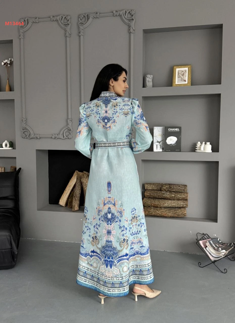 فستان طويل منقوش بأزرار وحزام