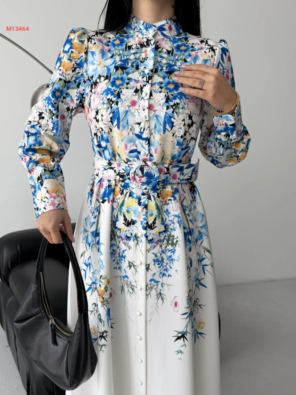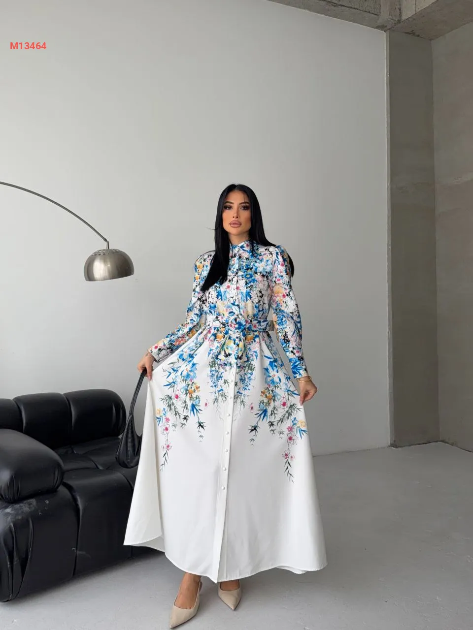 فستان طويل منقوش بأزرار وحزام