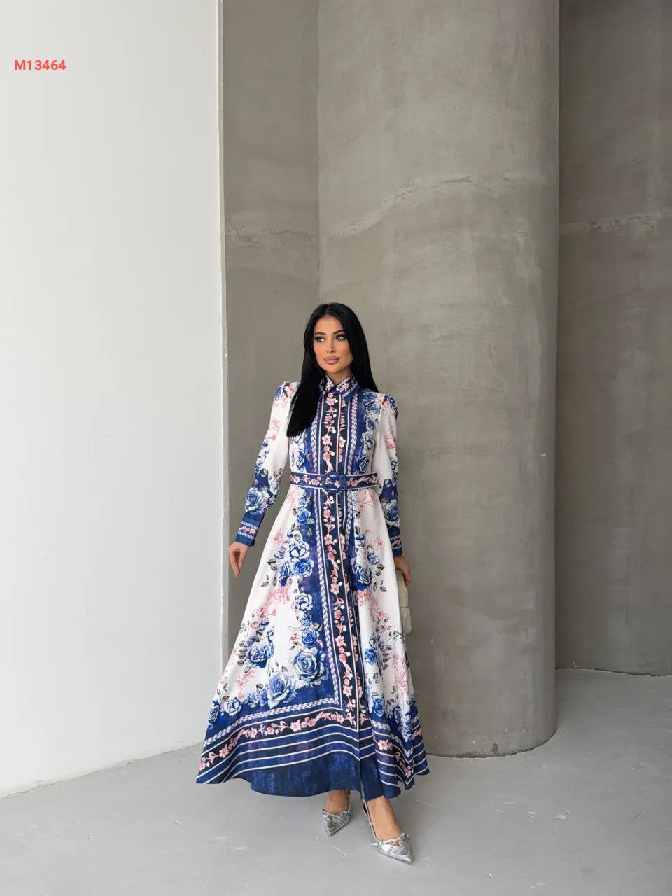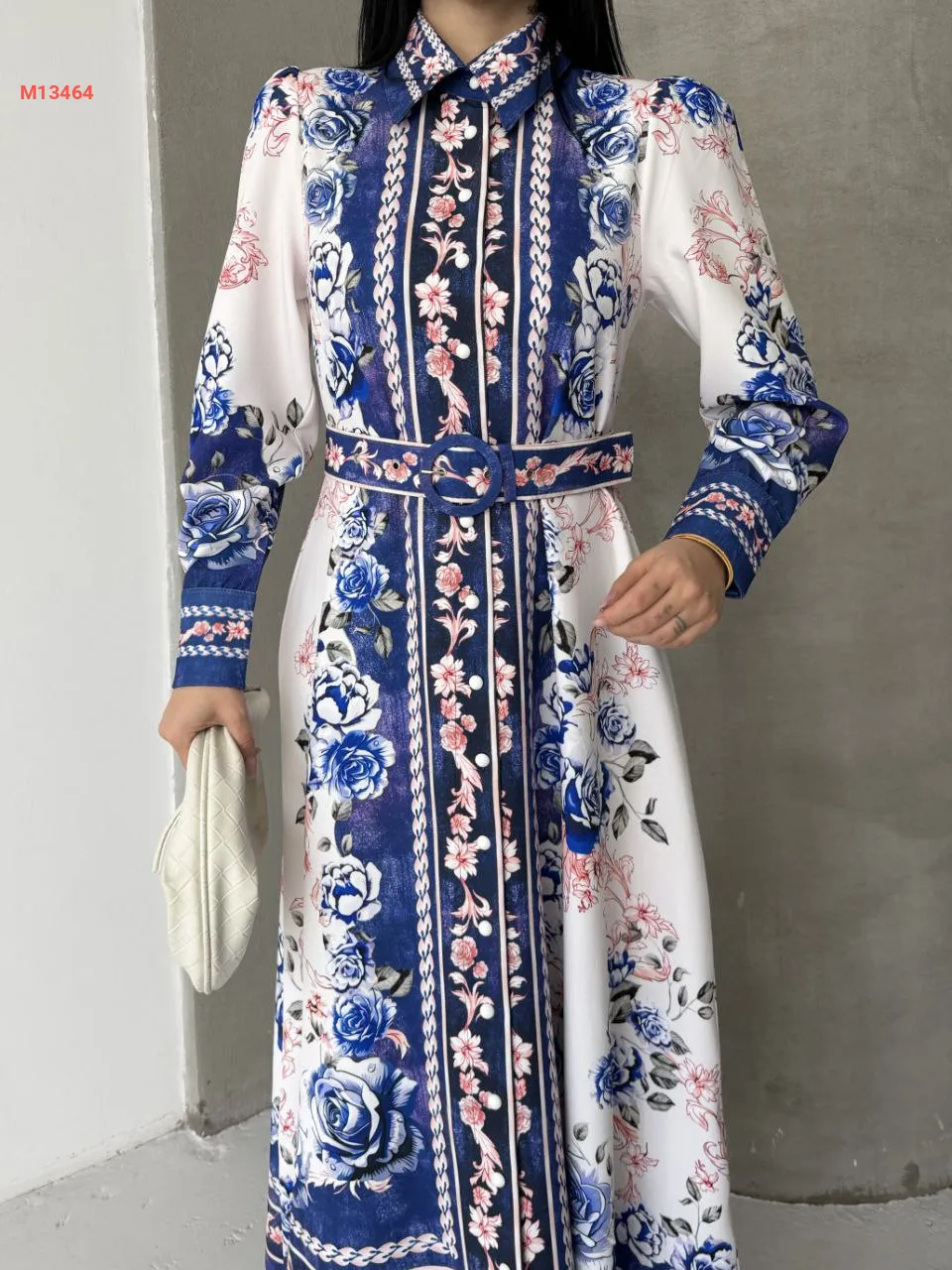 فستان طويل منقوش بأزرار وحزام