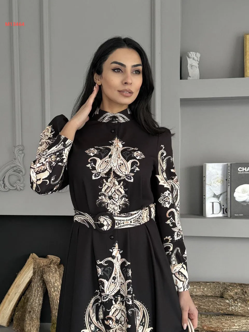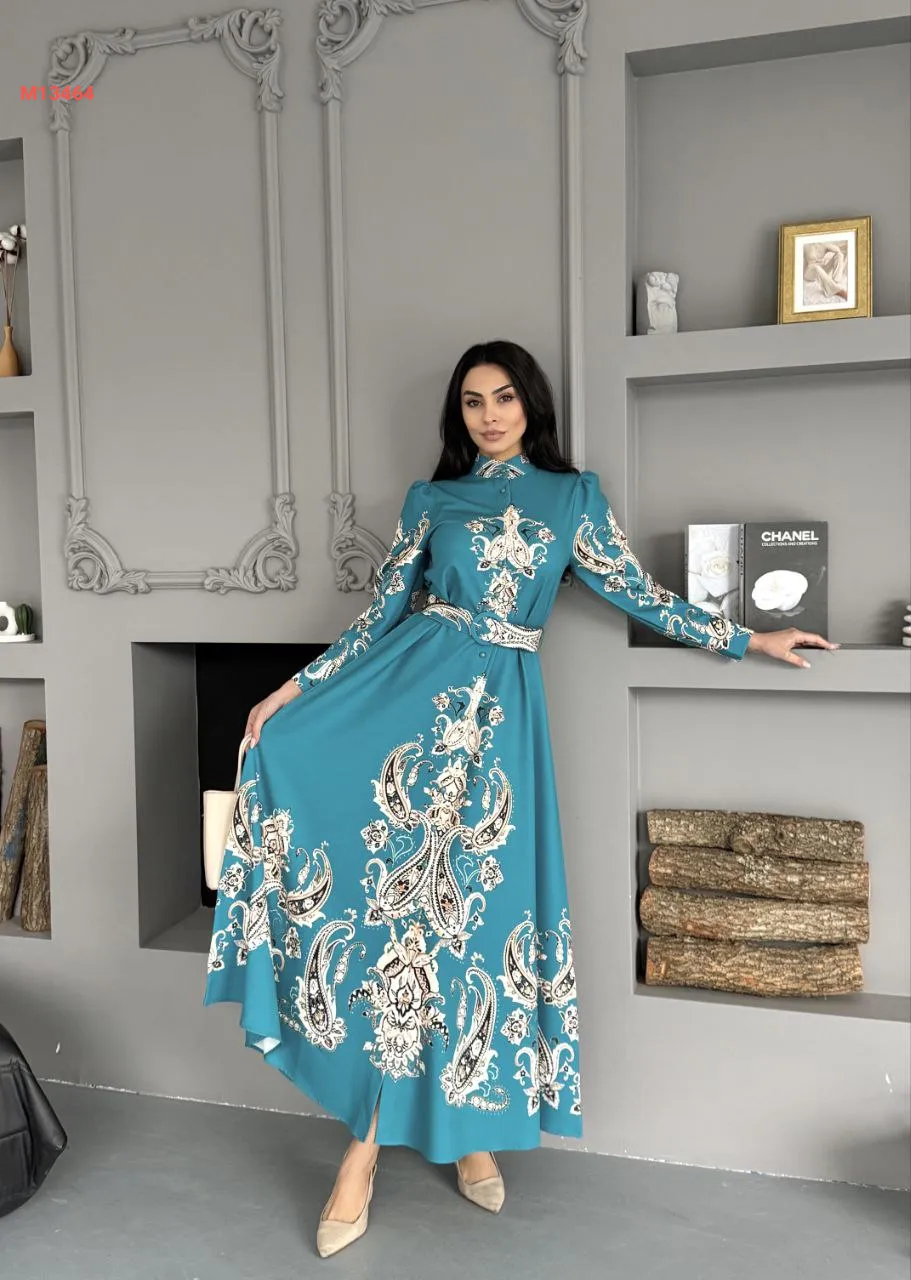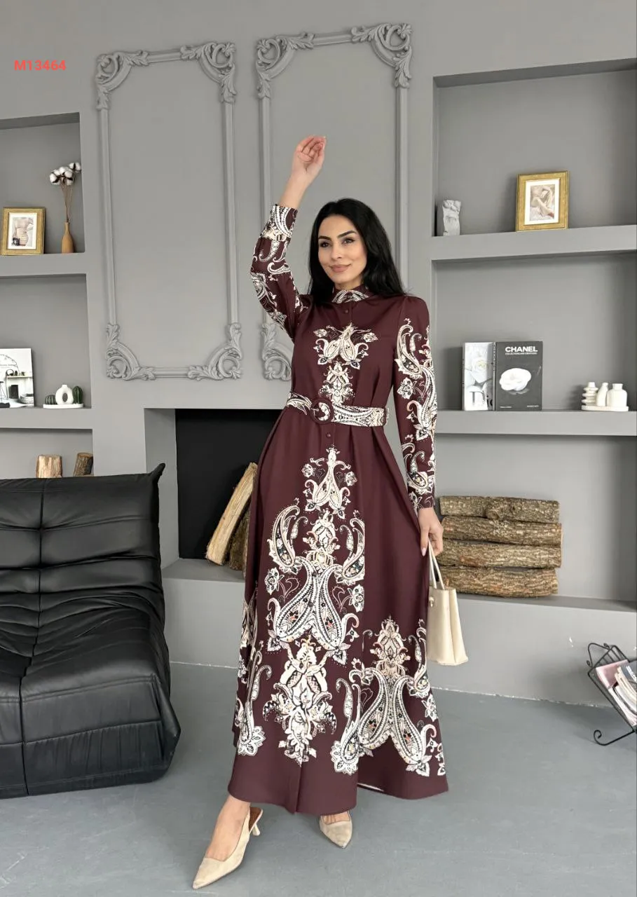 فستان طويل منقوش بأزرار