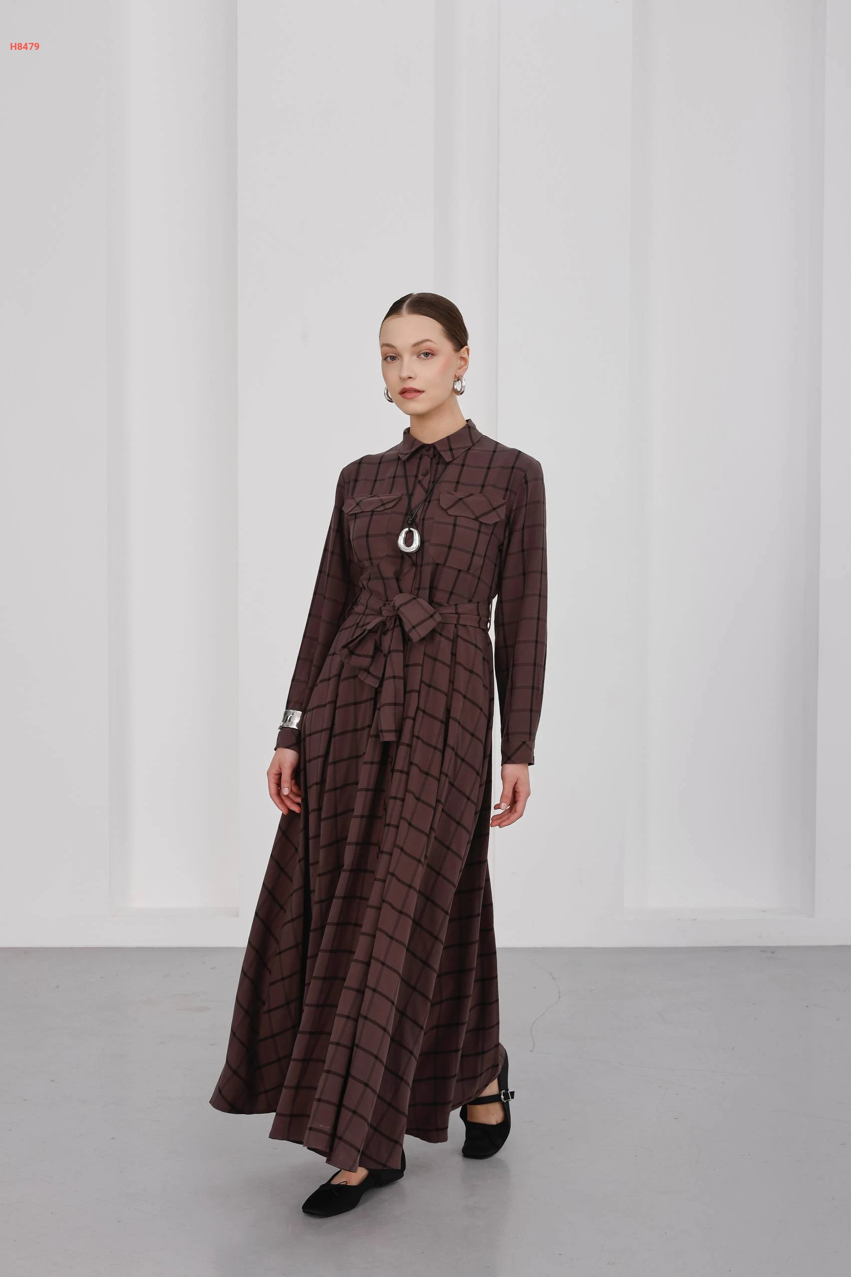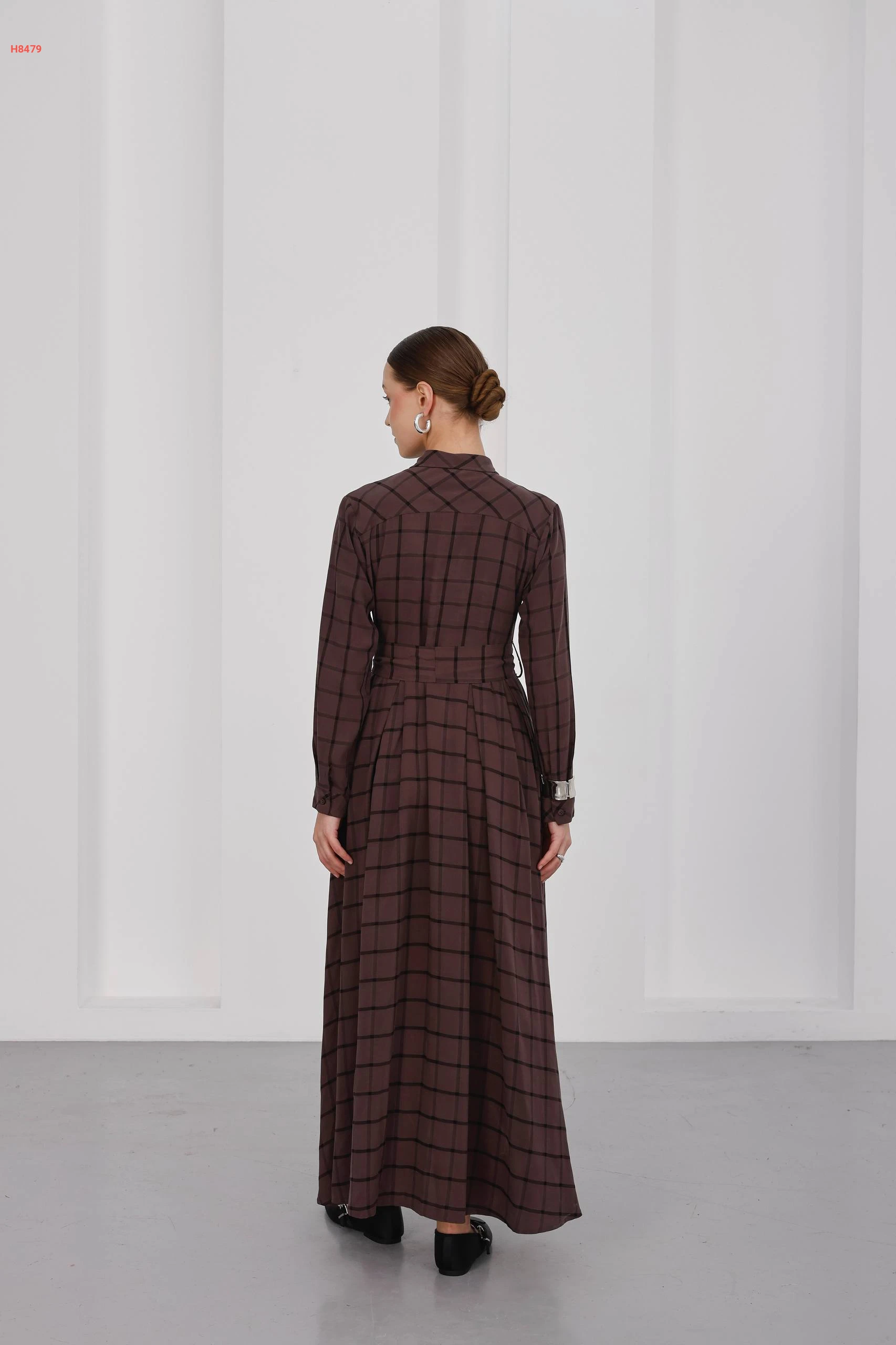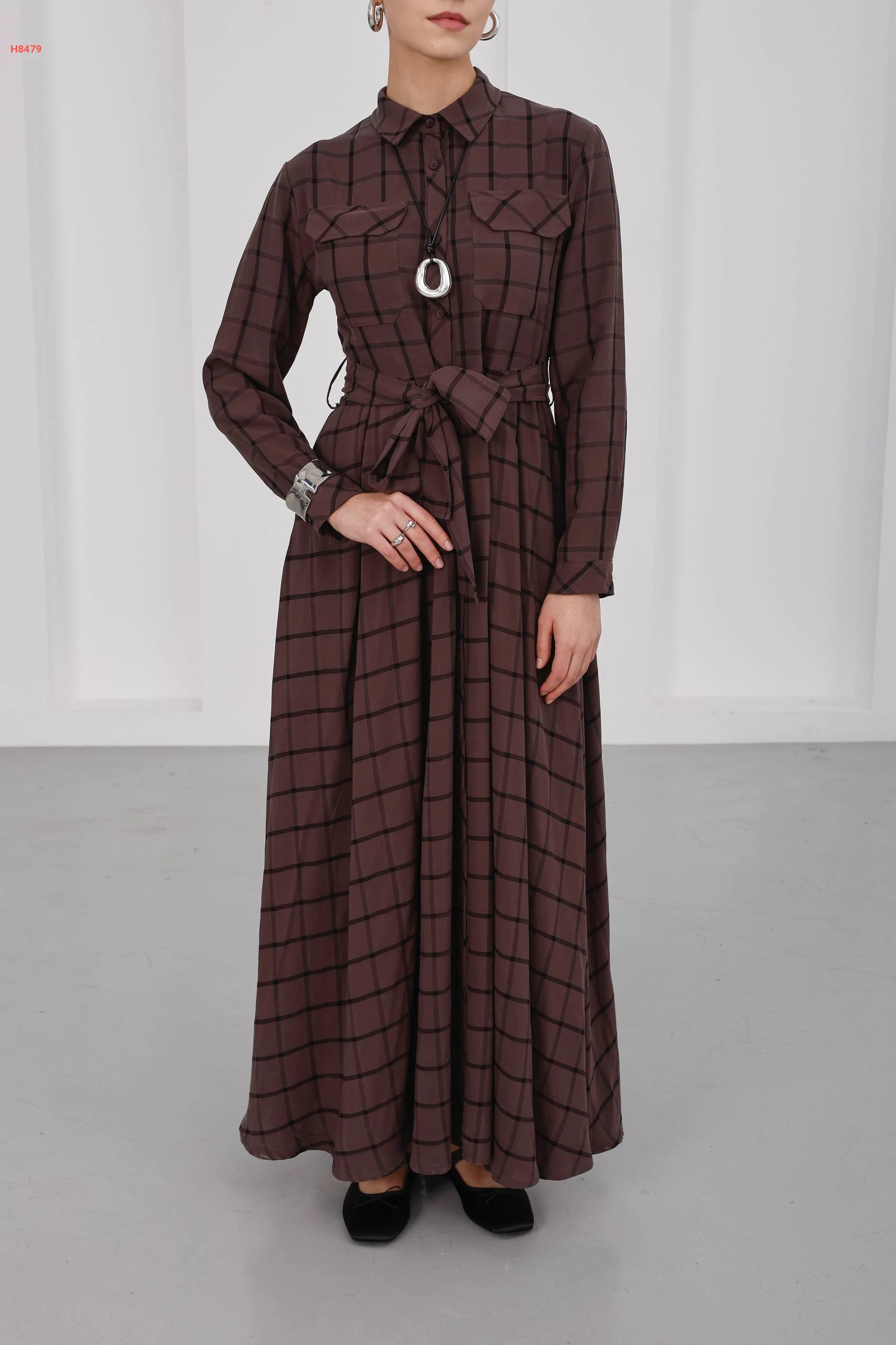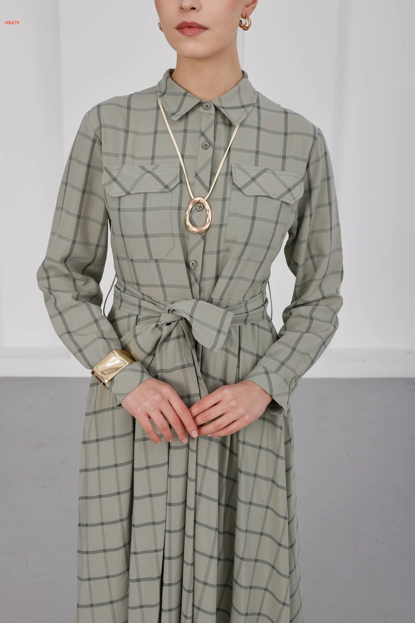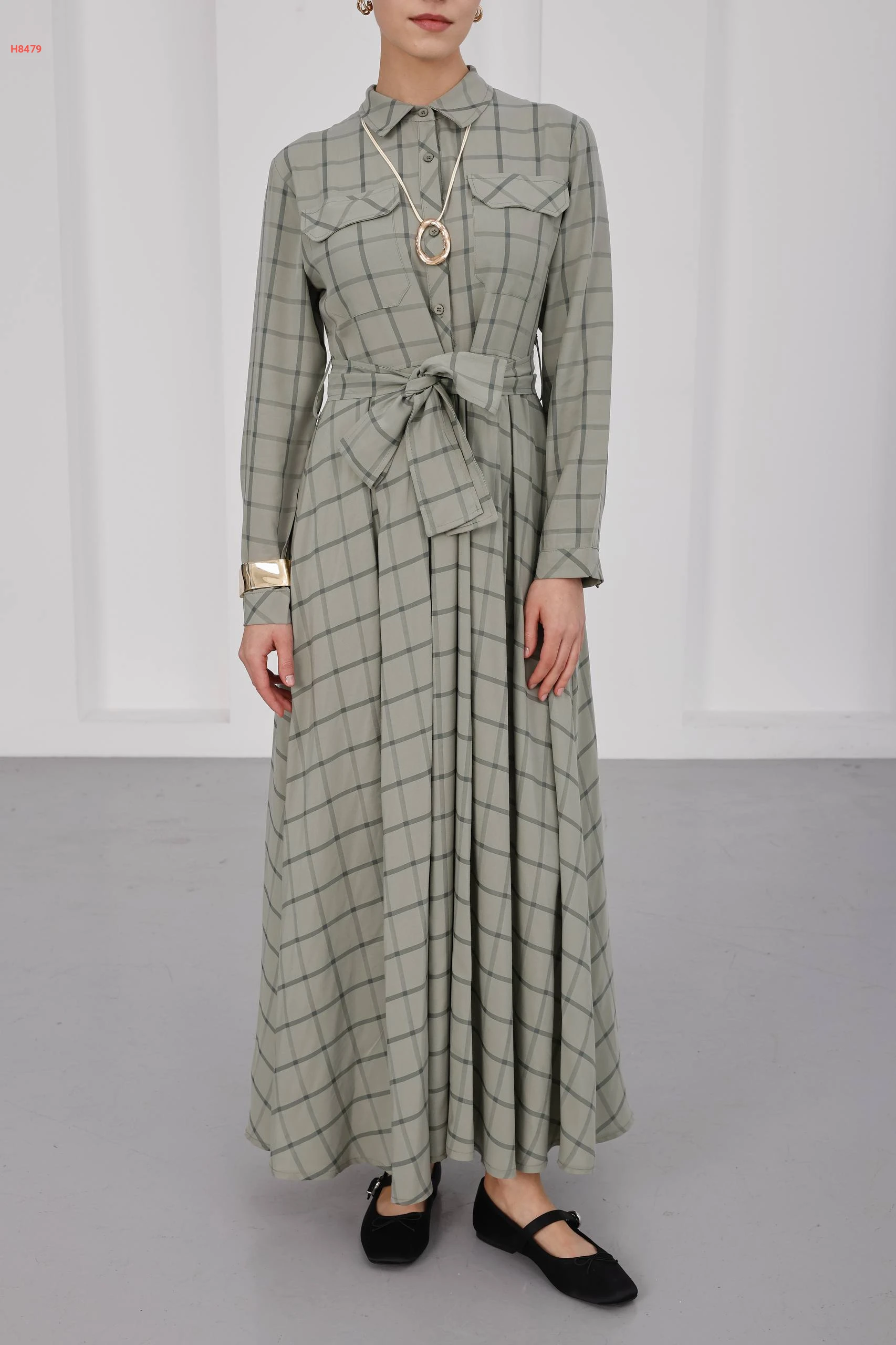 فستان كاروهات طويل بأزرار مع ربطة خصر