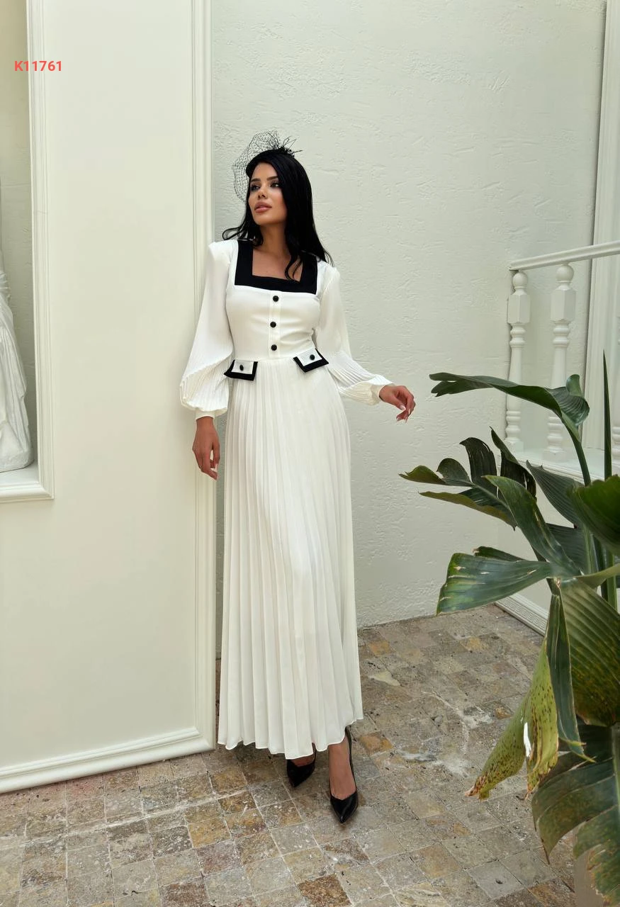 فستان طويل بليسيه لونين مزين أزرار