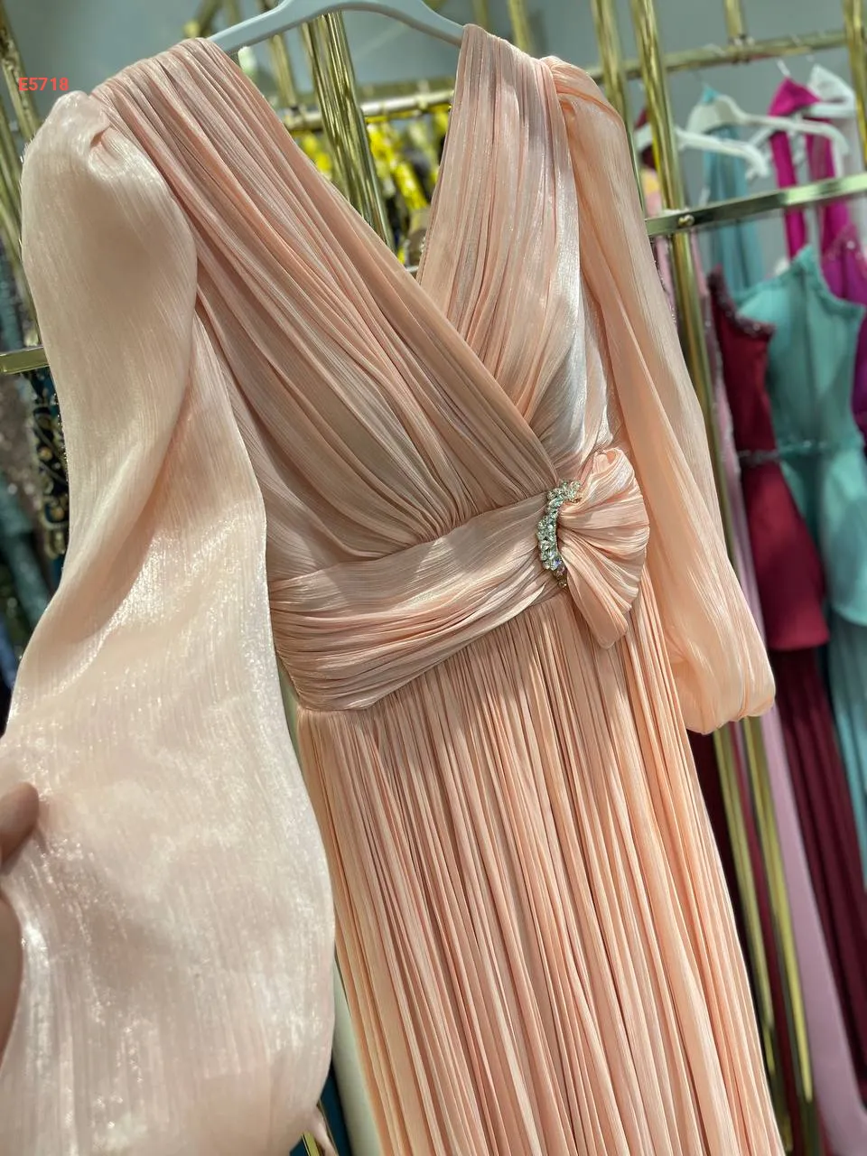فستان طويل بليسيه بإبزيم وأكمام بالونية