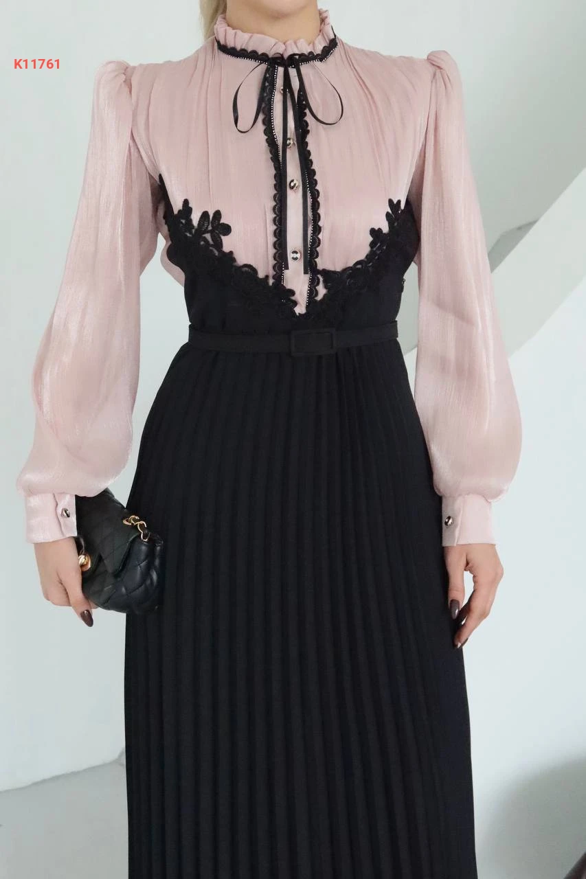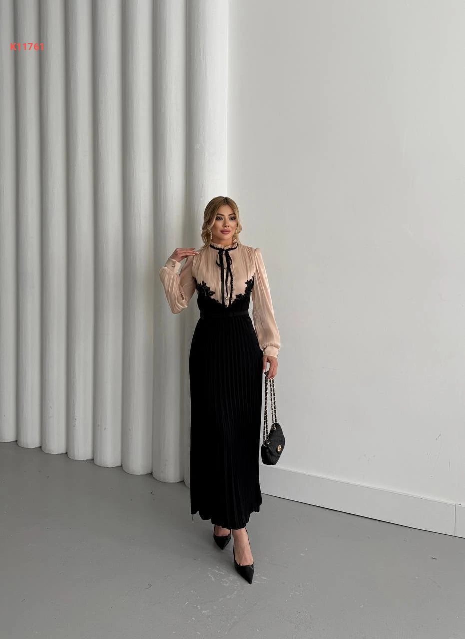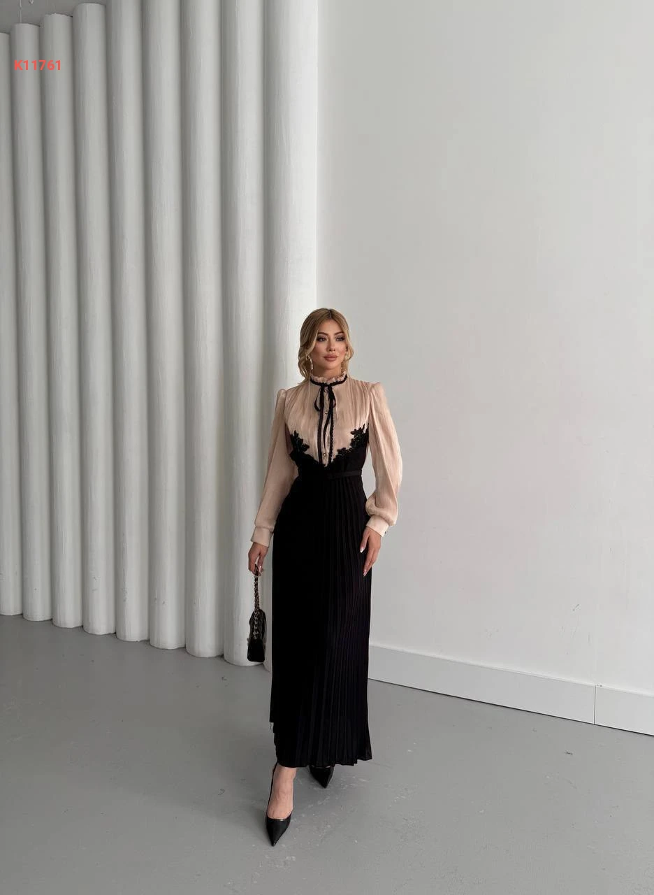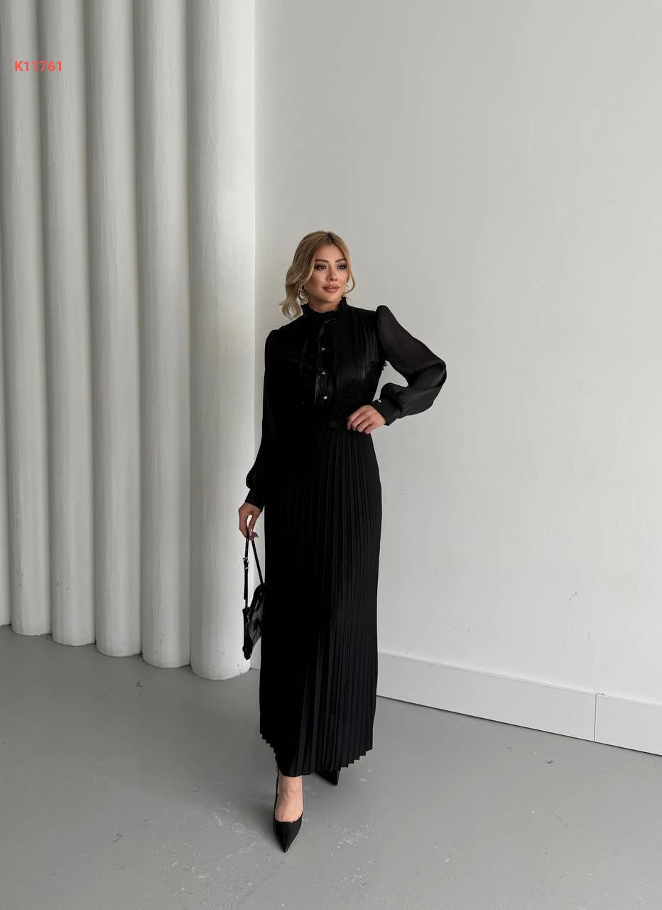فستان طويل بليسيه بأزرار نصفية