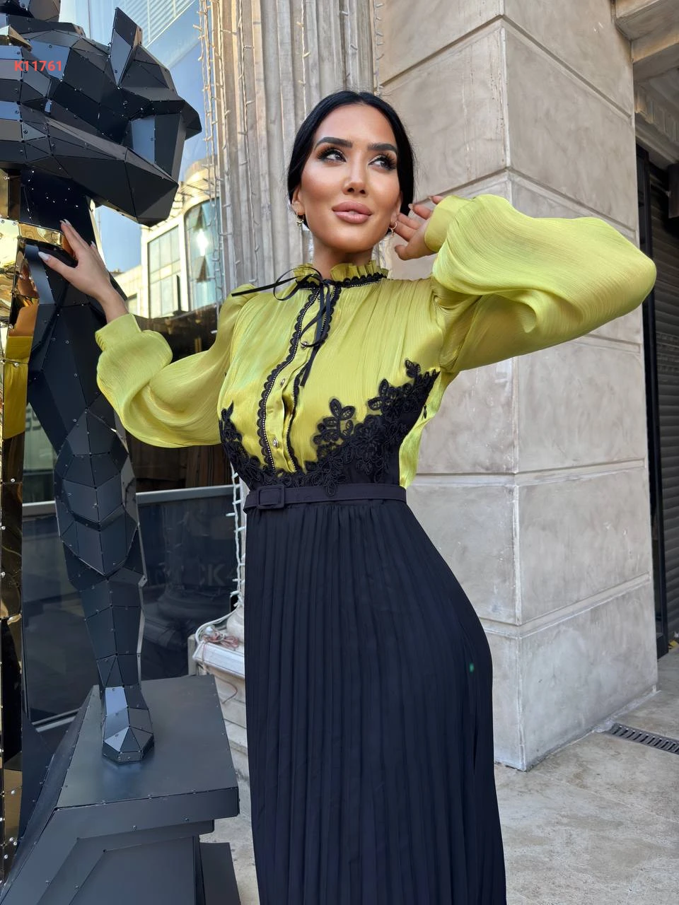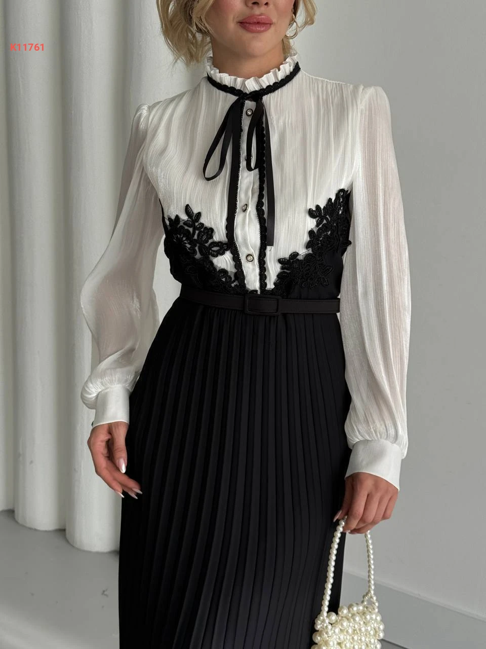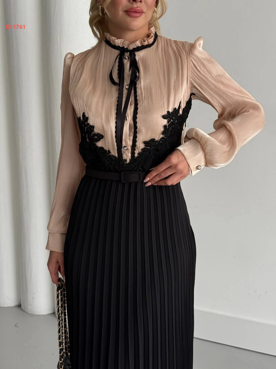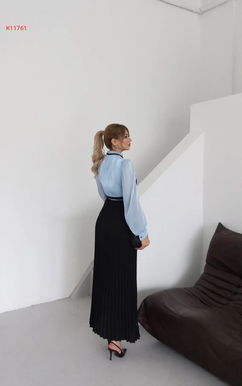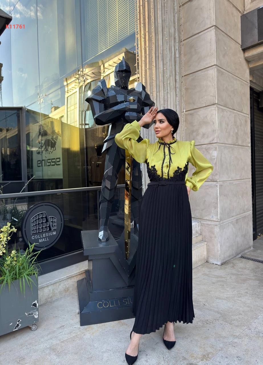 فستان طويل بليسيه بأزرار نصفية