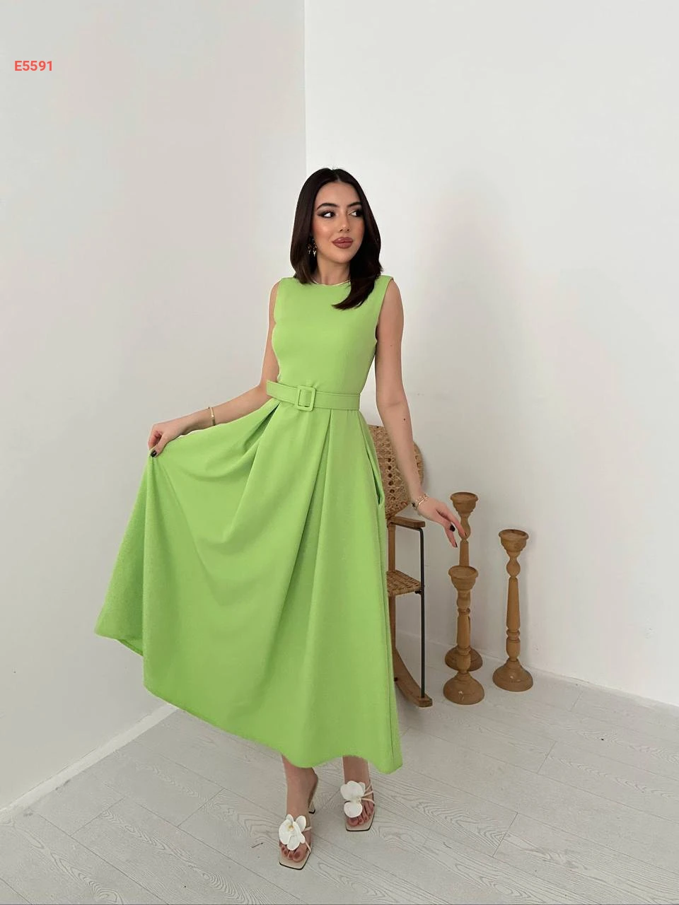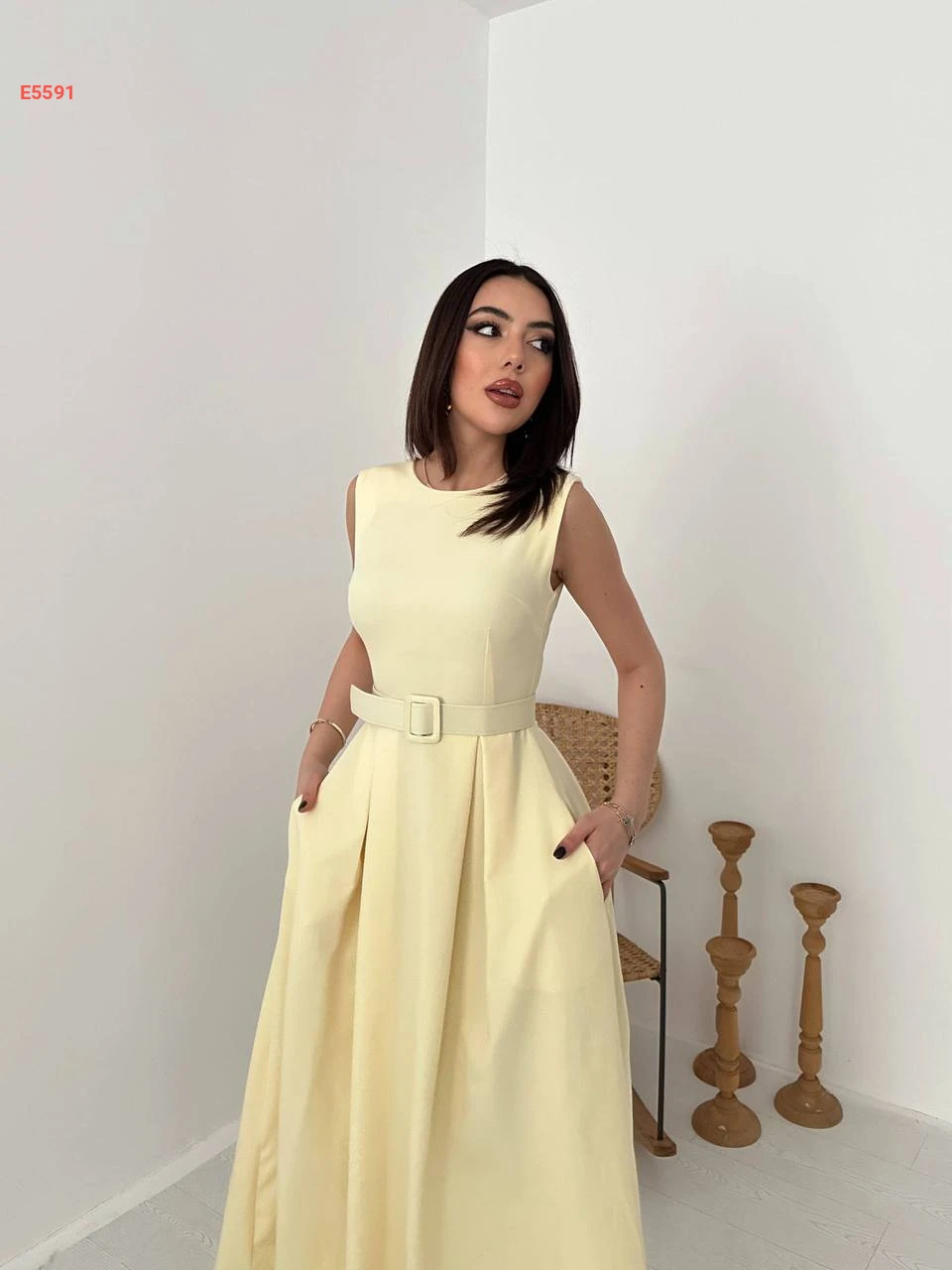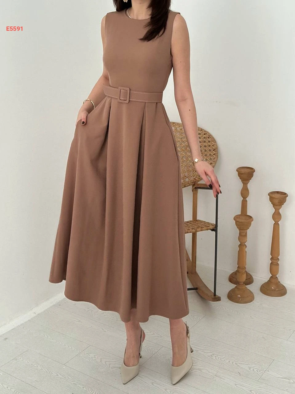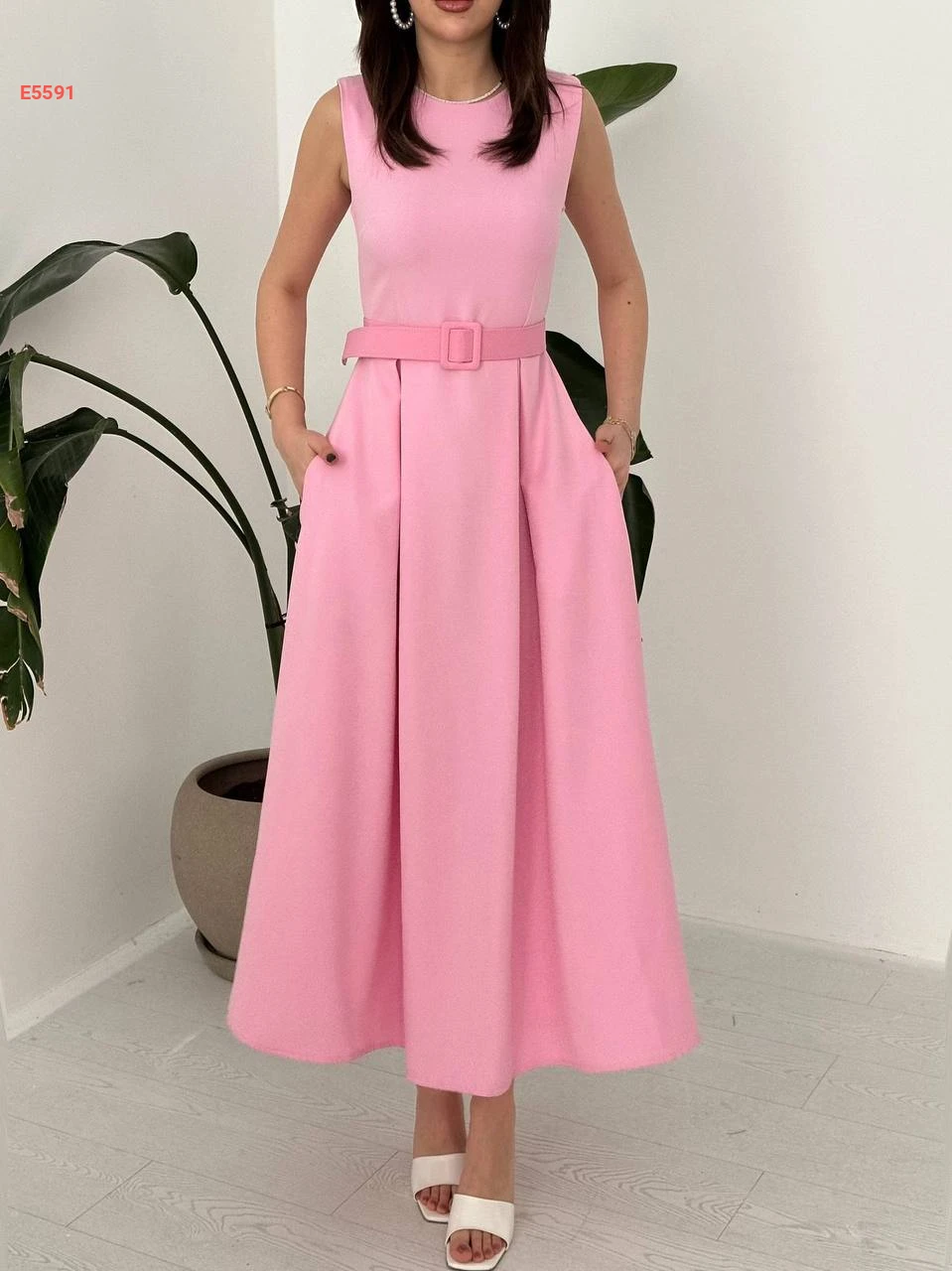فستان حفر طويل بطيات مع حزام
