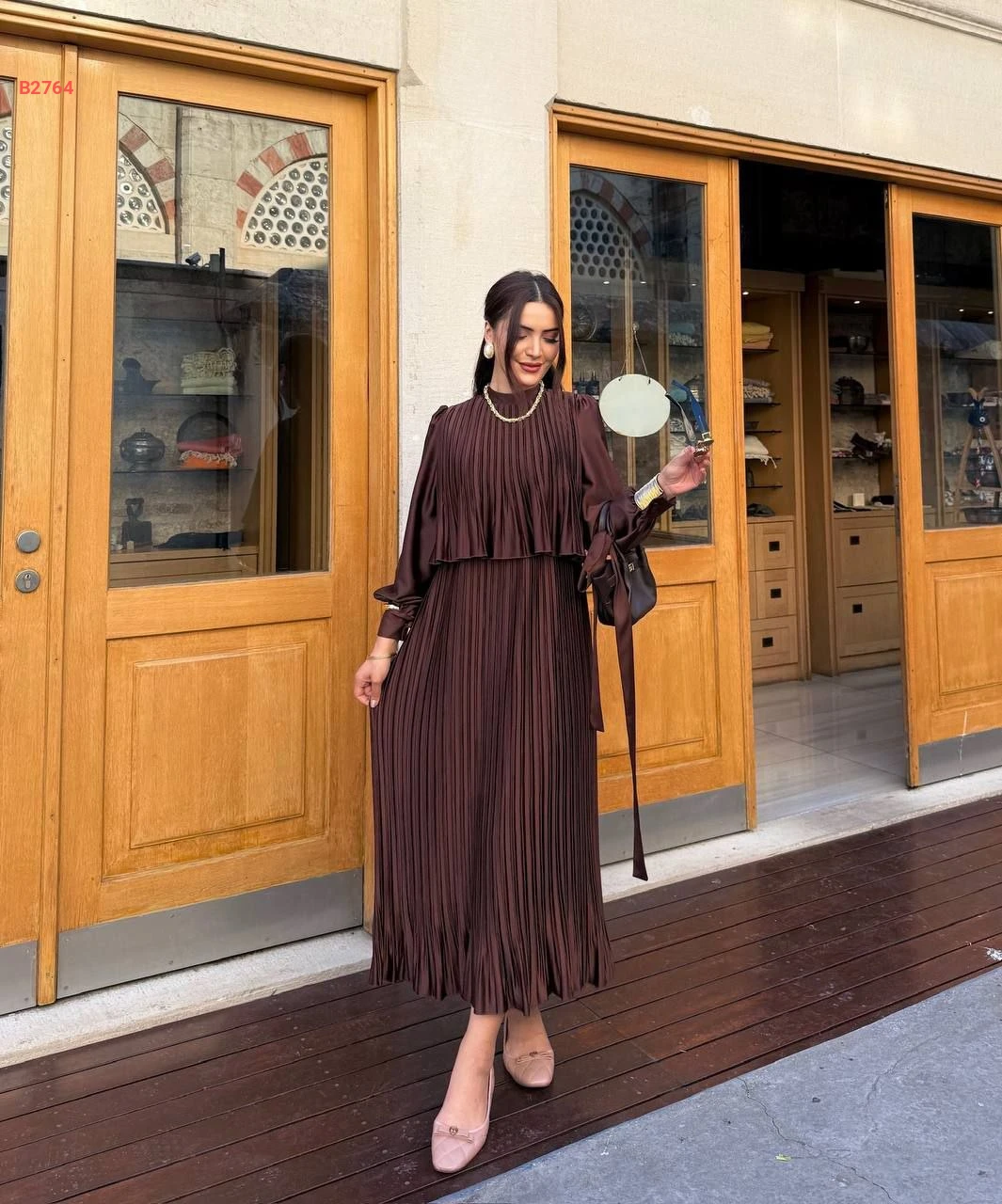 فستان طويل بليسيه (كسرات) من الساتان وأكمام طويلة