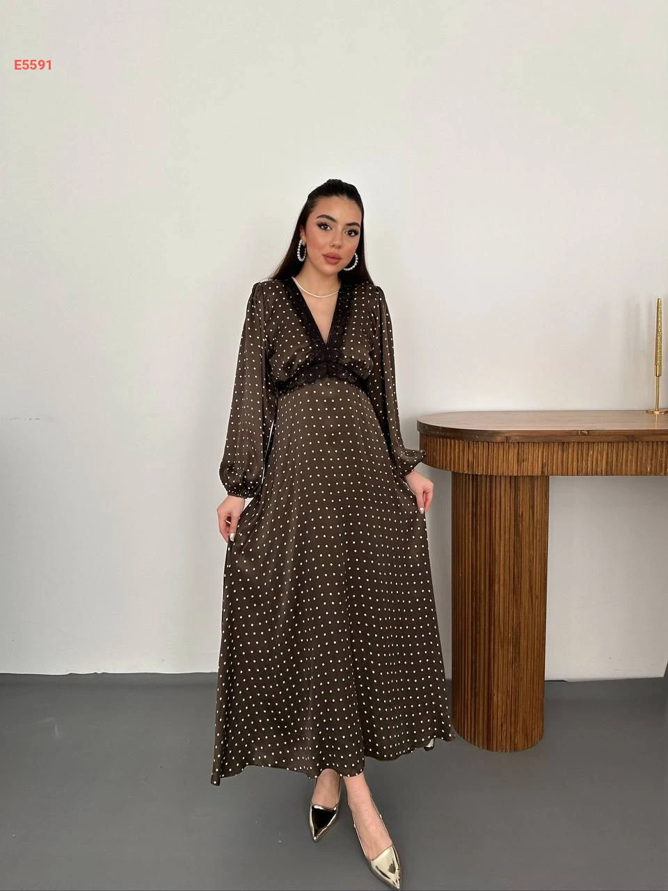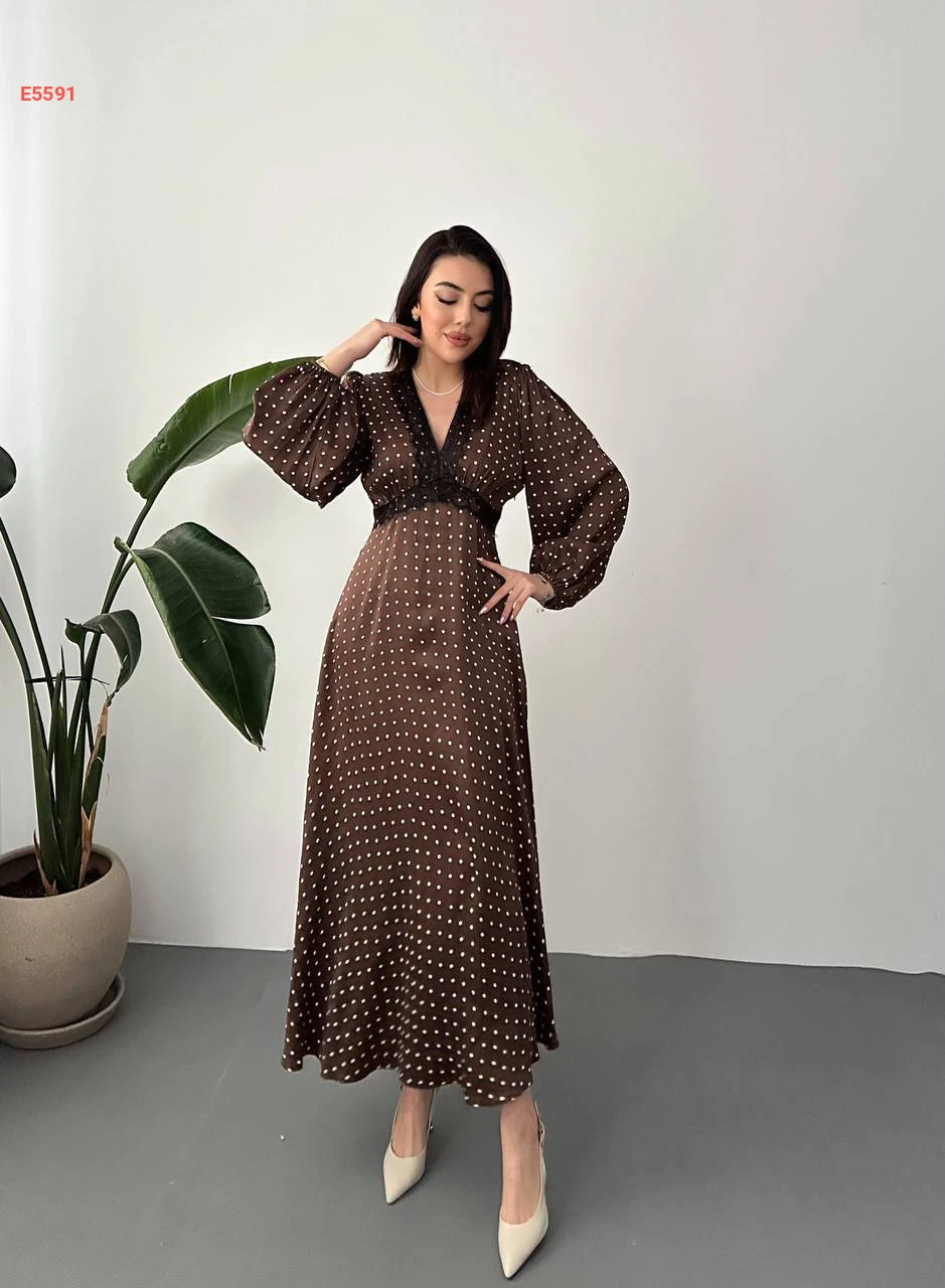 فستان طويل ساتان منقط قبة v