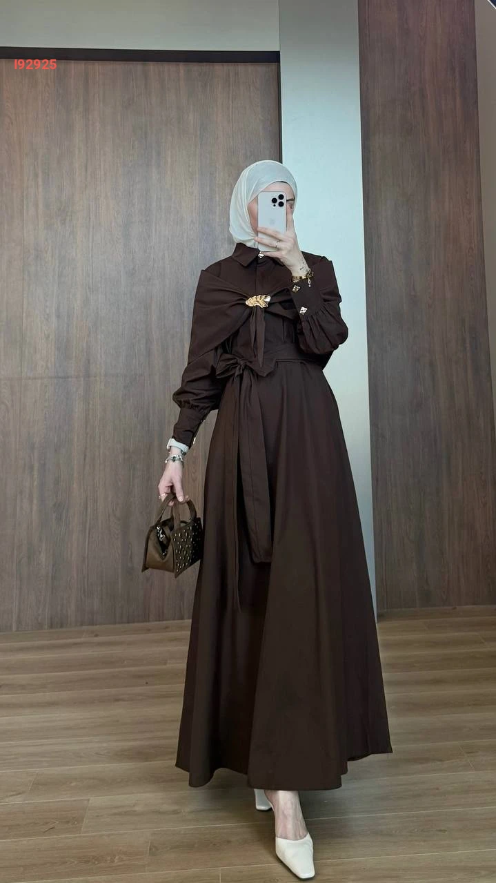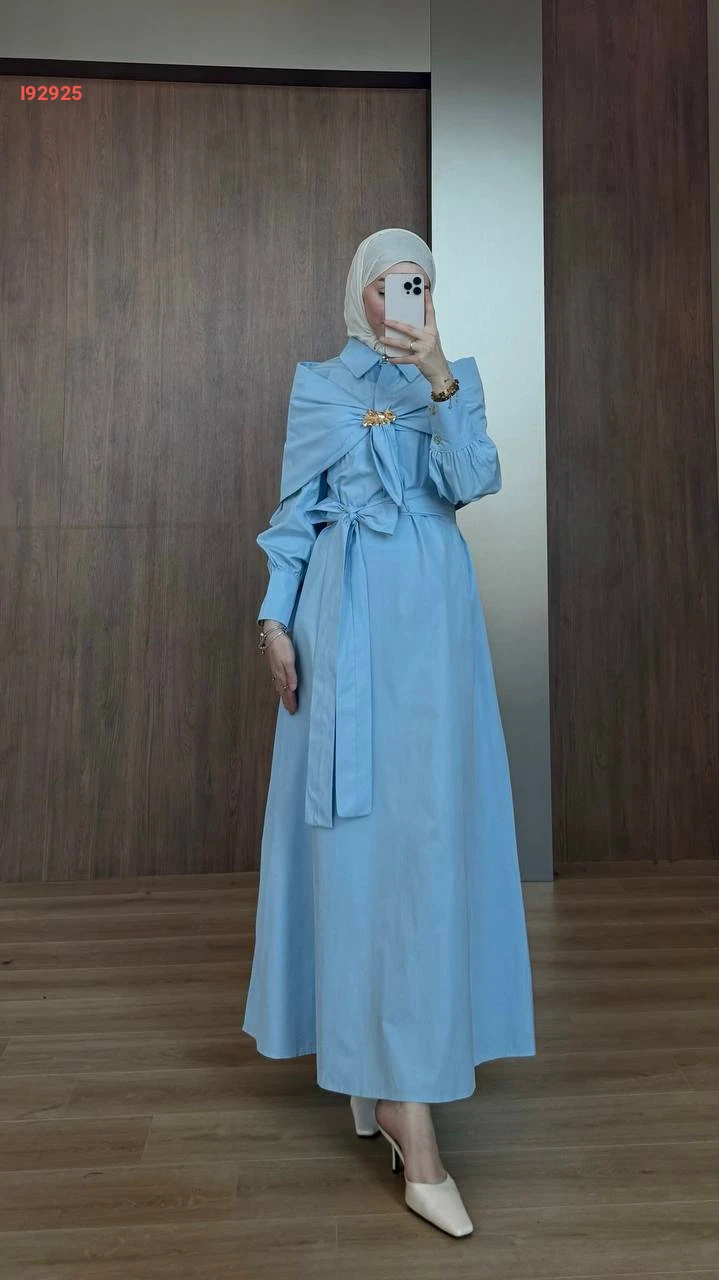 فستان طويل بوبلين مع فولار وبروش