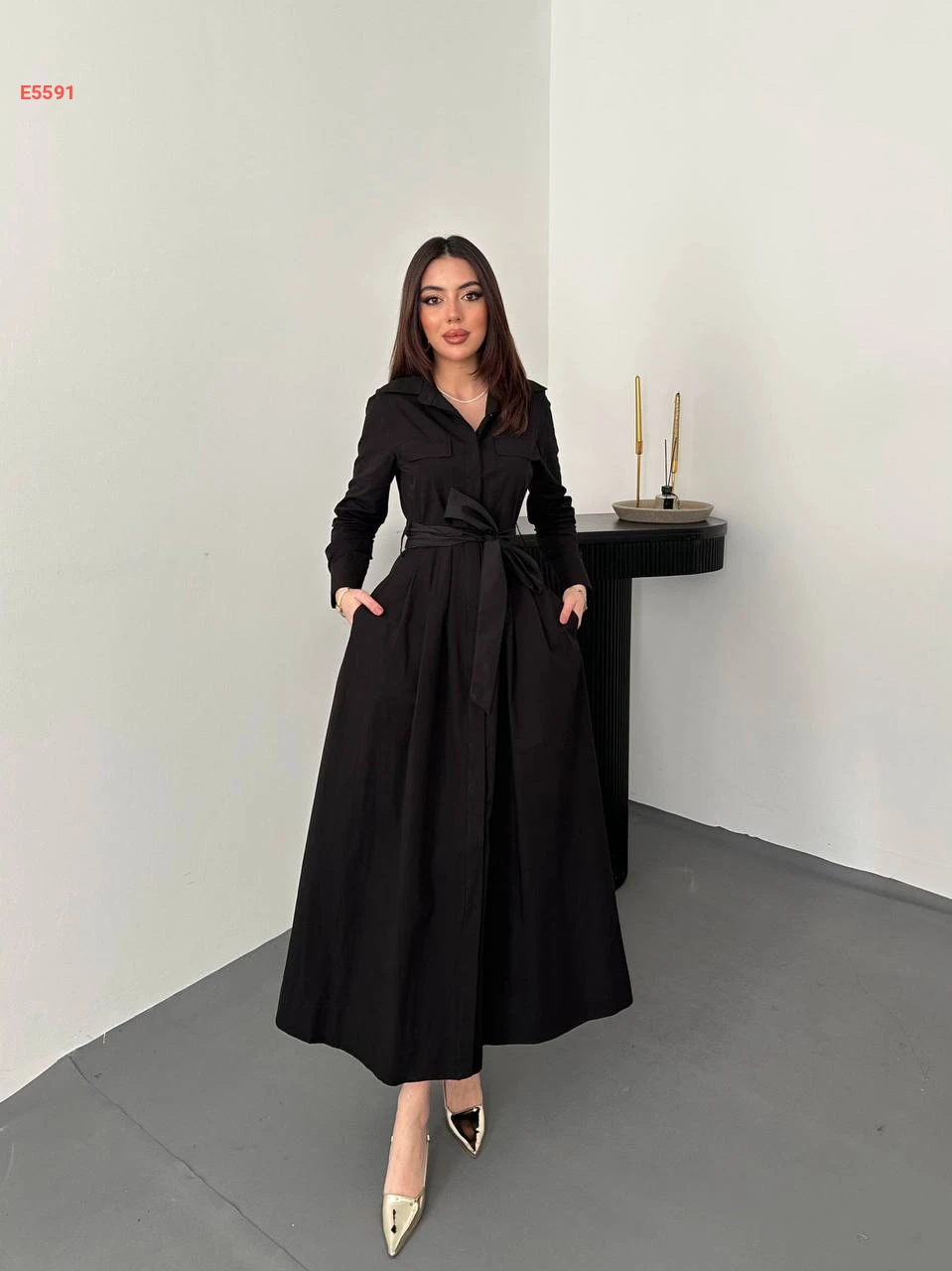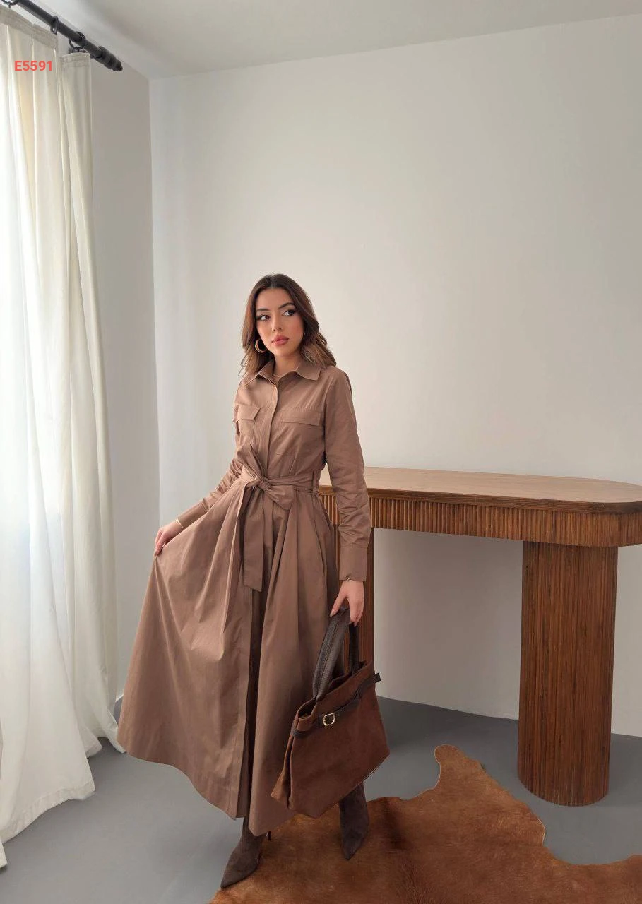 فستان بوبلين طويل بأزرار وجيوب