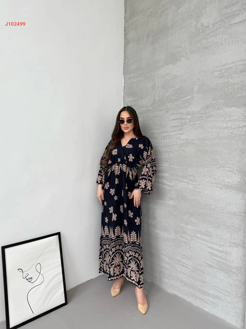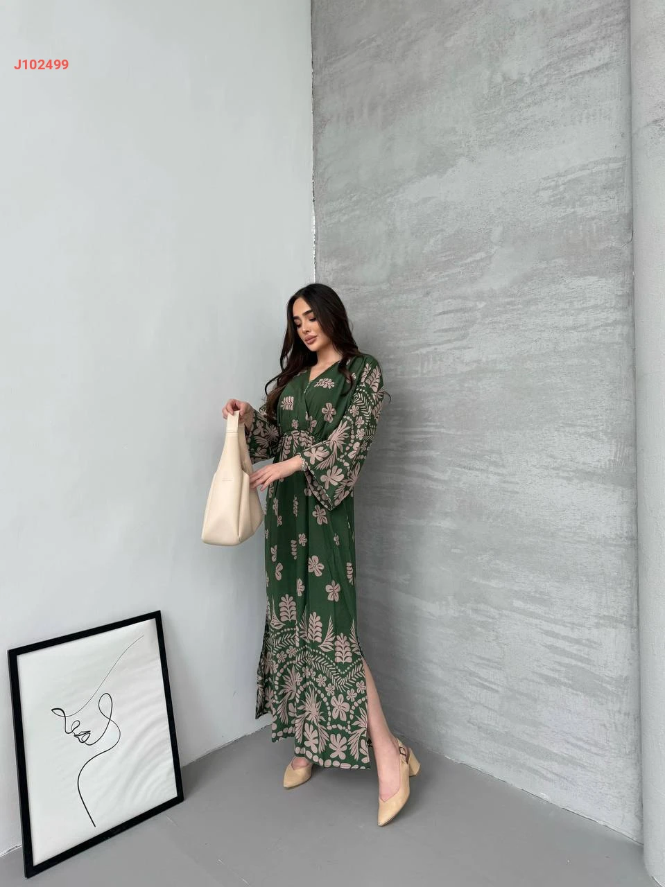 فستان طويل منقوش بفتحات جانبية