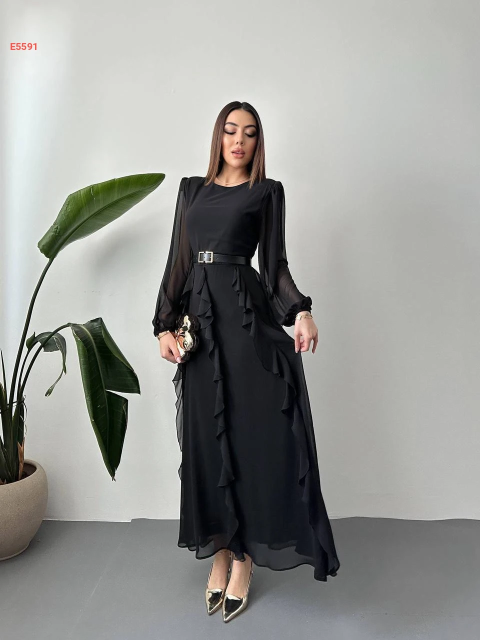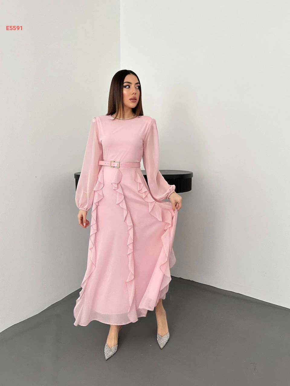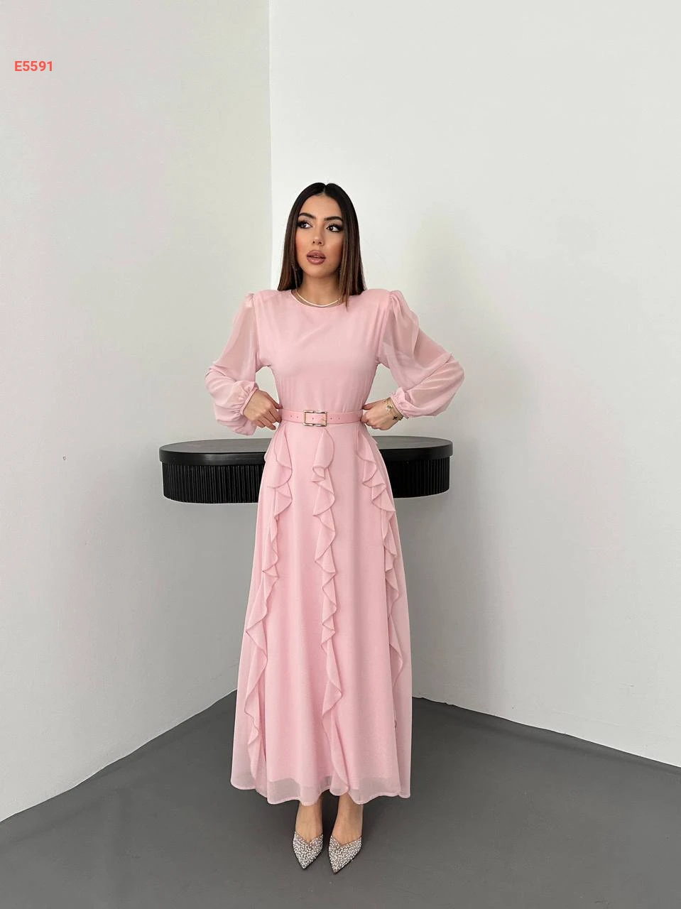 فستان طويل شيفون كشكش مع حزام