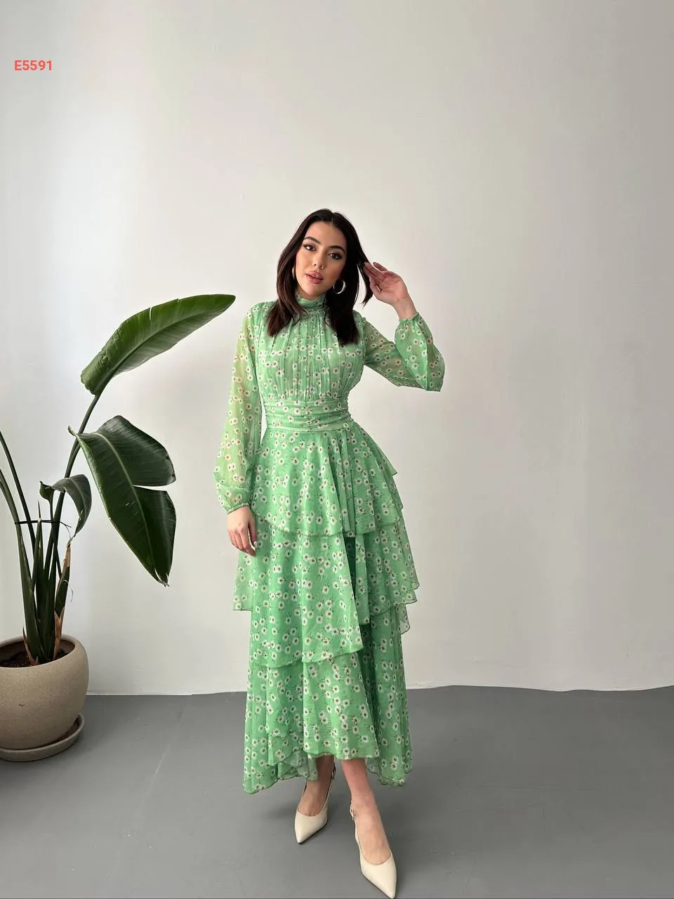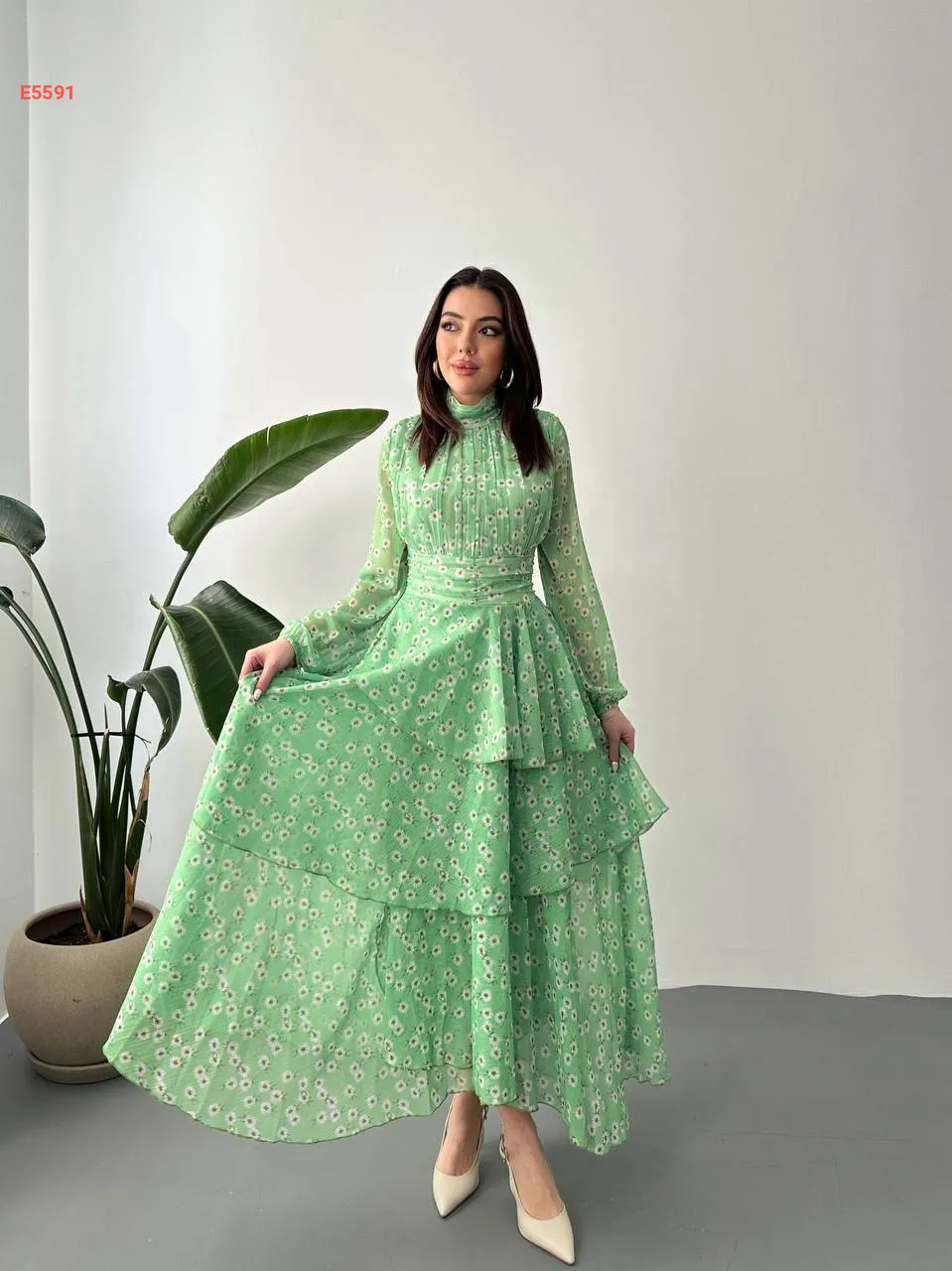 فستان شيفون طويل كشكش منقوش ورد